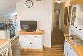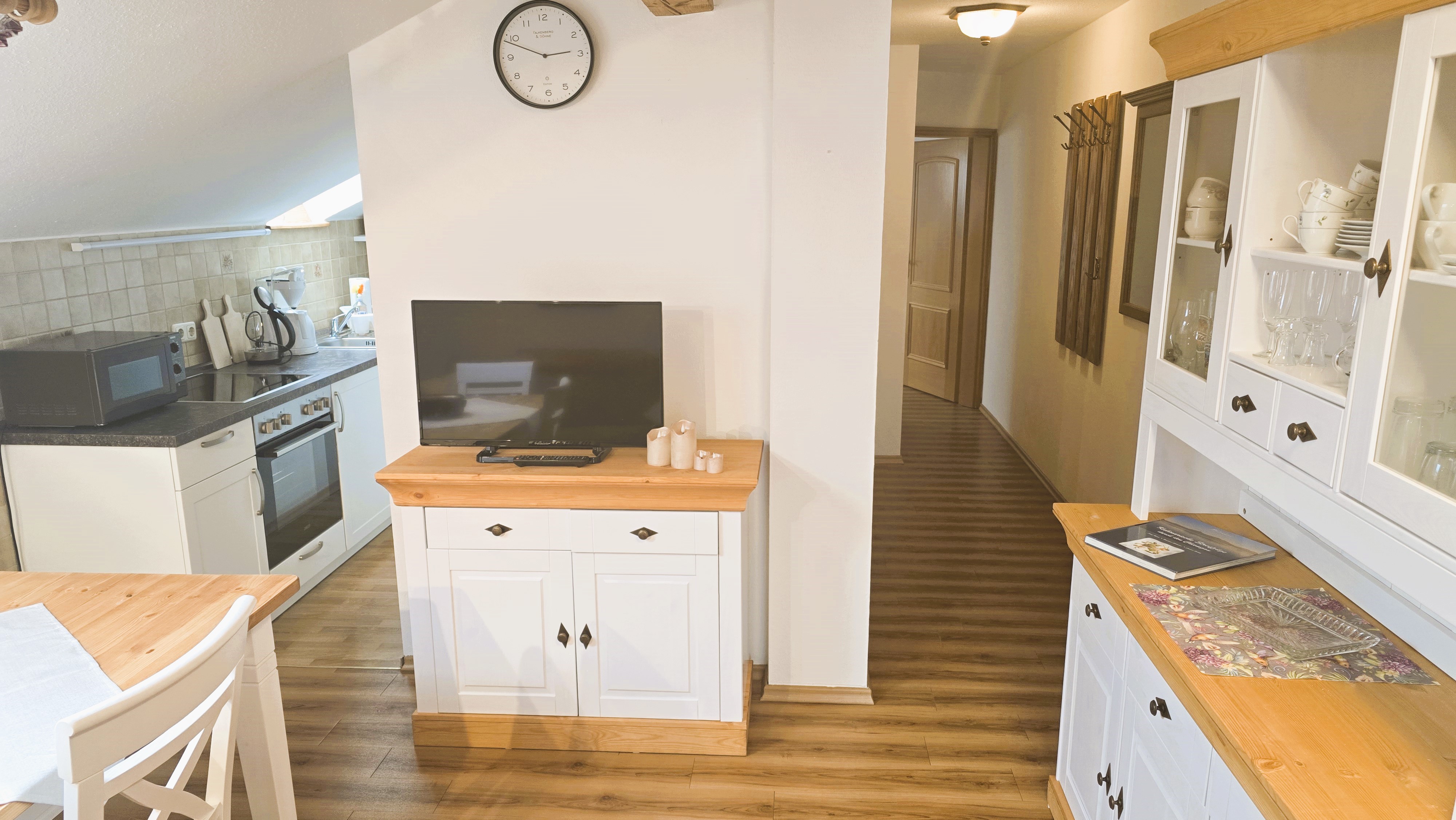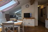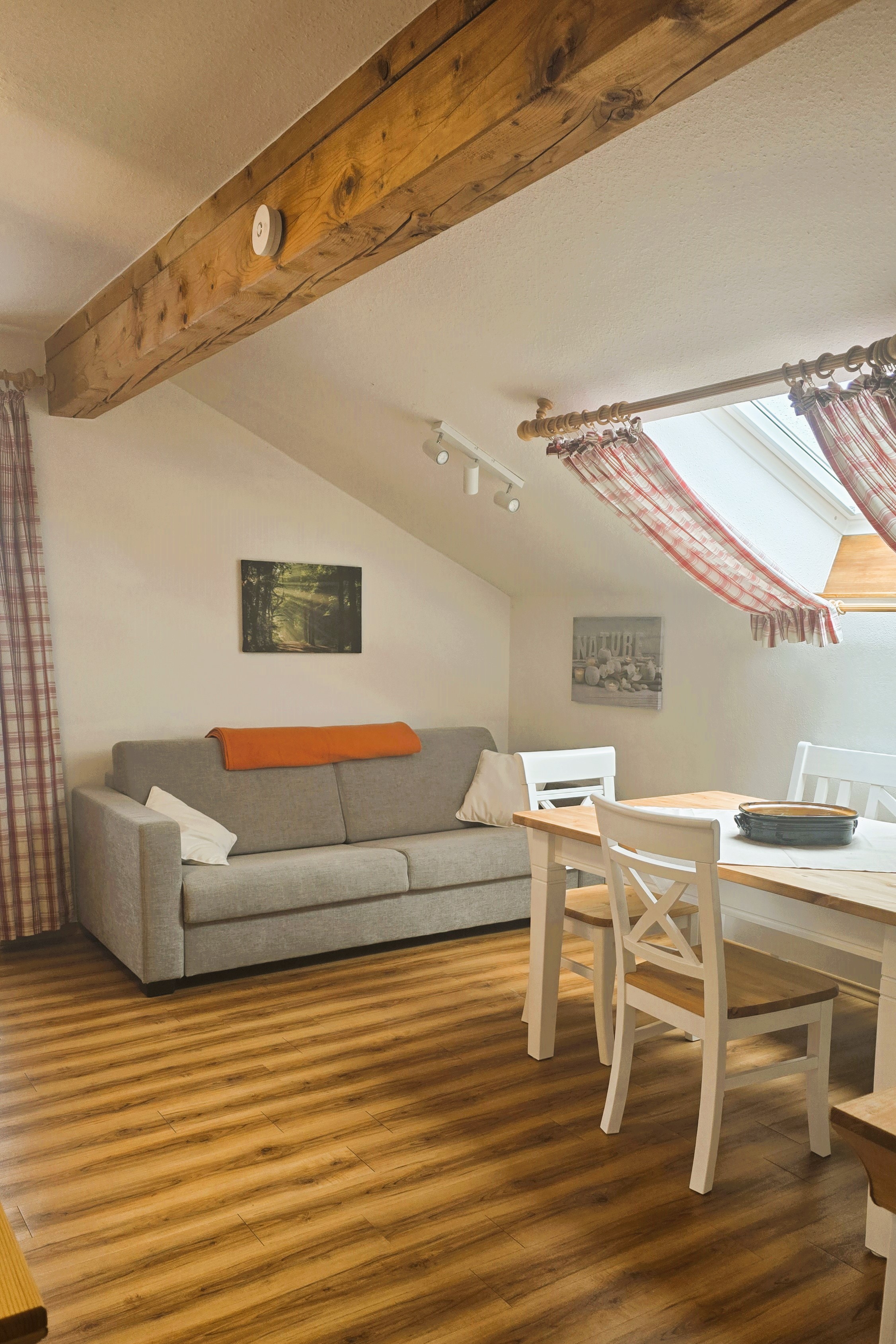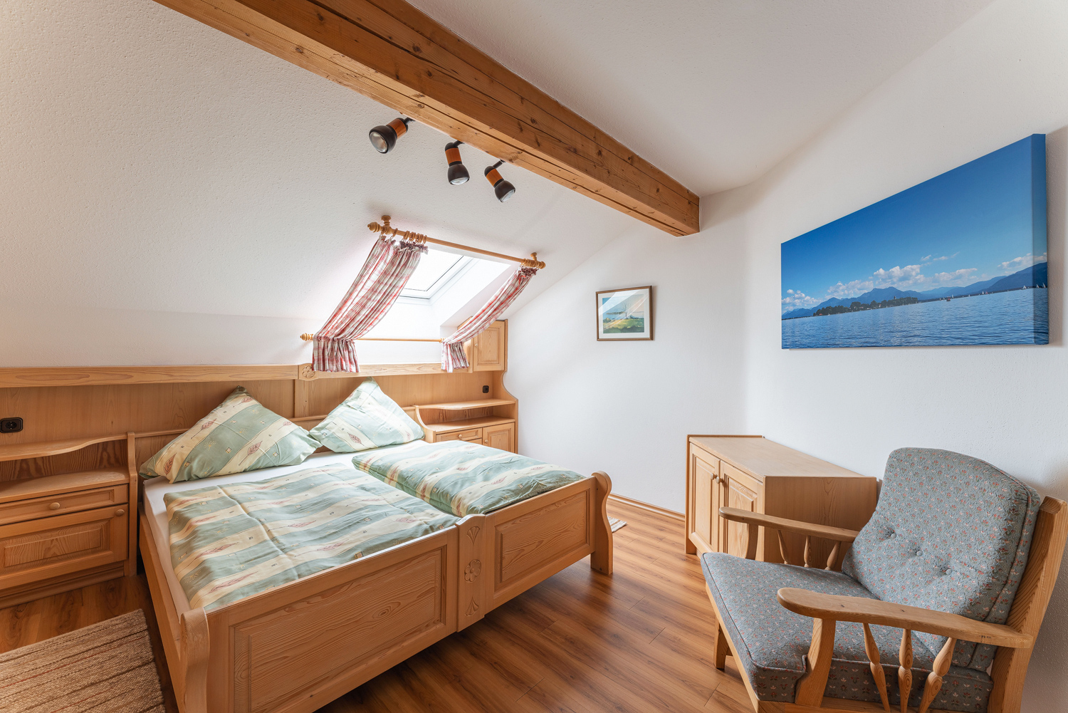 Sie sind romantisch veranlagt? Dann buchen Sie unsere Wohnung Hochfelln. Sie betreten die Wohnung und befinden sich gleich im Wohnbereich, mit typisch bayerischen Kanapee, das ausziehbar ist und so zwei Zusatz-Schlafplätze bietet. Die Eckbank mit Eßtisch ist ebenfalls typisch bayerisch! Hier steht auch ein großer TV-Flatscrene-Fernseher mit Bluerayplayer. Ein großes Dachflächenfenster lässt viel Licht und Sonne herein, vor allem, weil es nach Osten gerichtet ist. Hier haben Sie auch den Zugang zum extrabreiten Balkon (Norden), der überdacht ist und einen Balkontisch mit Stühlen für die Brotzeit bereit hält. Vom Wohnraum geht eine kleine Küchenzeile ab, mit zusätzlichen Dachfenster, die neben Herd und Spüle, Kühlschrank (mit Gefrierfach) und reichlich Geschirr, alles bietet, was man so für das Herrichten der Mahlzeiten so benötigt. Ein CD-Radio sorgt morgens für die gute Laune. Weiter geht es durch den Flur. Hier gehen das Duschbad und das separate WC ab. Schließlich betreten Sie das Schlafzimmer. Hier, wie in der ganzen Wohnung, wurde kürzlich ein heller, moderner Boden in Holzdekor verlegt. Das Schlafzimmer hat einen großen komfortablen Einbauschrank, das bequeme Doppelbett steht unter der Dachschräge. Direkt darüber eröffnet ein großes Dachflächenfenster den Blick auf die Sterne. Das Fenster läßt sich aber auch, zum Schutz vor der Sonne, mit einer Jalousie verdunkeln. Die Wohnung Hochfelln ist somit eine nette, romantische Wohnung, ideal für ein Paar, das sich Ruhe und Zweisamkeit wünscht.