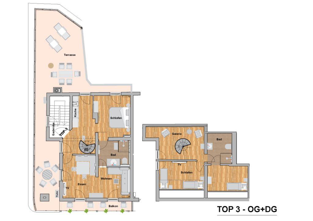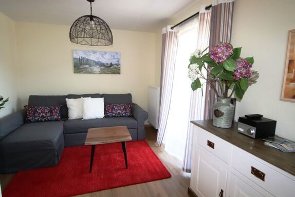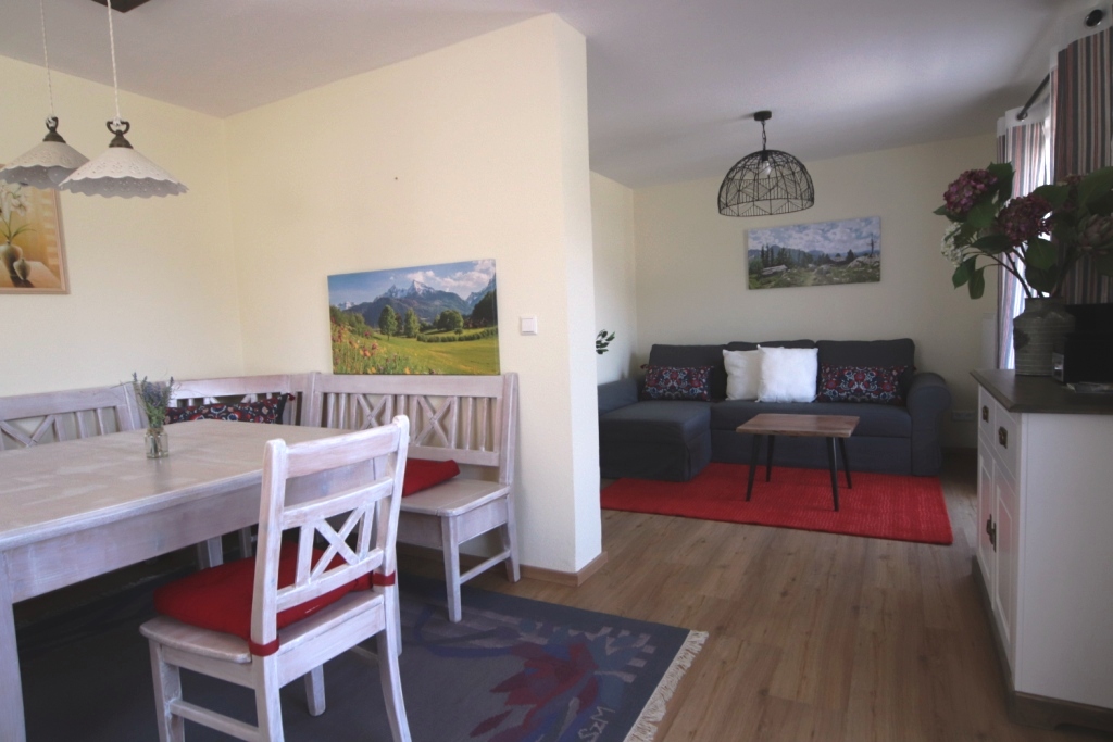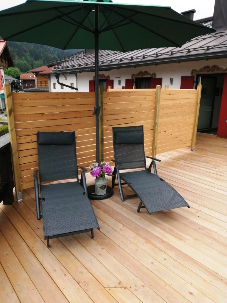Diese Wohnung erstreckt sich über zwei Stockwerke. Sie hat morgens einen Balkon mit Morgensonne und ab mittags eine wunderschöne Sonnenterasse mit Blick in die Berge. Die Schlafzimmer sind sehr ruhig gelegen. Das hochwertig ausgestattete Bad ist direkt über das Schlafzimmer erreichbar. Mit der Eckbank ist der Essbereich richtig gemütlich. Flach-TV mit einem Netflix Zugang pro Wohnung sind verfügbar.
