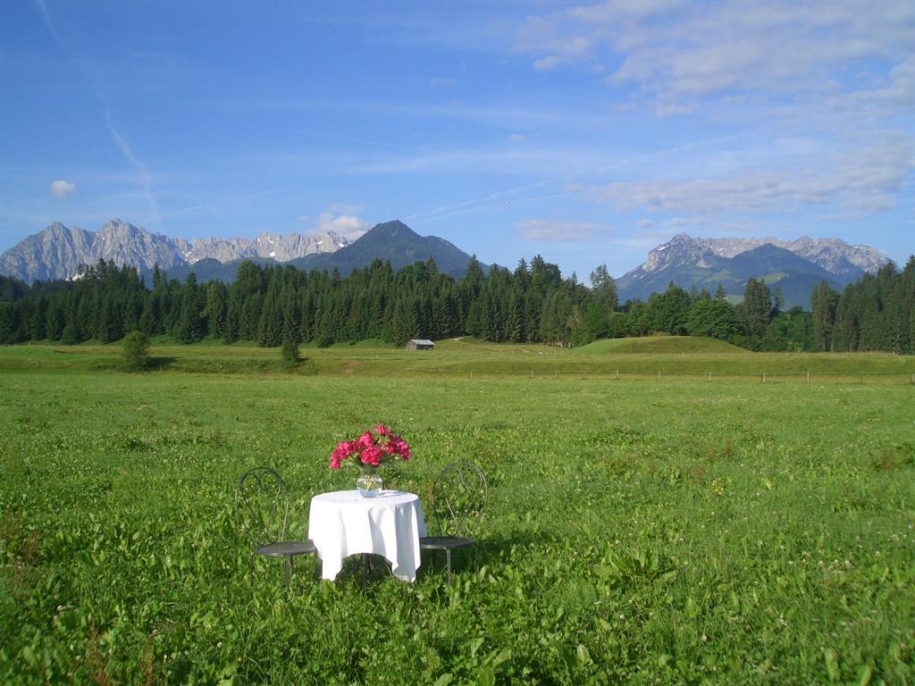 Sonnige, ruhige Lage am Rande des Dorfzentrums mit herrlichem Blick auf das Kaisergebirge und den Unterberg. Wir bieten Ihnen gemütliche Doppelzimmer oder Dreibettzimmer mit DU/WC, TV, Südbalkon , Reichhaltiges Frühstück mit hausgemachten Spezialitäten der Region (ausgenommen Ferienwohnung), gemütlicher Frühstücks und Aufenthaltsraum mit Teeküche und Kühlschrank,