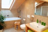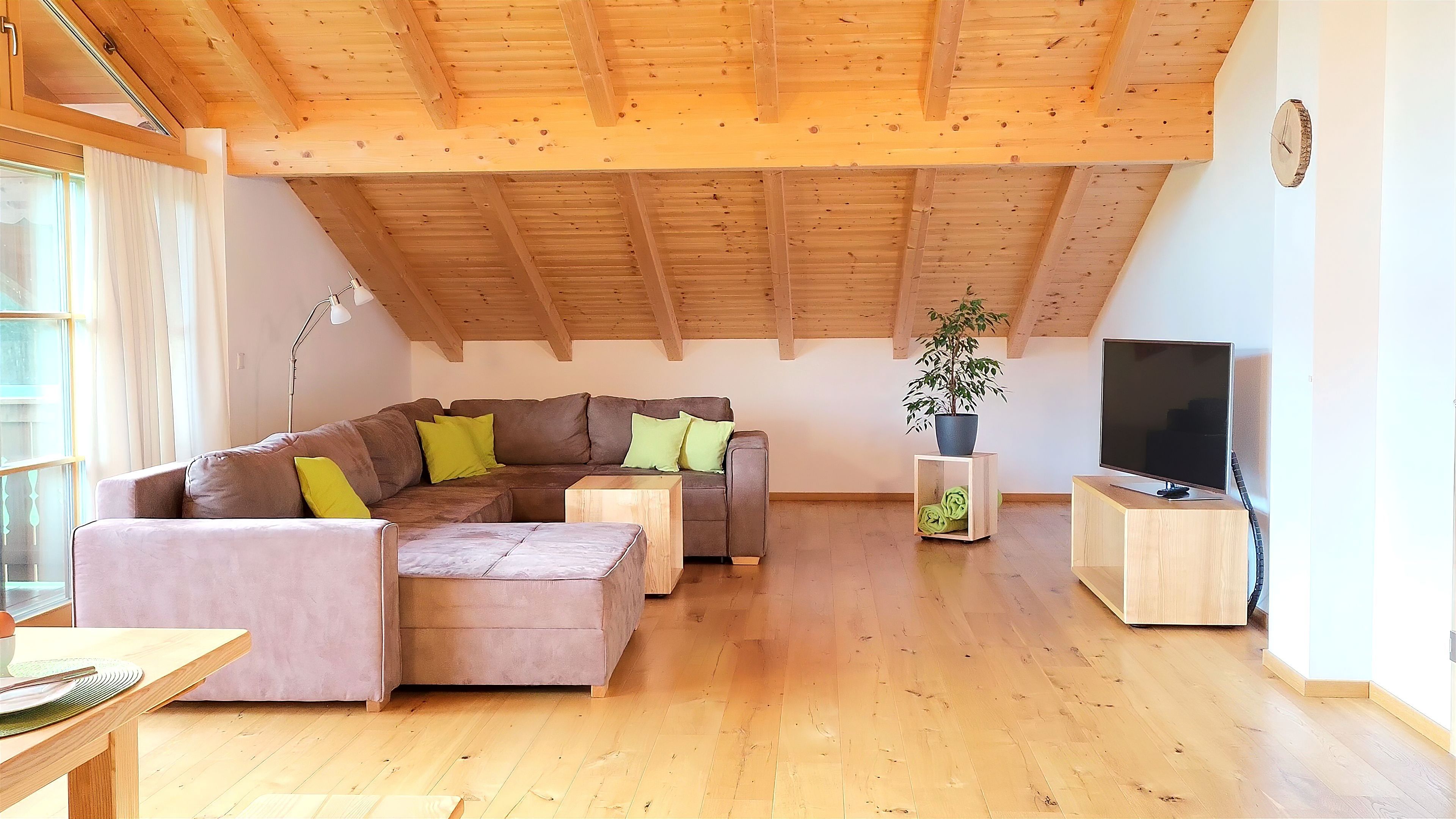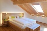 Erleben Sie den Charme eines offenen Holzdachstuhls in der Ferienwohnung Buchberg auf dem Rinser See-Hof. Auf 103 qm bietet die 5-Sterne-Wohnung mit 2 separaten Schlafzimmern, 2 Badezimmern und einem großzügigen Wohn- und Kochbereich reichlich Platz für 2-4 Personen. Die geschmackvolle Einrichtung aus eigenem Massivholz im modern ländlichen Stil, die vollausgestattete Küche, die Badewanne und die Regenduschen erlauben ein Urlaubserlebnis der Extra-Klasse. Genießen Sie entweder vom eigenen Balkon aus oder durch die große Glasfront den Ausblick auf die weiten Wiesen und Wälder und den Buchberg. Das durchgehende Echtholz-Parkett und angenehme Lichtdetails runden die gemütliche Atmosphäre ab.