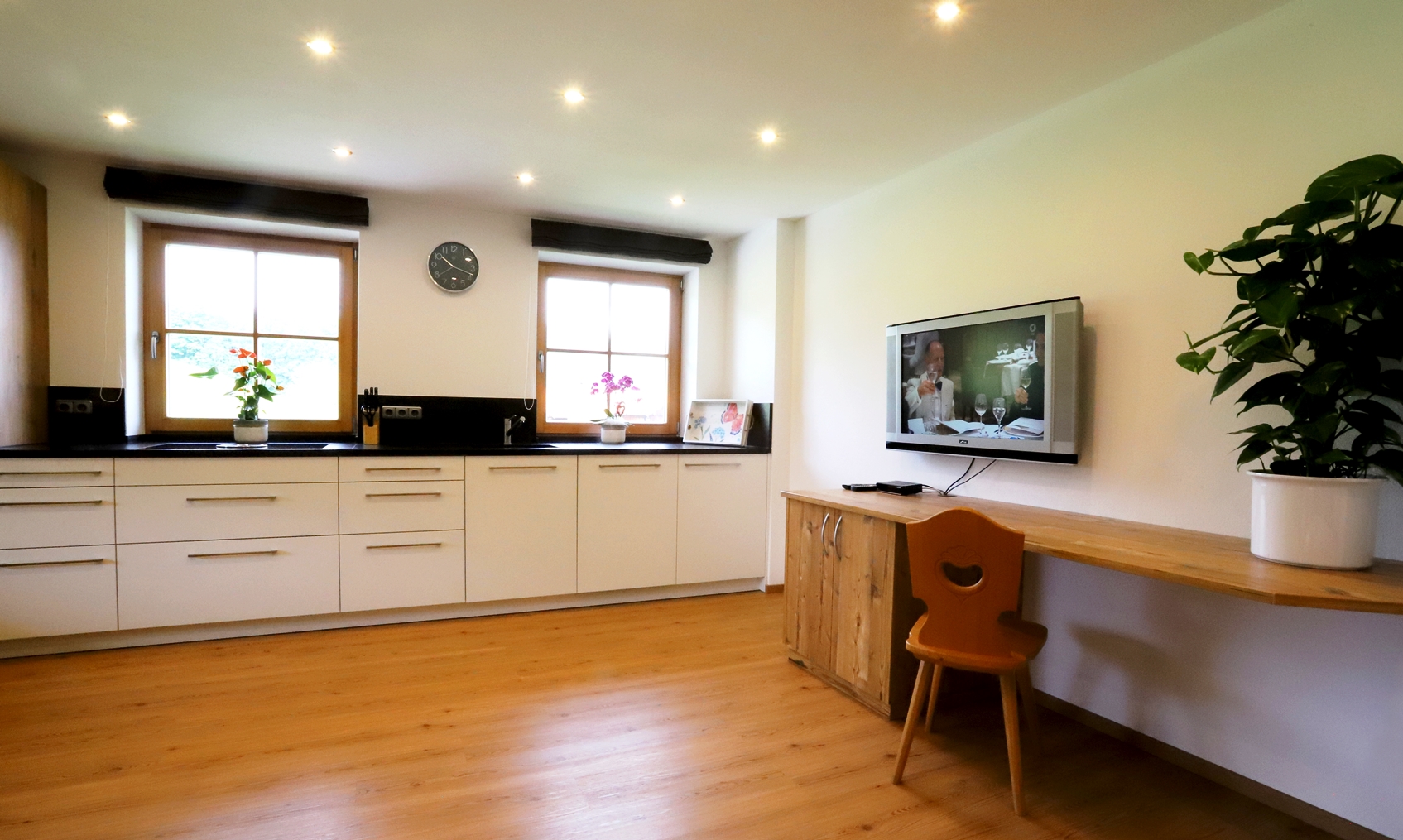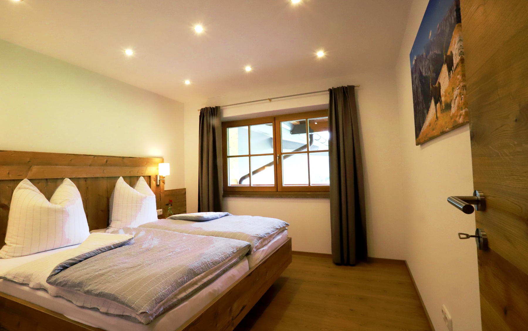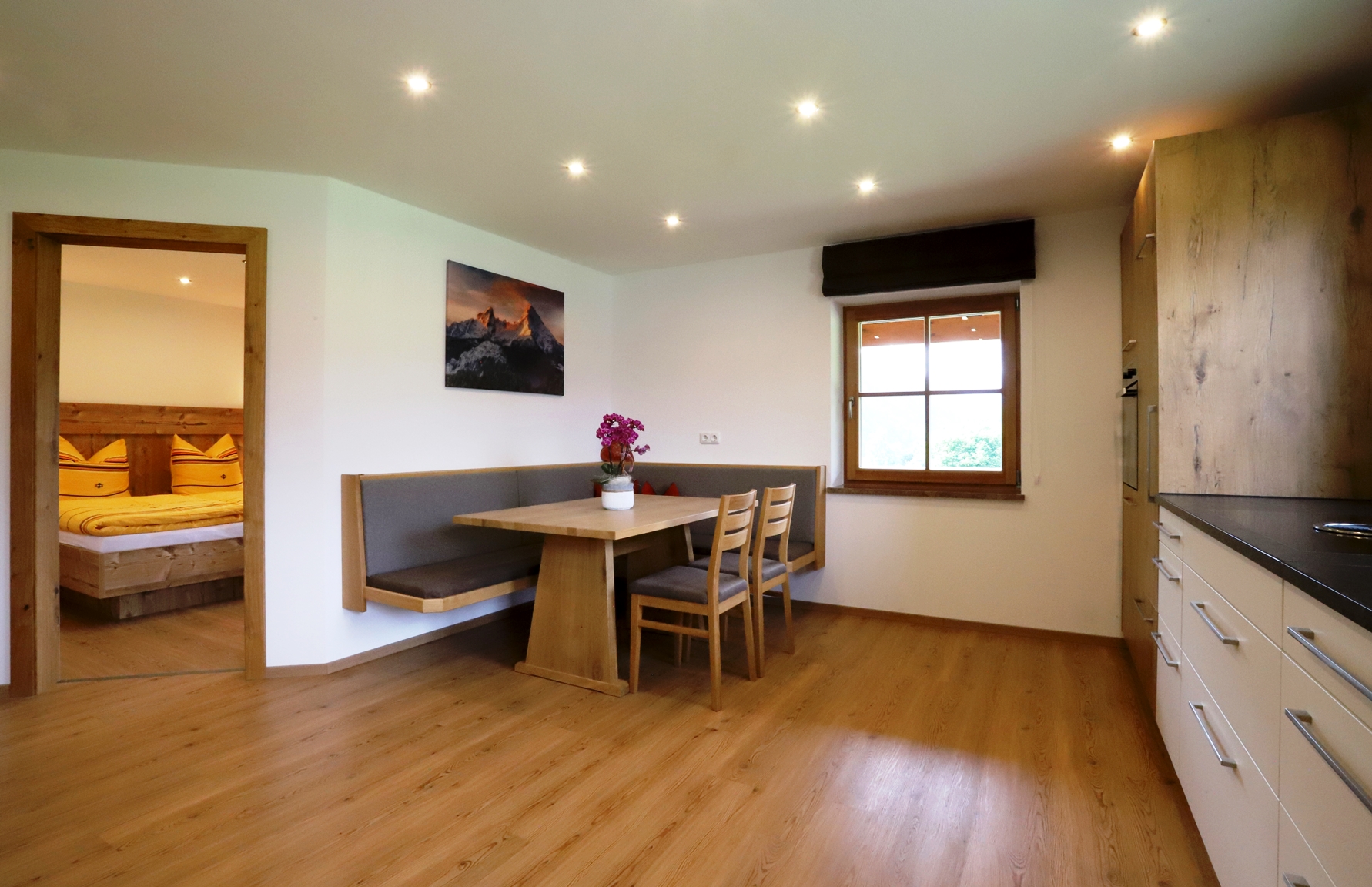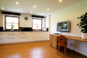 Unsere, im modernen Landhausstiel eingerichtete Ferienwohnung liegt im 1. Stock unseres Hauses und bietet auf ca. 90 m² ausreichend Platz für bis zu 4 Personen. Die mit vielen Extras ausgestattete Wohnküche lässt keine Wünsche offen. Zwei getrennte Schlafzimmer sorgen für einen erholsamen Schlaf um am nächsten Tag, erholt und entspannt, die umliegende Bergwelt zu erkunden.