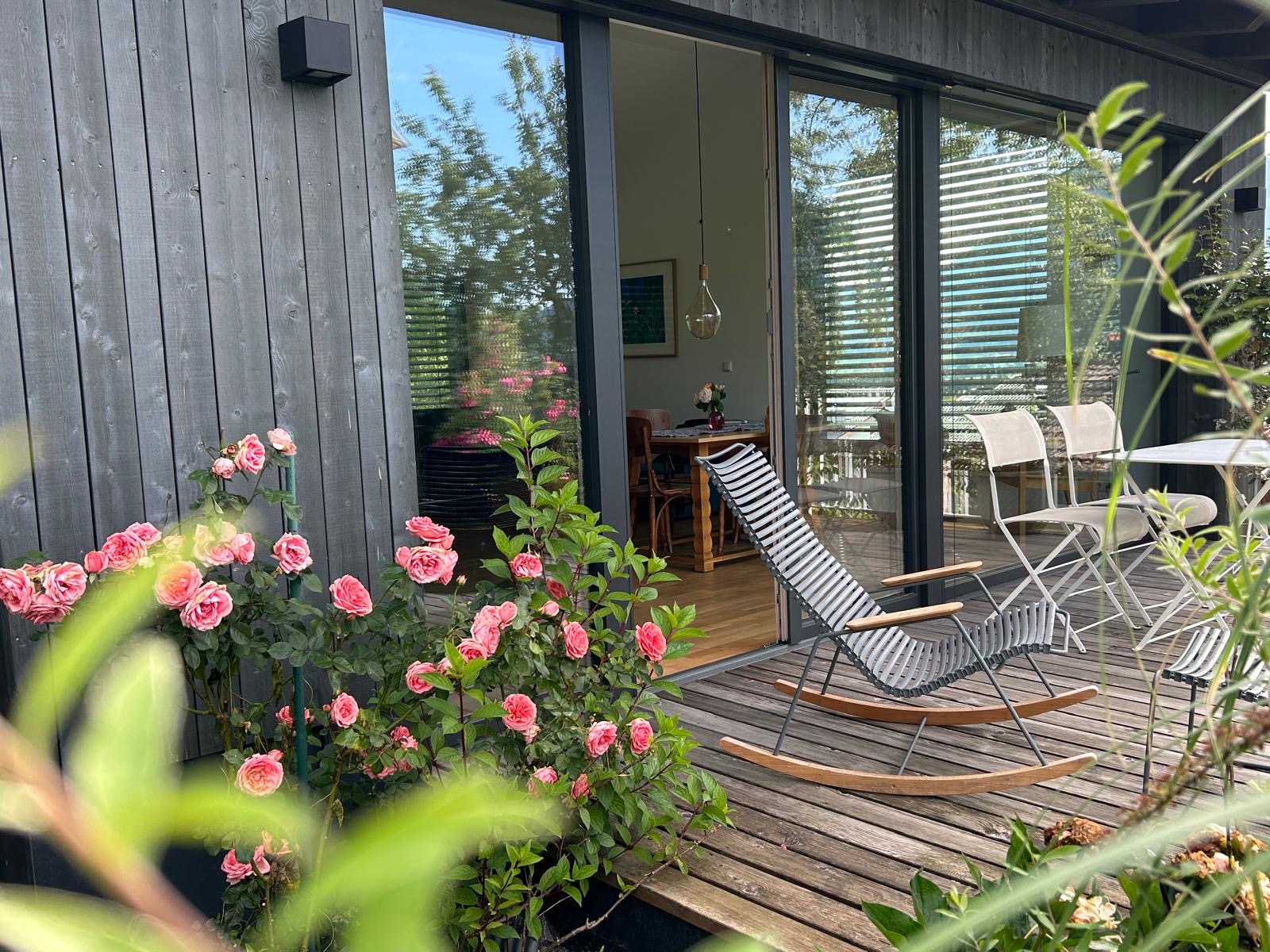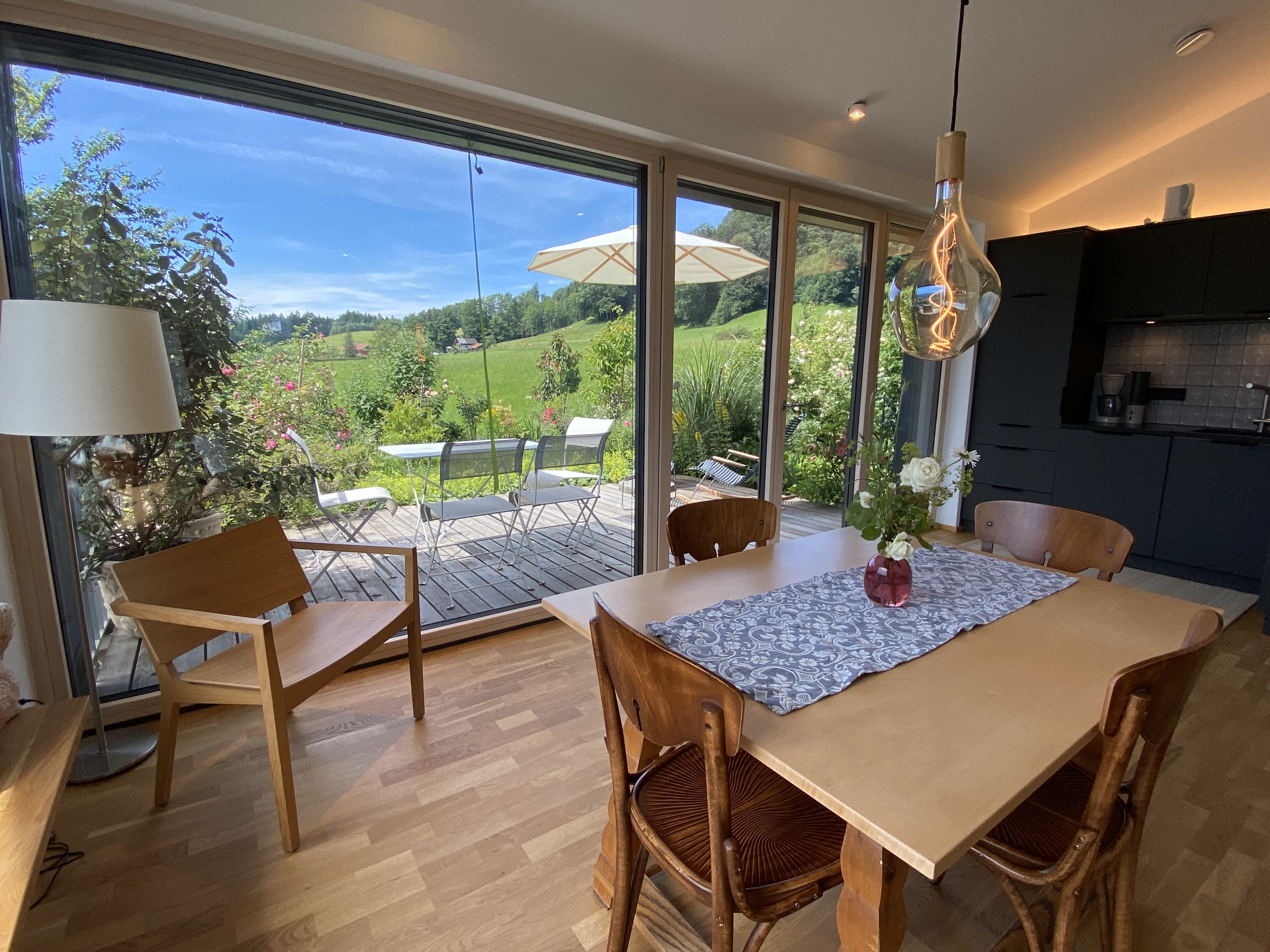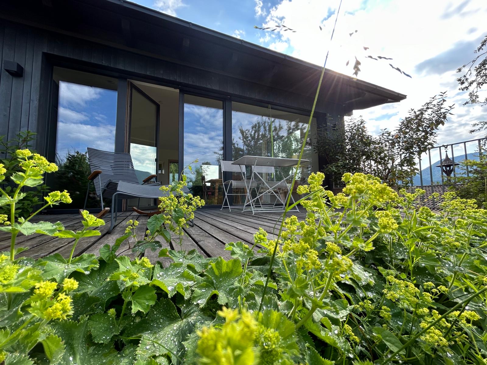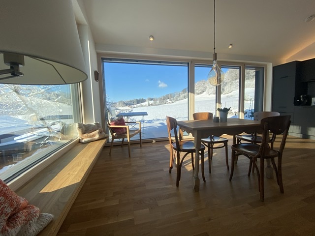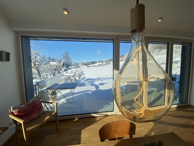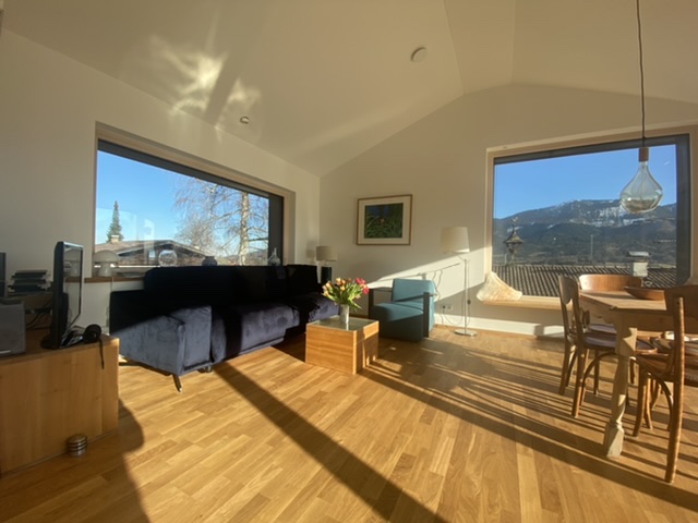 Einzigartige Lage mit unverbaubaren Bergpanoramablick, eigenem Garten, Schreinermöbeln, viele Rad-und Wanderwege vor der Haustüre. Ladestation für E-Autos und E-Bikes mit eigenem Solarstrom. Hochwertige Ausstattung ( Schreinerküche mit Spülmaschine Fussbodenheizung im Bad, Eichenparkett). Panoramafenster nach Osten, Süden, Westen. Die Wohnung ist mit Schreinermöbel und Designermöbel ausgestattet. Das energieeffiziente Haus ist aus heimischen Hölzern und komplett schadstofffrei.