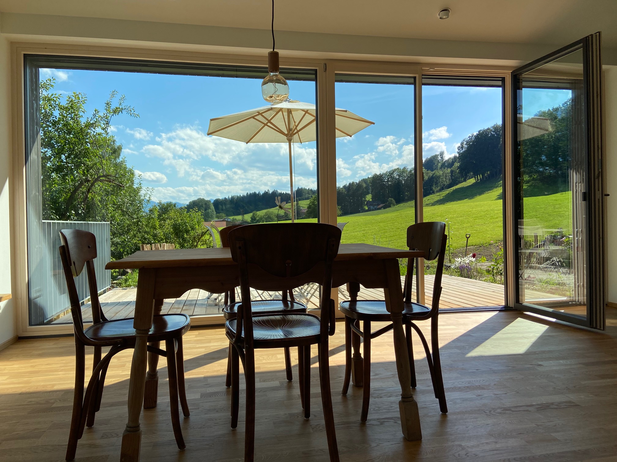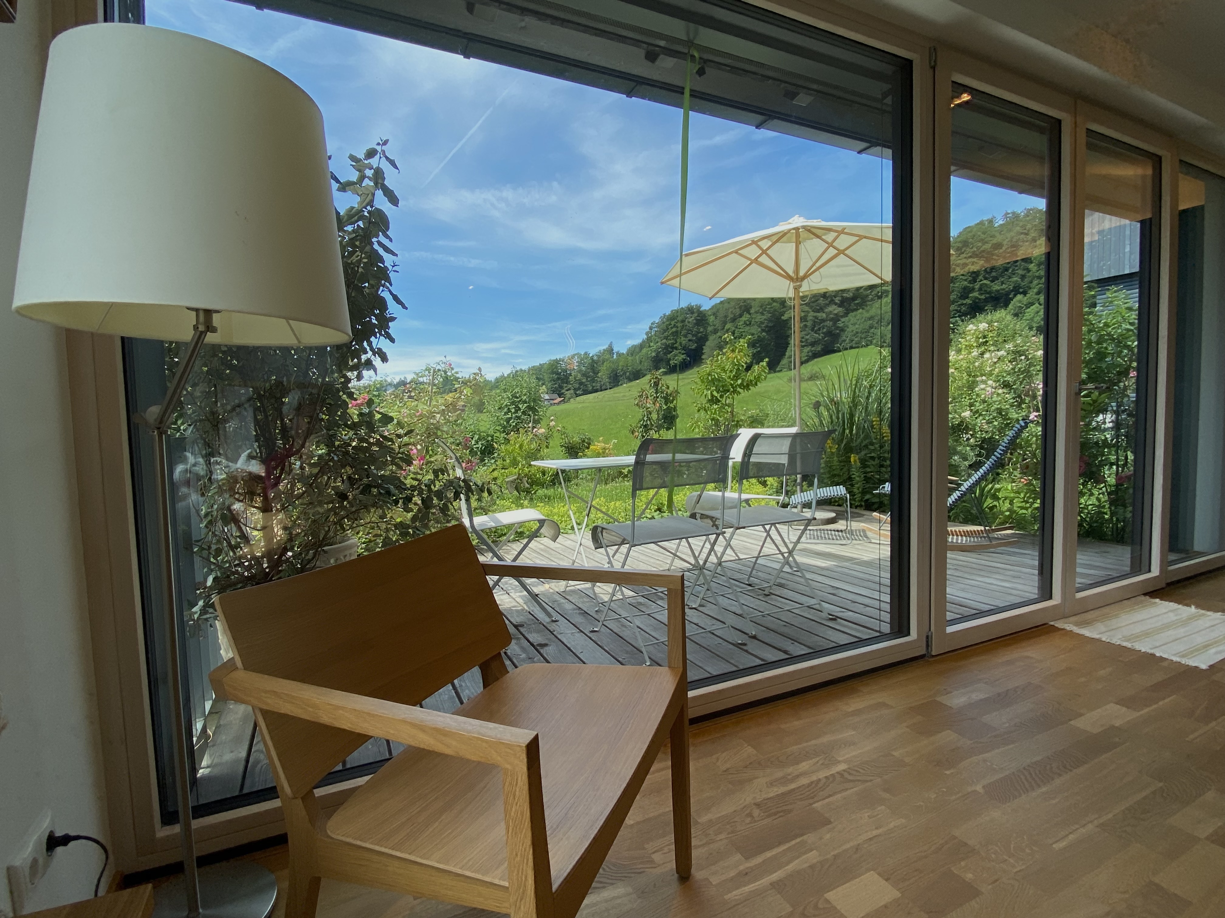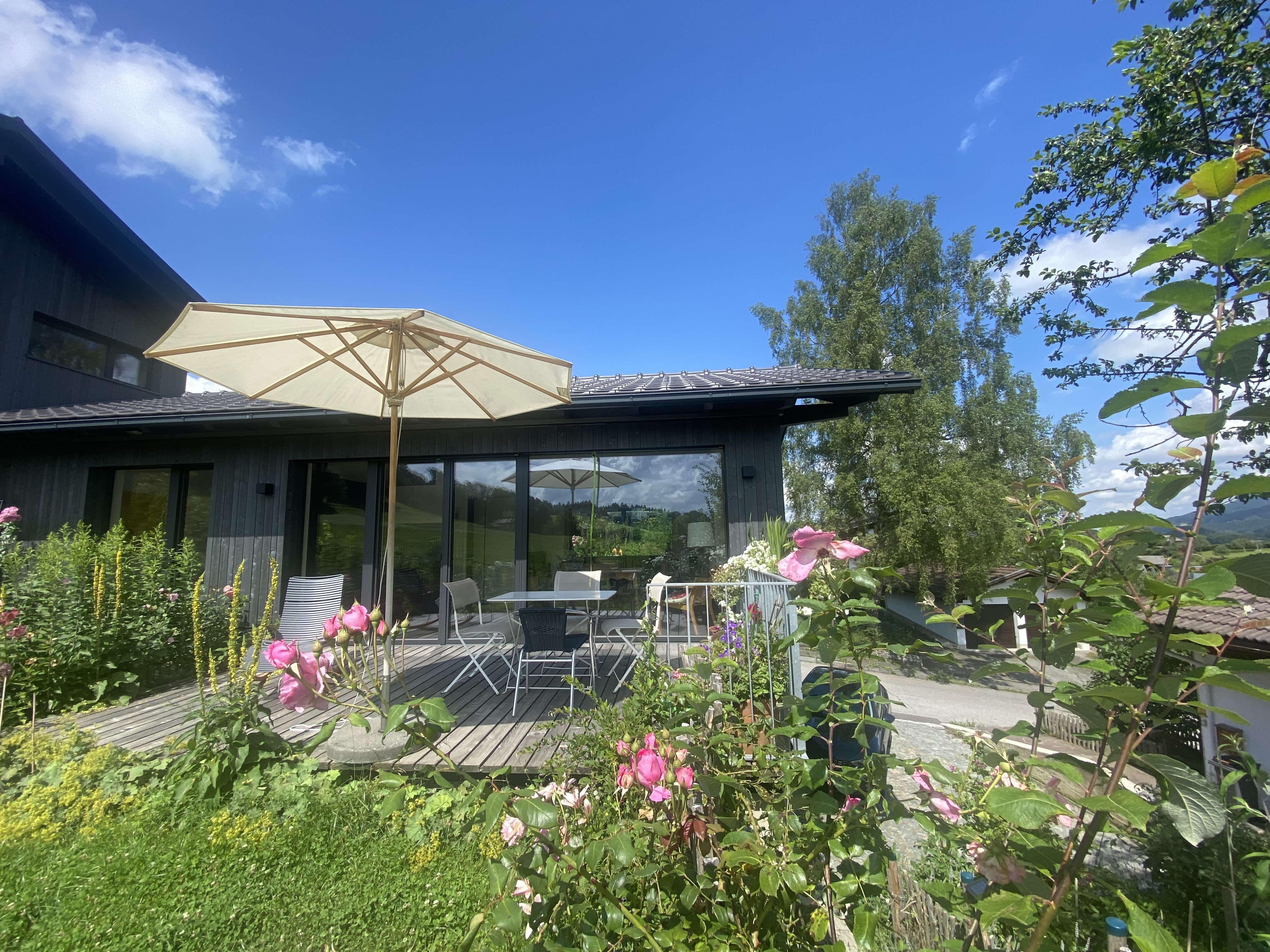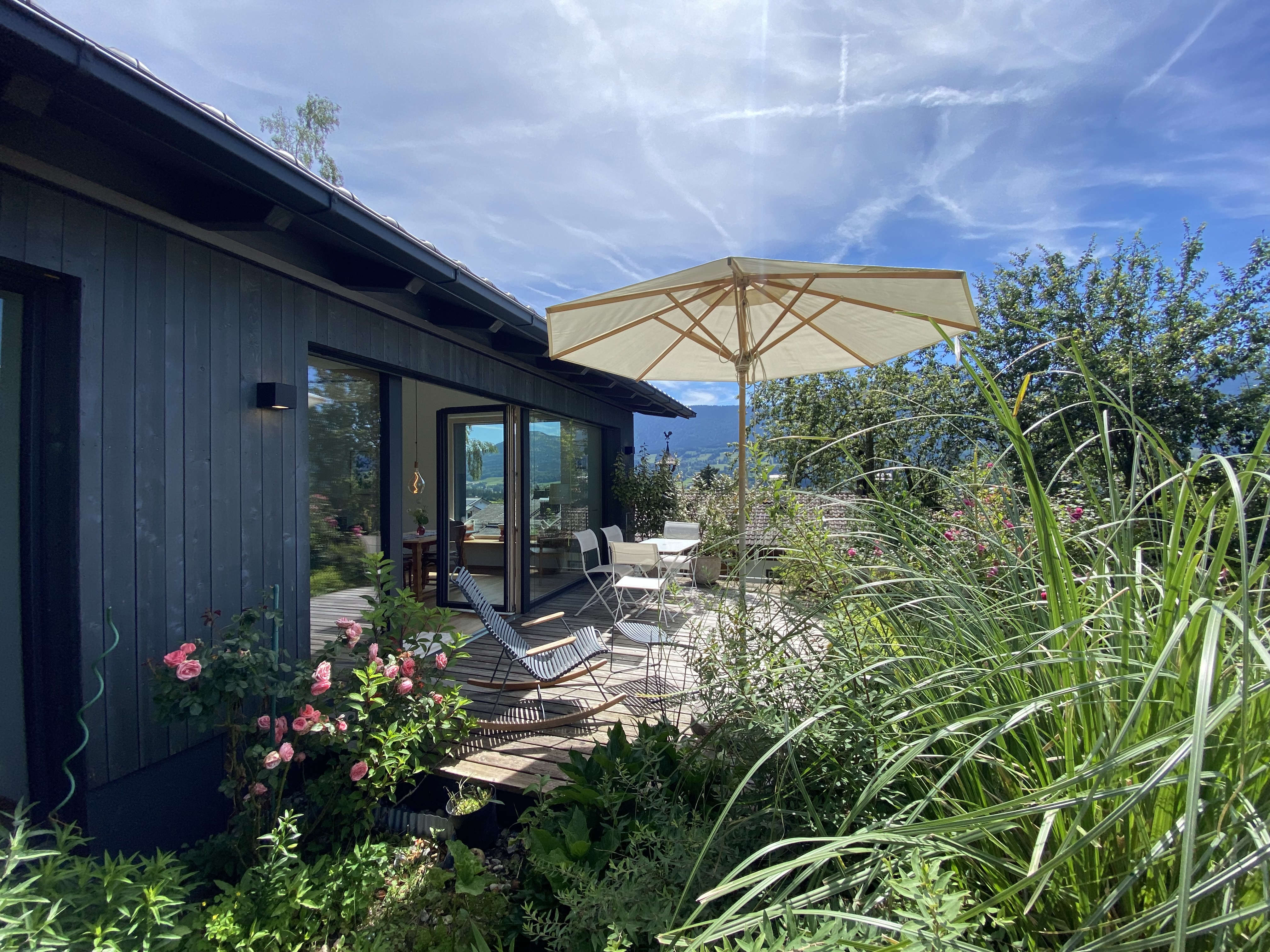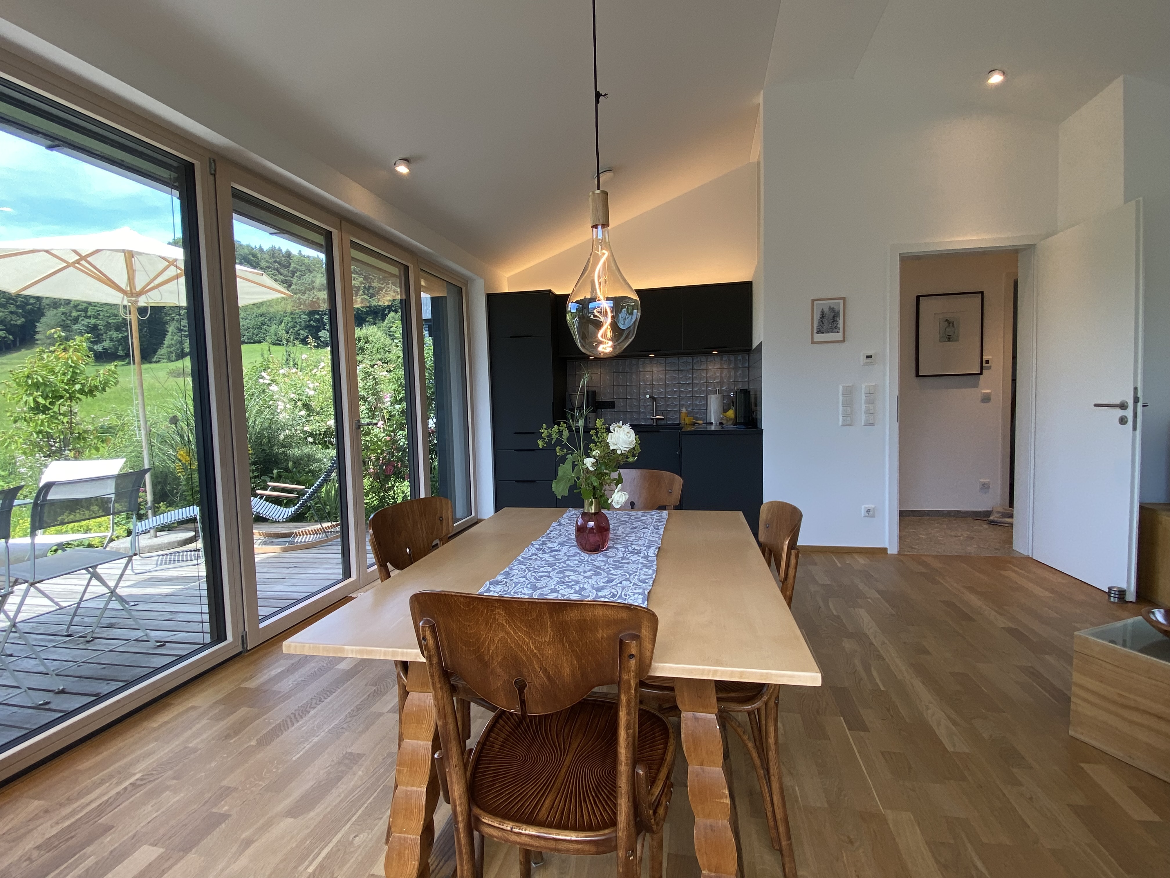 Einzigartige Lage mit unverbaubaren Bergpanoramablick, eigenem Garten, Schreinermöbeln, viele Rad-und Wanderwege vor der Haustüre. Ladestation für E-Autos und E-Bikes mit eigenem Solarstrom. Hochwertige Ausstattung ( Schreinerküche mit Spülmaschine Fussbodenheizung im Bad, Eichenparkett). Panoramafenster nach Osten, Süden, Westen. Die Wohnung ist mit Schreinermöbel und Designermöbel ausgestattet. Das energieeffiziente Haus ist aus heimischen Hölzern und komplett schadstofffrei.