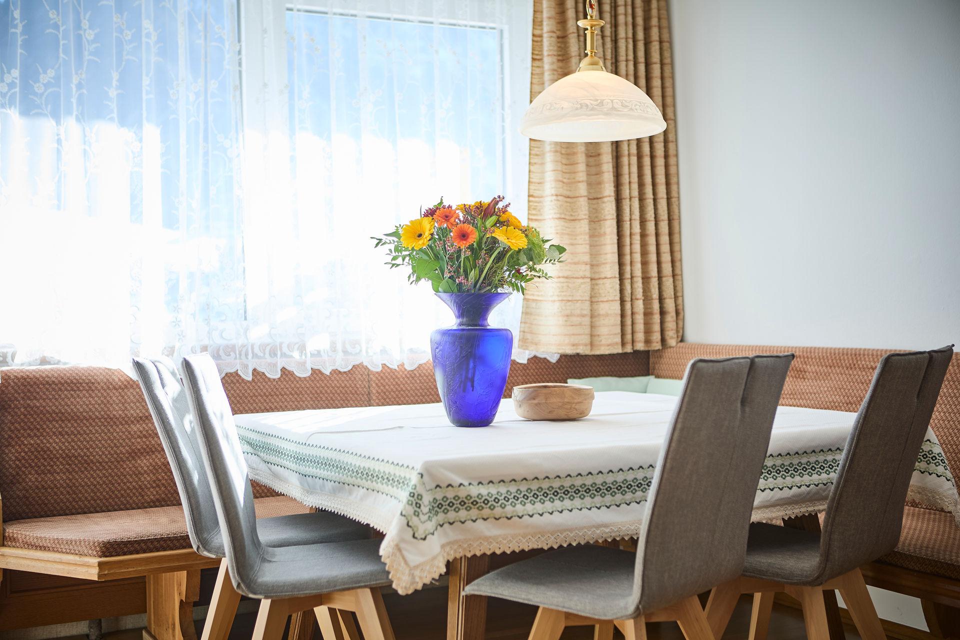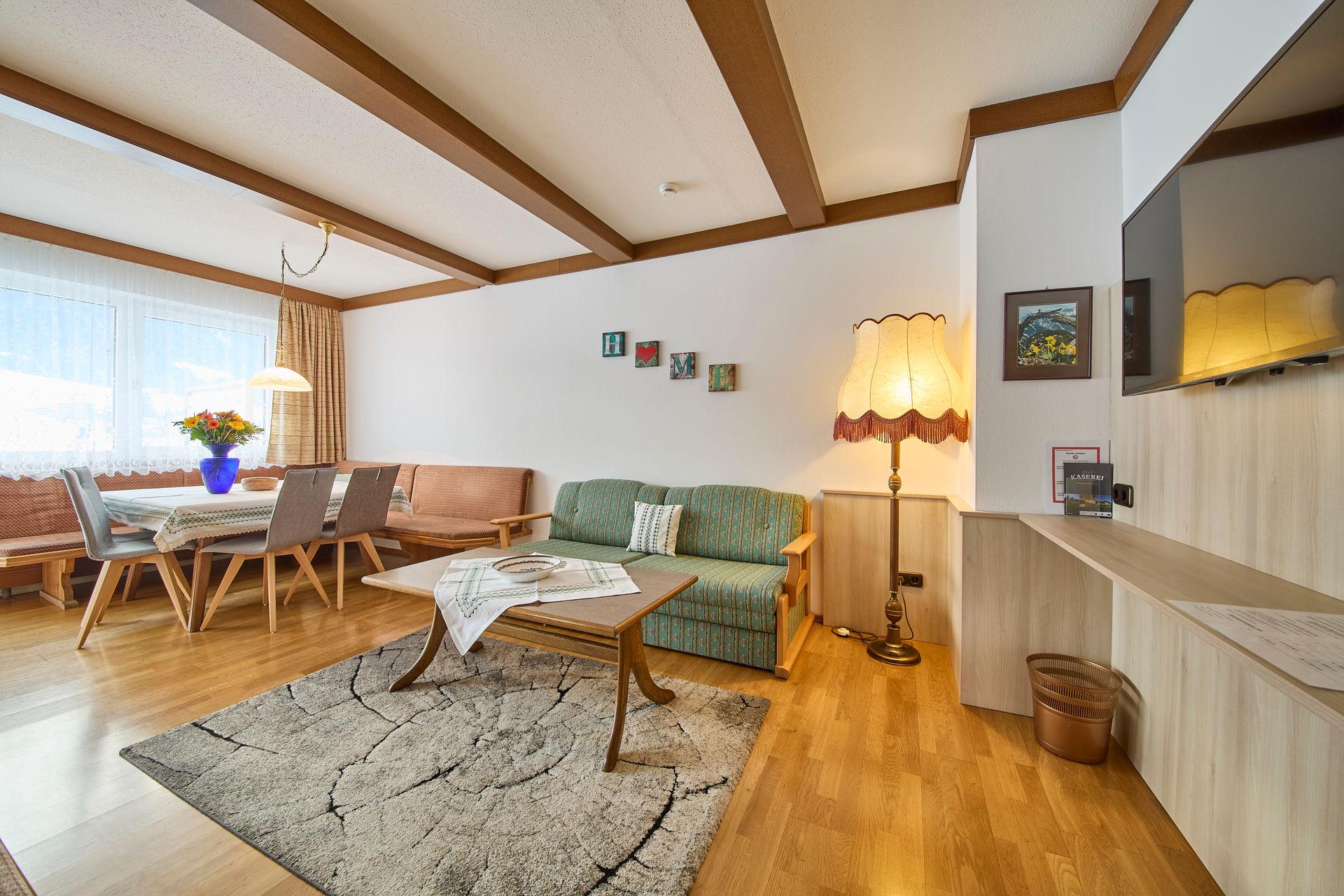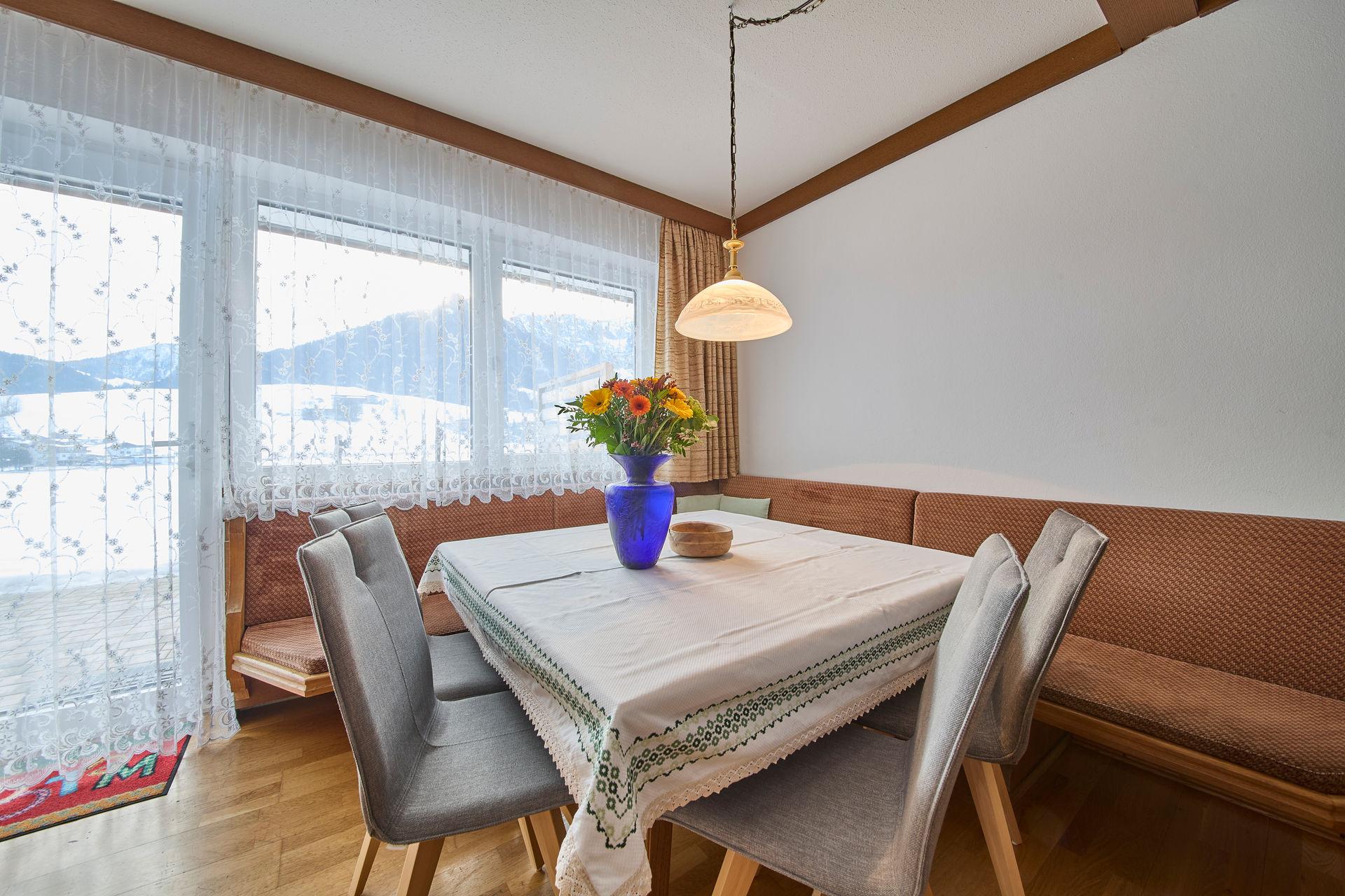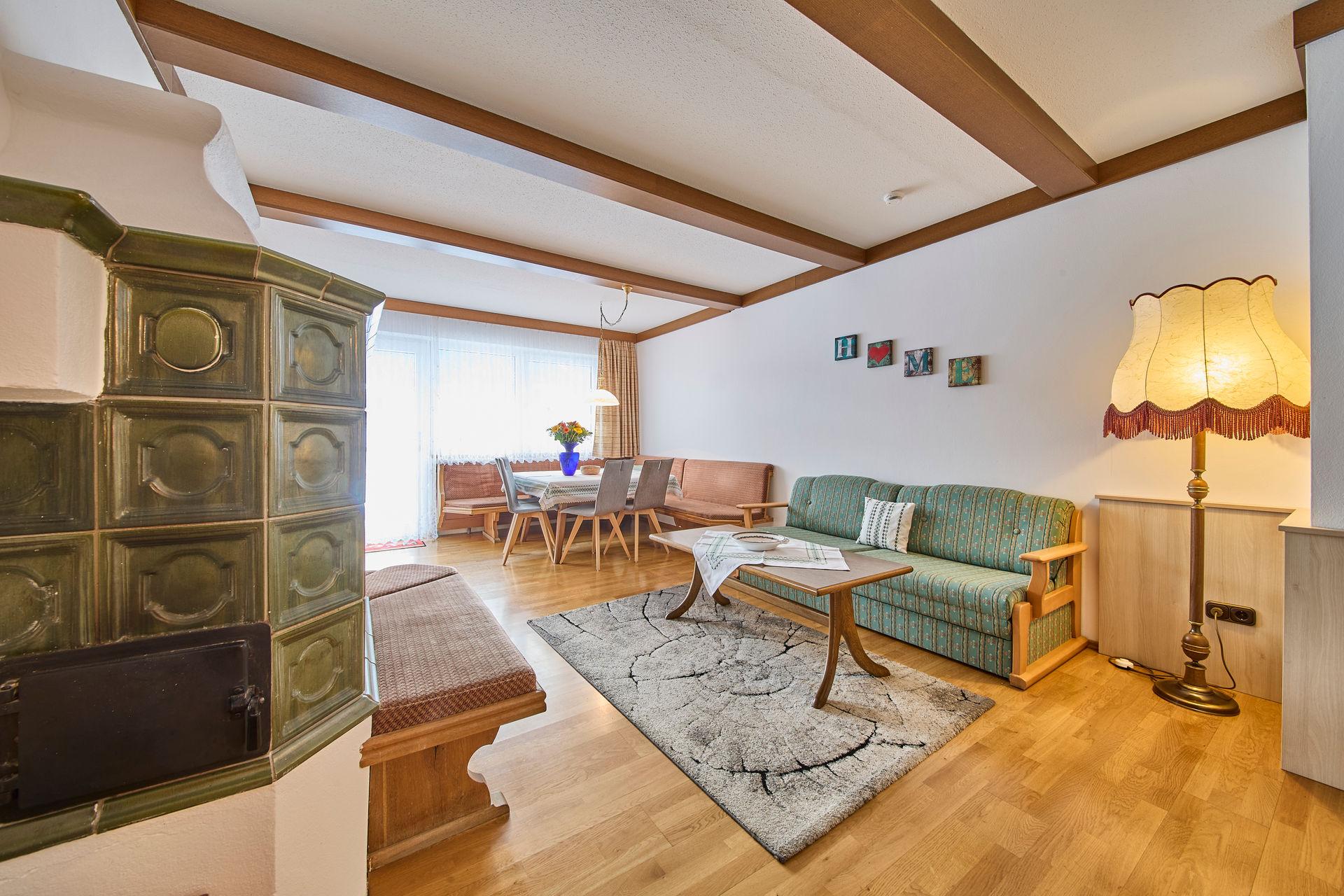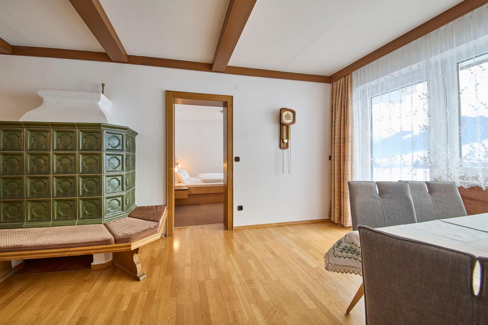 Ferienwohnung für 2 - 7 Personen (ca.: 95 m²) mit Kachelofen und eigener Terasse, bestehend aus 2 getrennten Schlafzimmern, 1 großer Wohnzimmer mit ausziehbarer Couch, extra Küche, BAD/WC mit Blick zum Zahmen Kaiser.