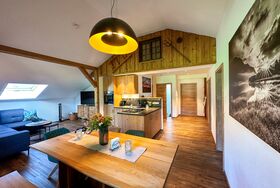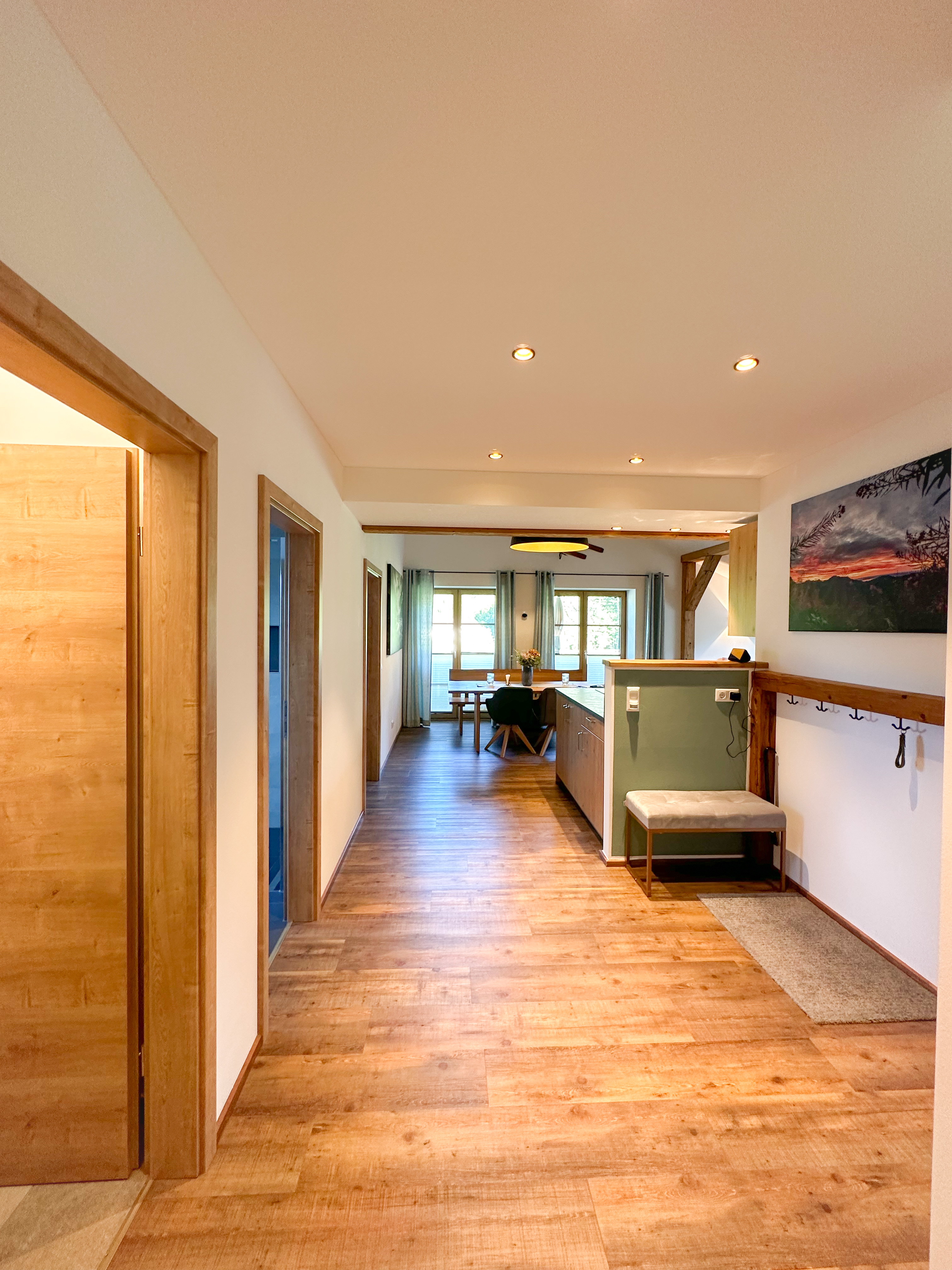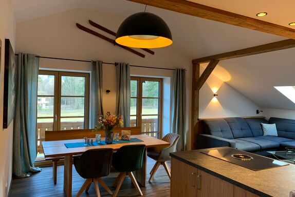 Neu renovierte Ferienwohnung mit schönen Altholz-Elementen. Balkon mit schönem Bergblick. Großzügiger Wohn-Essbereich.