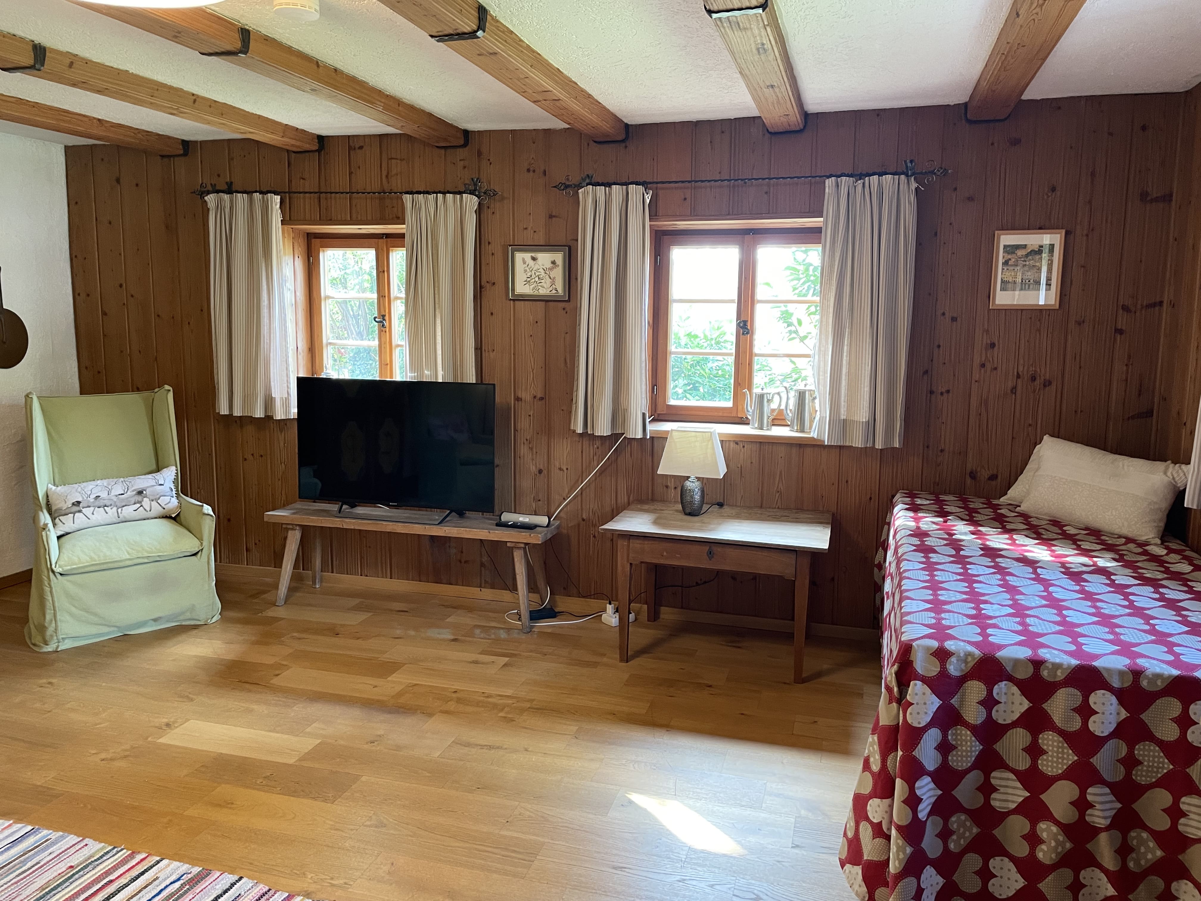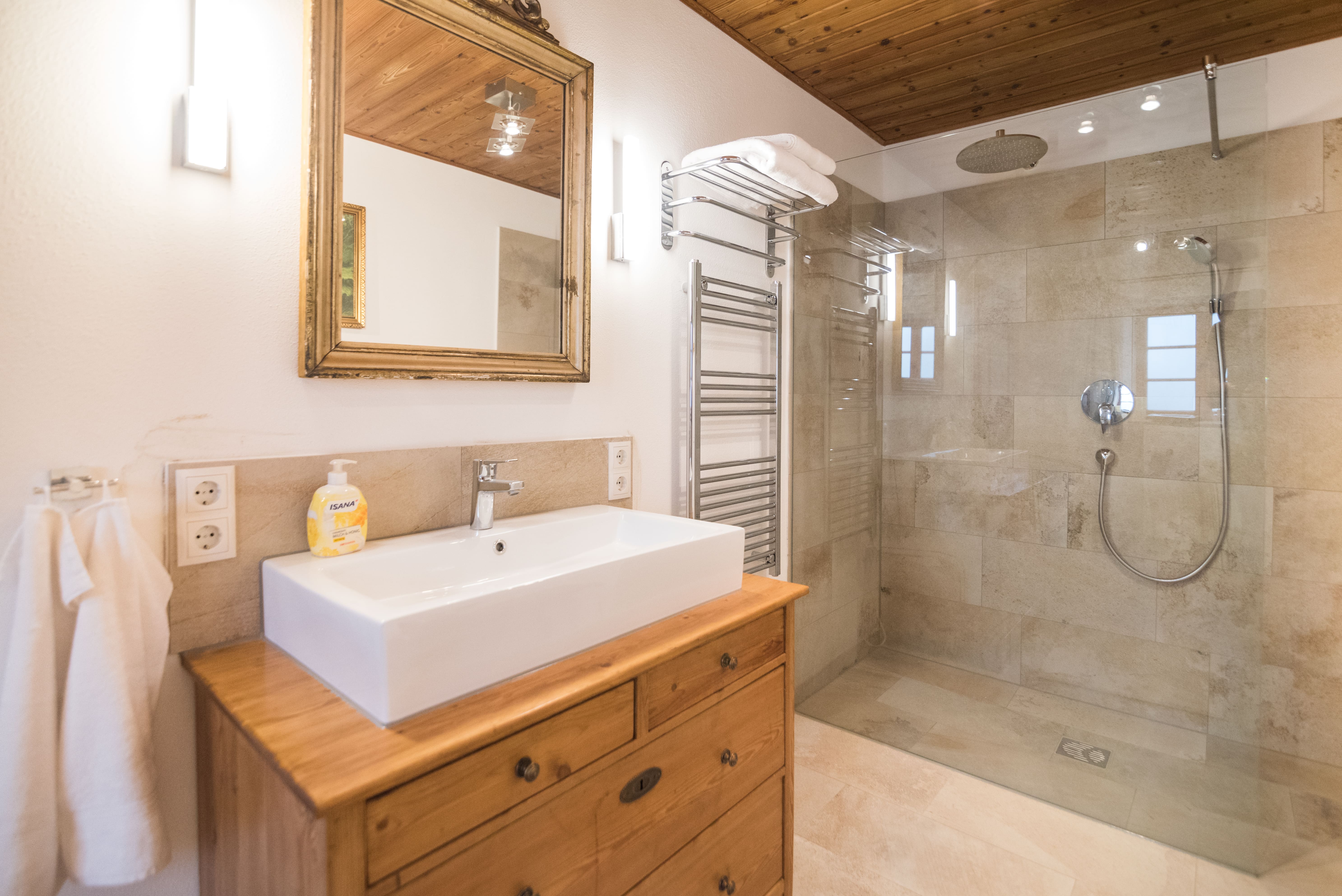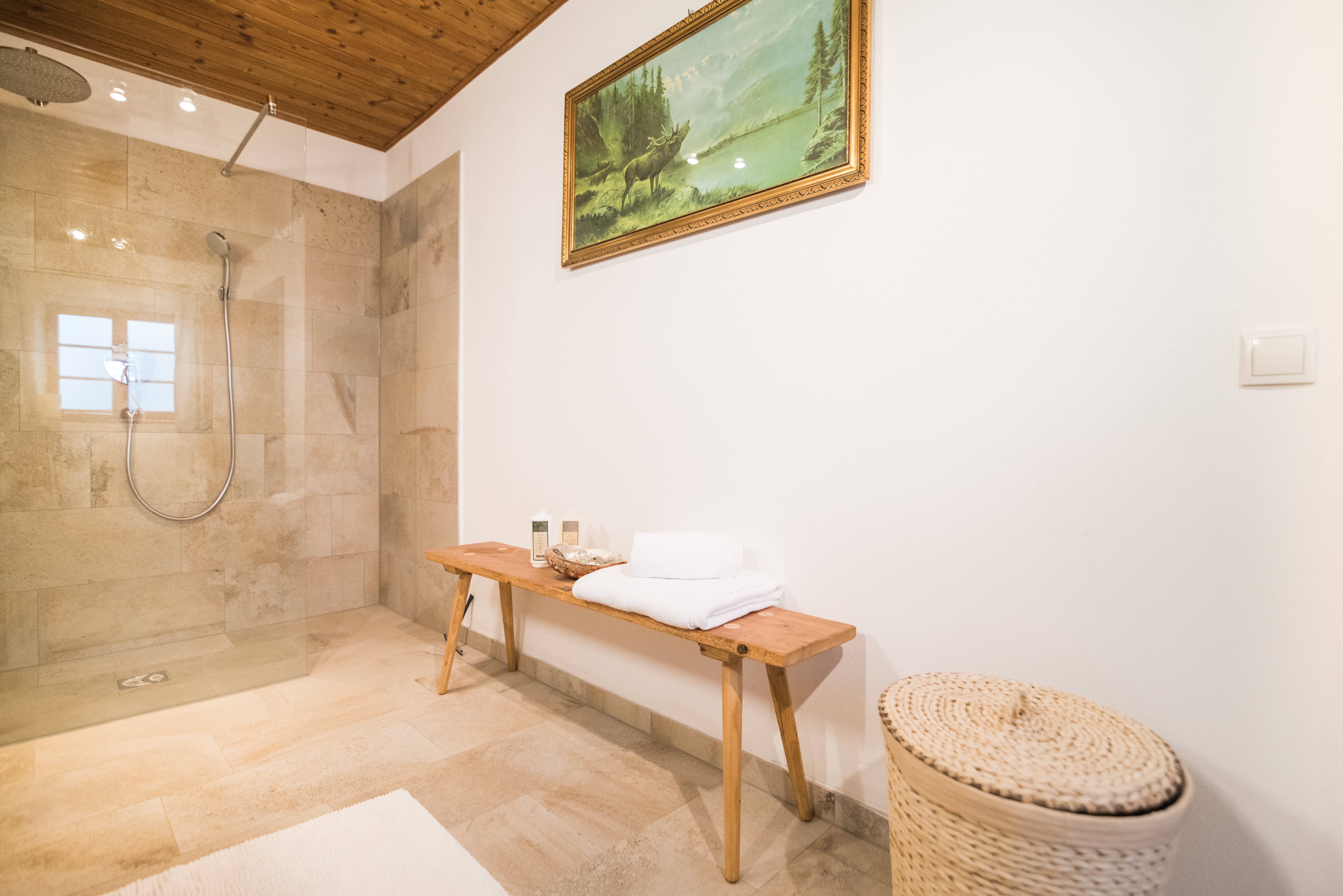 Apartment YVONNE (bis 4 Personen) befindet sich im Erdgeschoss des hinteren Teils des Schusterhäusls. Es verfügt über eine große Terrasse auf der Sonnenseite inkl. Garten von der Küche begehbar, einem Schlafzimmer mit King-Size-Bett, teils holzvertäfelt mit Holzeinbauschränken, Ein sehr großes, luxuriöses Bad in Naturstein inkl. Föhn und Regendusche stehen Ihnen hier zur Verfügung. In der vollausgestatteten Wohnküche mit großem Esstisch und gemütlicher Bank findet jeder sein „Platzerl“. Das zum Teil holzvertäfelte Wohnzimmer ist mit einem großen Sofa und SMART-TV ausgestattet. Auf Wunsch können wir Ihnen hier noch ein komfortables Bett 200 x 200 cm für 2 weitere Gäste anbieten.