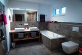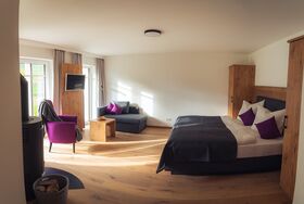 Die geräumige Ferienwohnung befindet sich im EG und ist bedingt behindertengerecht. Der große Eingangsbereich mit viel Stauraum führt direkt in den offenen Wohn- und Essbereich. Die Küche ist komplett ausgestattet. Boxspringbett, Flachbild-TV, Kaminofen und eine gemütliche Sitzecke laden zum abendlichen Entspannen ein. Das große, geräumige Badezimmer beinhaltet eine ebenerdige Dusche/ Rainshower und eine Badewanne und lässt somit keine Wünsche offen. Zusätzlich sind alle Bäder mit einem Bidet ausgestattet. An die überdachte Terrasse grenzt die Wildblumenwiese mit dem Naturgarten.