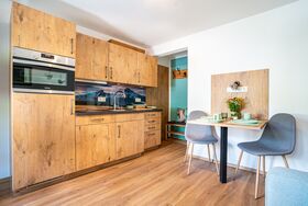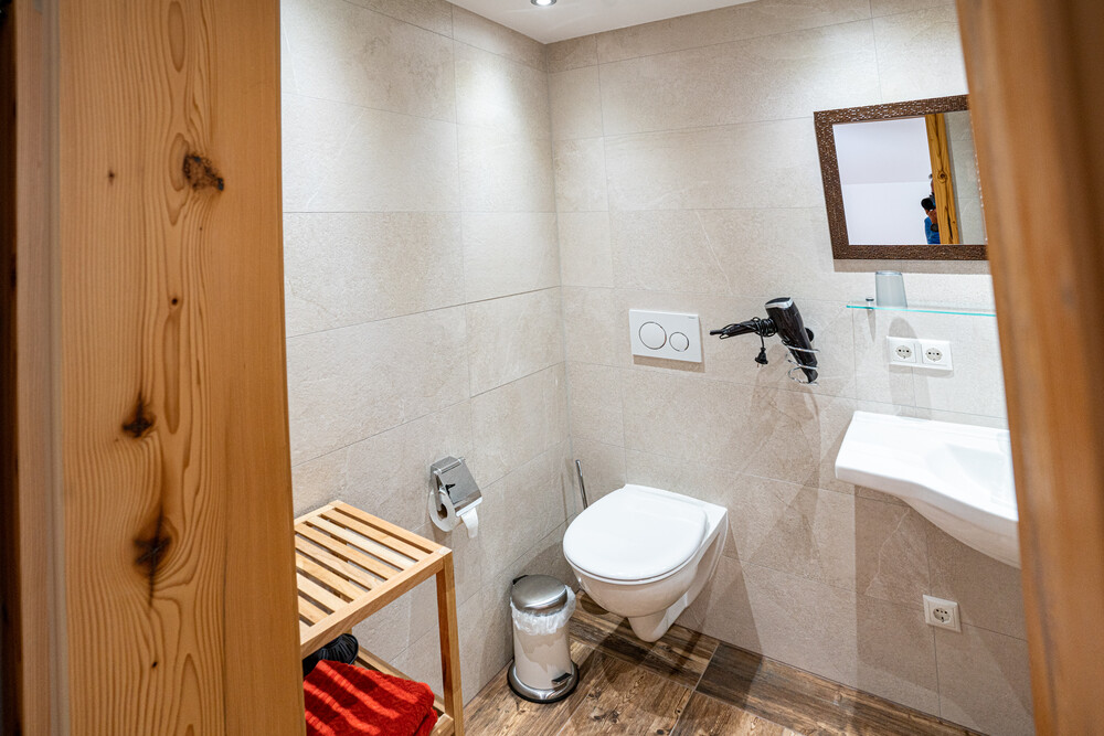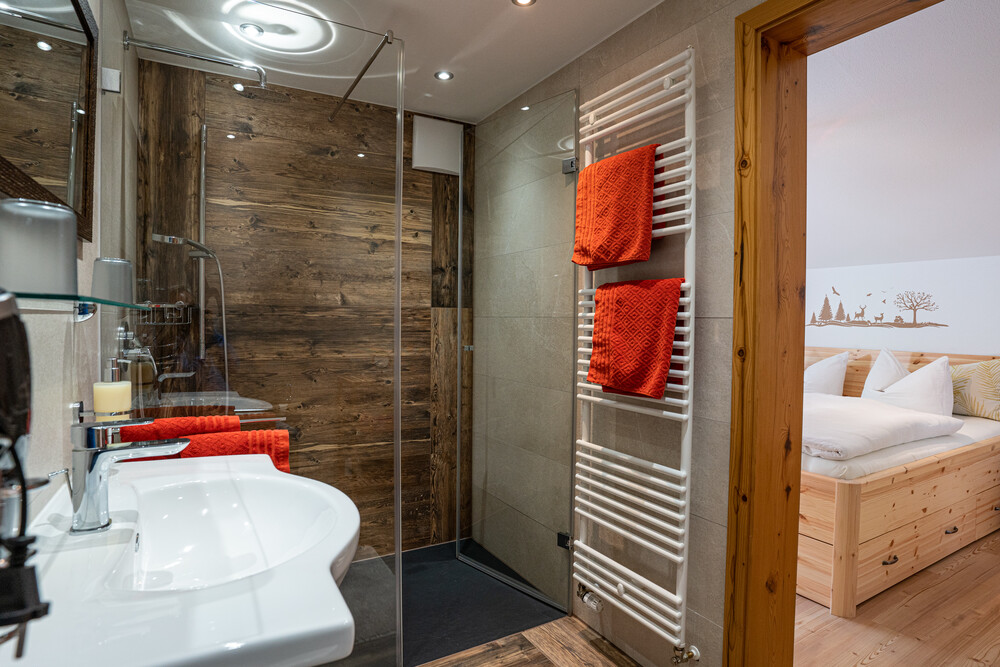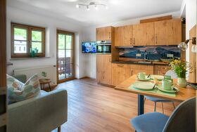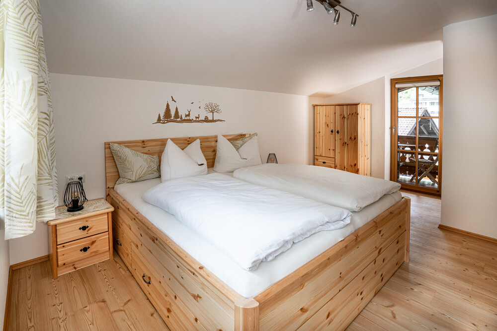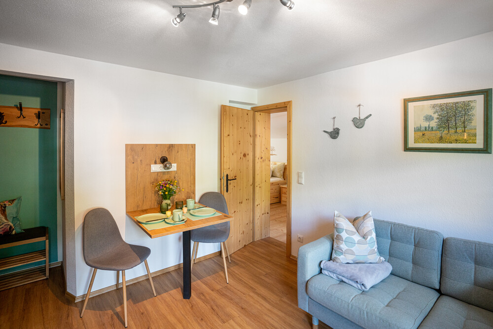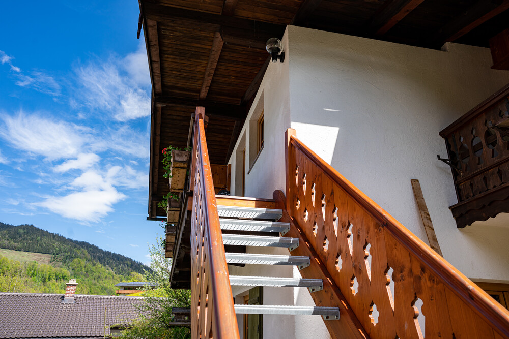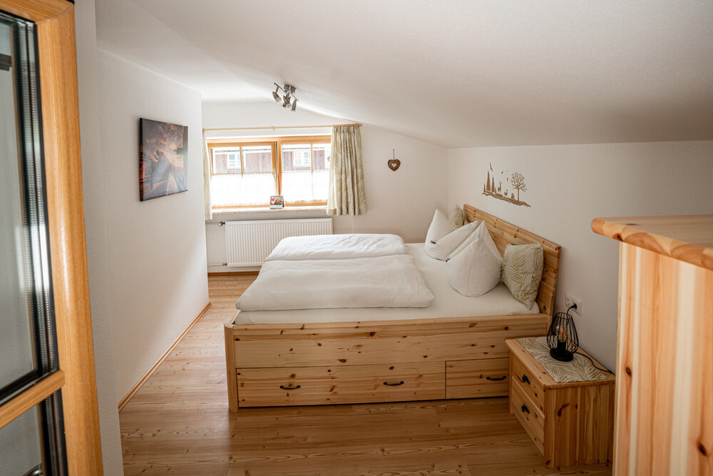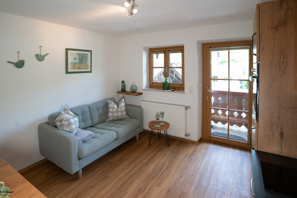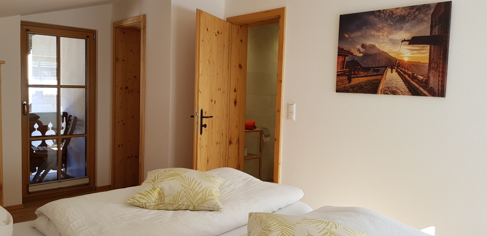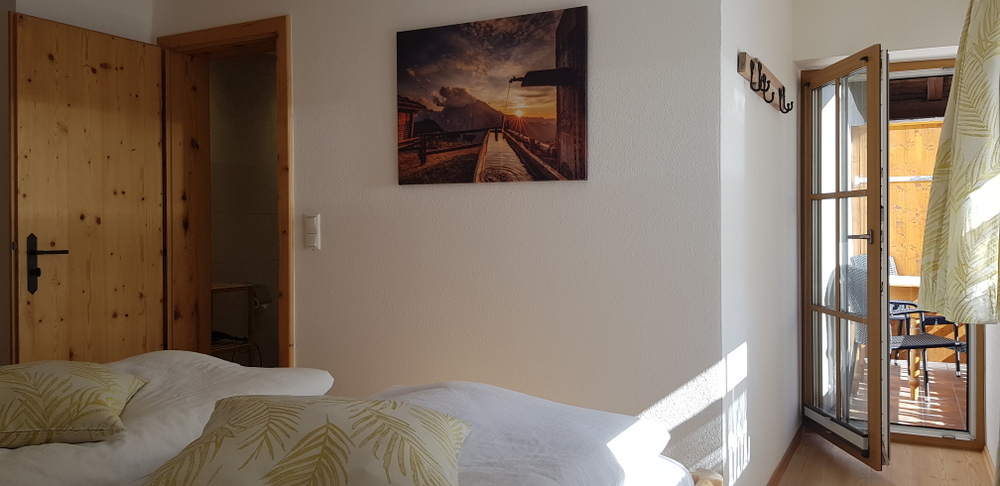 Unsere neu errichtete Ferienwohnung im Obergeschoß mit eigenem Eingang und Balkon zur Nord- und Südseite ist mit viel Liebe zum Detail modern-rustikal eingerichtet, dort werden Sie sich auf Anhieb wohl fühlen. Die Wohnung ist ausgestattet mit einer großzügigen Küche mit 2-Platten-Herd im Wohn-Esszimmer mit gemütlicher Couch und TV und einem kleinen Esstisch. Das separate Schlafzimmer mit Zugang zum Badezimmer lädt zum Träumen und Ausschlafen ein. W-LAN kostenlos im gesamten Haus.