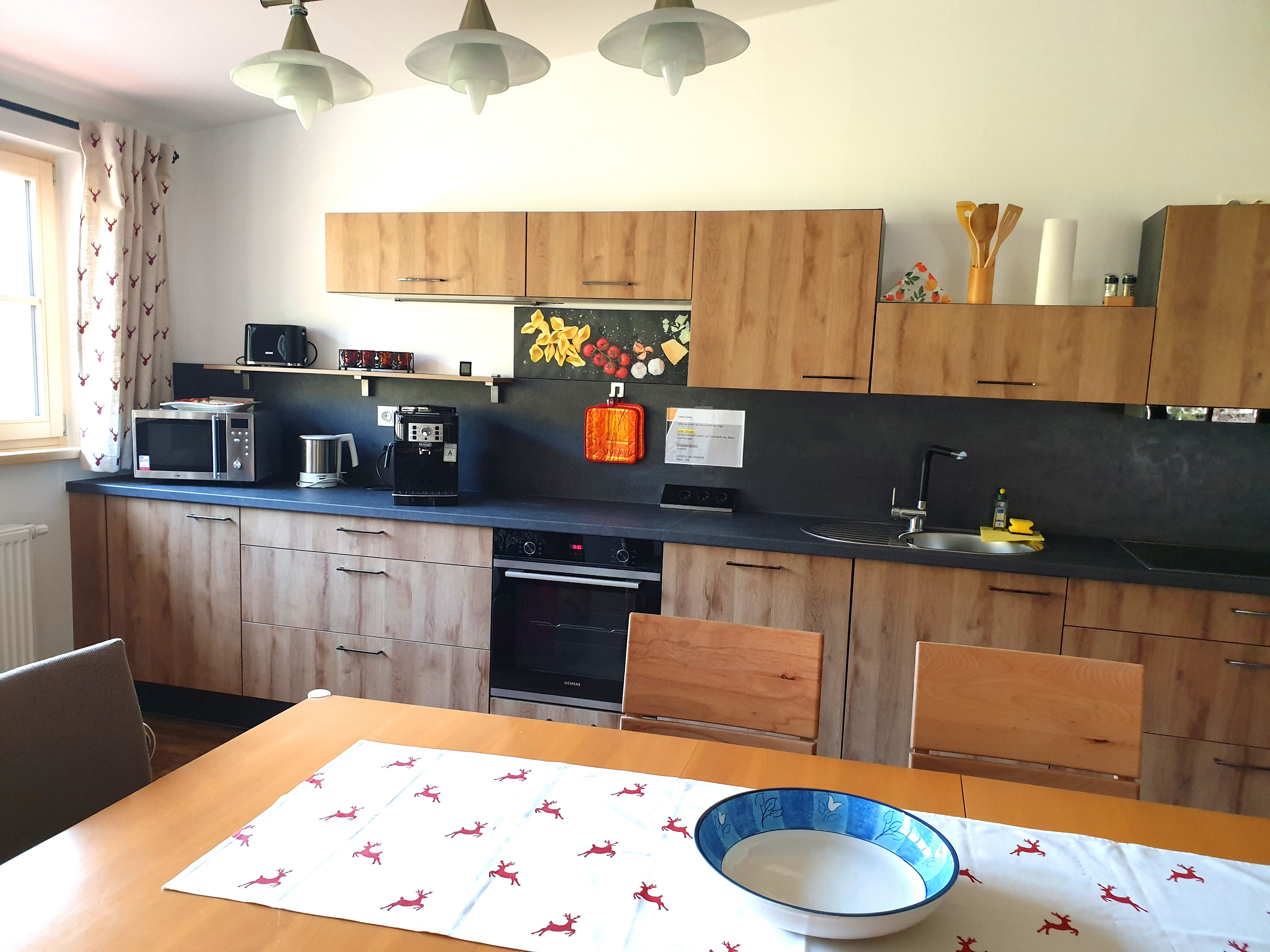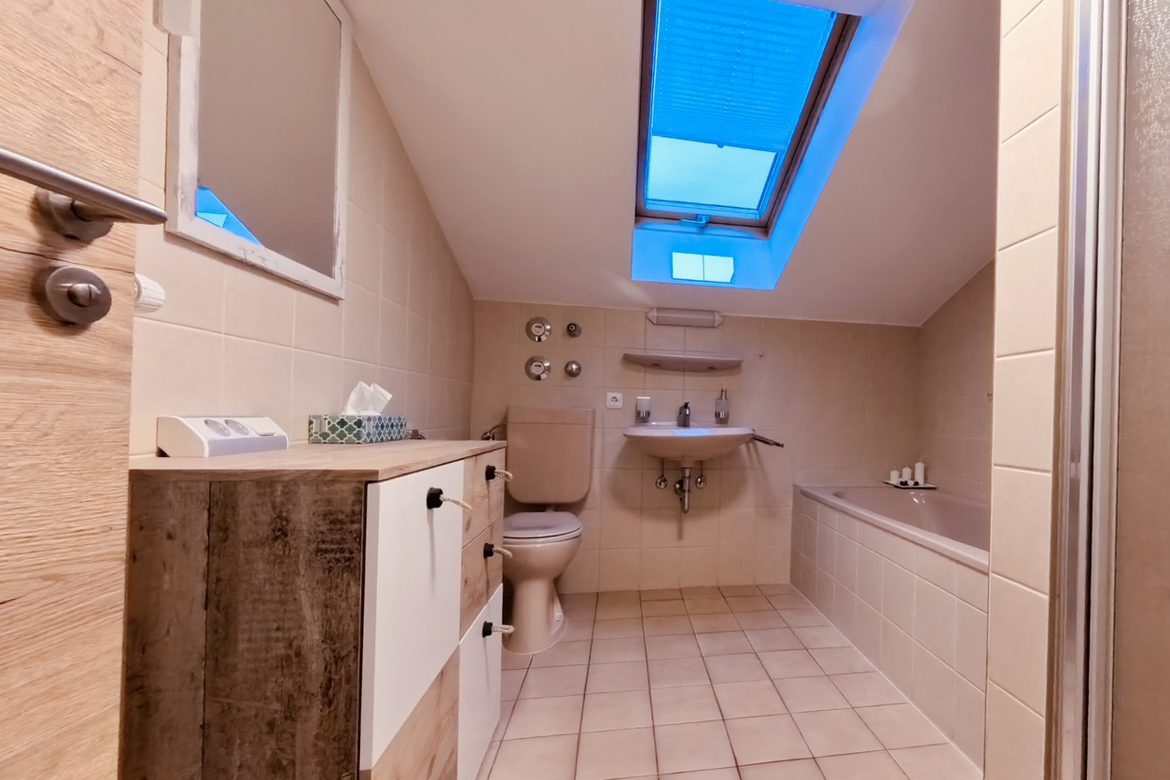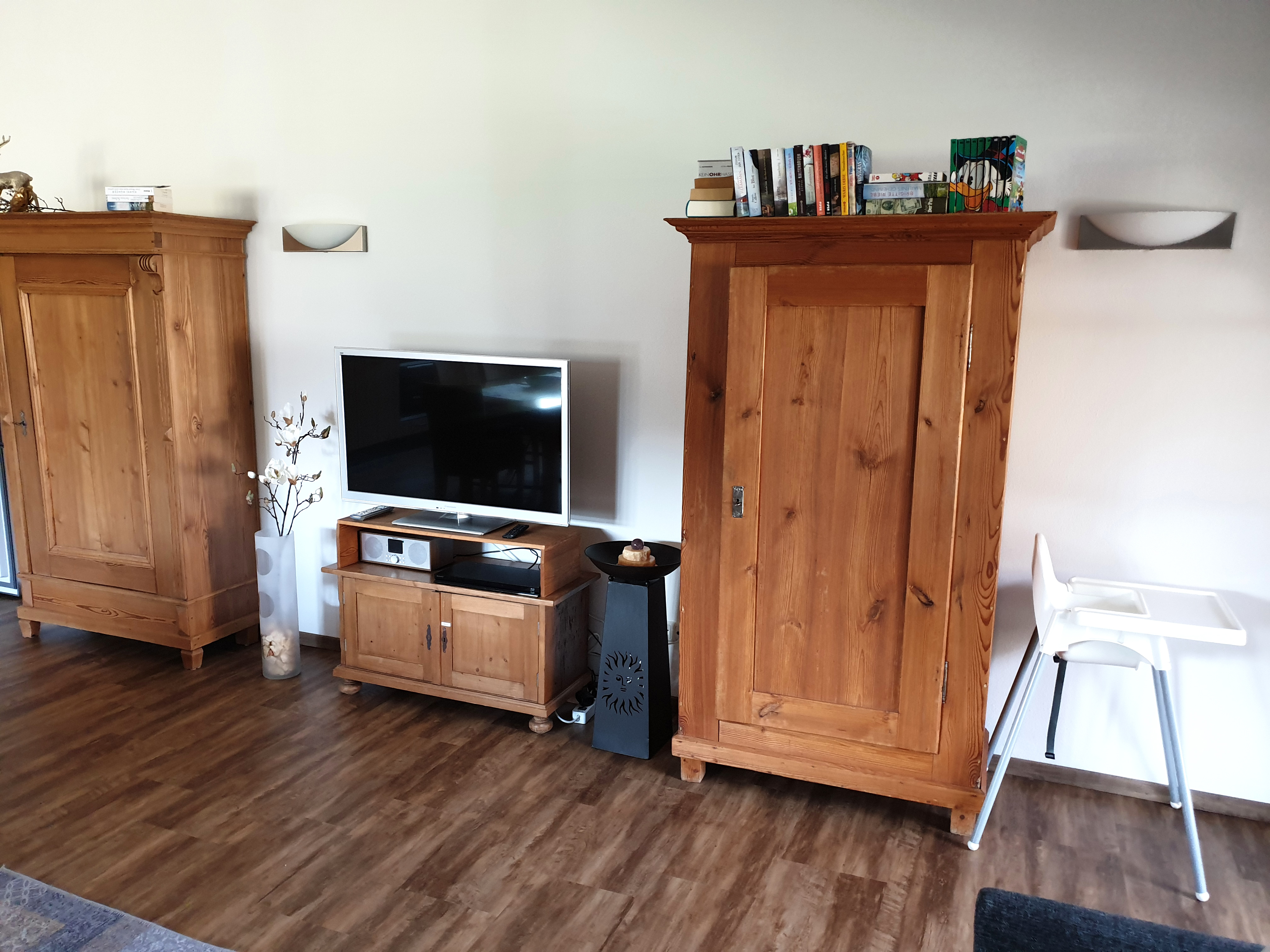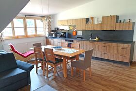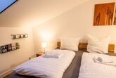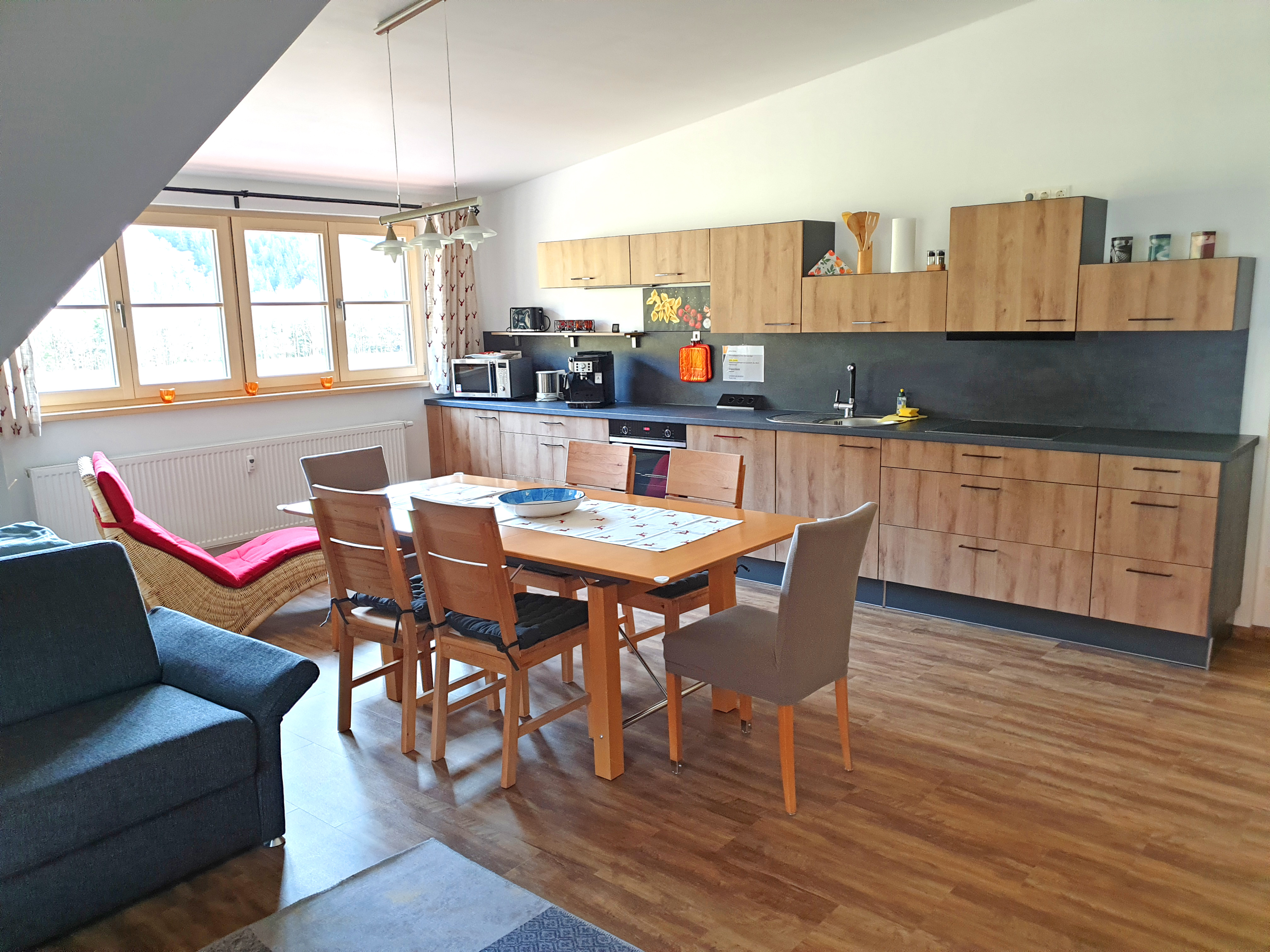 Sehr ruhig gelegene Ferienwohnung im 1. Stock, 73 qm mit leichter Mansarde und schönem Balkon mit Abendsonne. Die geräumige Wohnung verfügt über ein Schlafzimmer, ein Badezimmer mit Fenster, Dusche und Badewanne, Fön, sowie 2024 durch eine Gaube komplett neu gestalteter, großer Wohnraum mit erweiterter Küche, Ess- und Wohnzimmer und neuem Vinylboden.