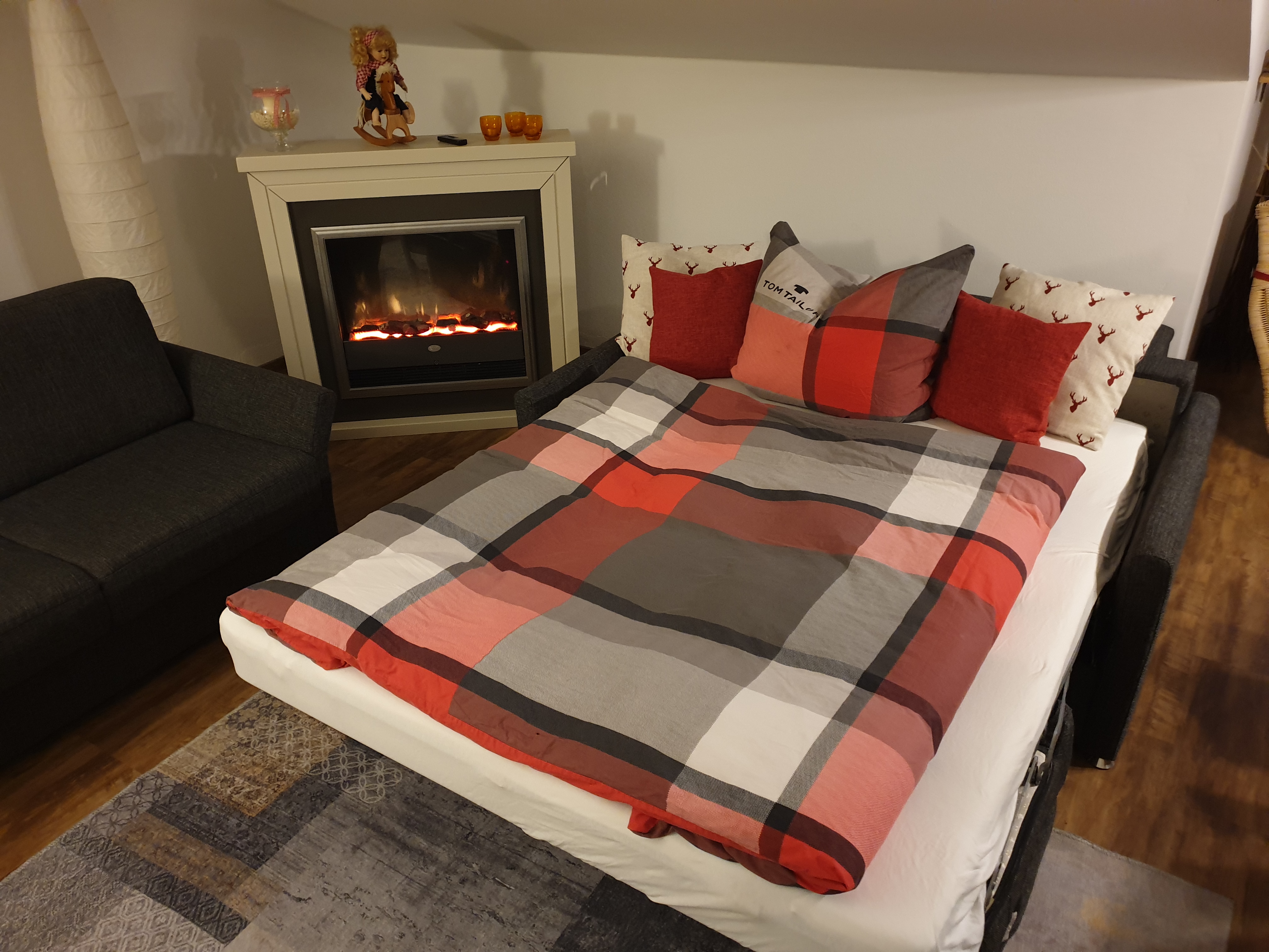 Das Schlafzimmer ist mit einem bequemen Doppelbett 1,8 m x 2 m ausgestattet und verfügt über einen Außenrollo zur kompletten Verdunkelung. Anfang 2025 wurde auch hier ein neuer Vinylboden verlegt. Auch steht jetzt im Schlafzimmer ein zweiter Fernseher (kein Antennenanschluss) mit Blu-ray Player (viele DVDs vorhanden) und Anschlussmöglichkeiten für einen TV-Stick zur Verfügung. Das Wohnzimmer bietet einen weiteren Schlafplatz mit einer einfach ausklappbaren Schlafcouch. Diese bietet eine Liegefläche von 1,5 x 2 m und sorgt durch einen Lattenrost und eine Matratze für erholsamen Schlaf. Alle Zimmer erreichen Sie über die geräumige Diele. Die Küche ist voll ausgestattet mit 4-Platten Herd, Backofen, Spülmaschine, Mikrowelle, Kaffeemaschine, Wasserkocher, Toaster und einer Kühl- Gefrierkombination. Der große Wohnbereich bietet neben der Küche eine Essgelegenheit für 4 Personen, sowie zwei gemütliche Sofas mit Blick auf den HD-Fernseher, kostenloses WLAN und Streaming fähiges Internet.