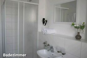 Jedes Zimmer verfügt über ein eigenes Duschbad,Fön, W-Lan, Fernseher, auf Wunsch täglich wechselnde Handtücher.