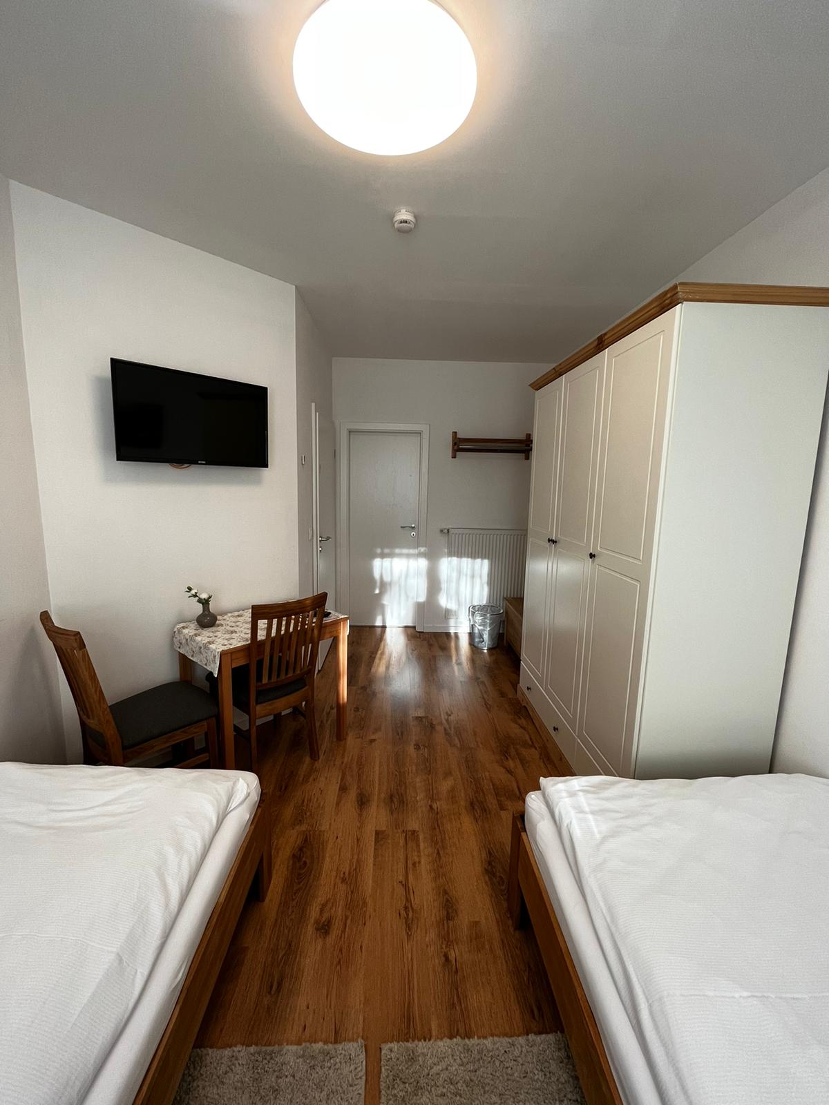 Das Zimmer verfügt über 2 Einzelbetten die bei Bedarf zusammen geschoben werden können.