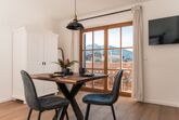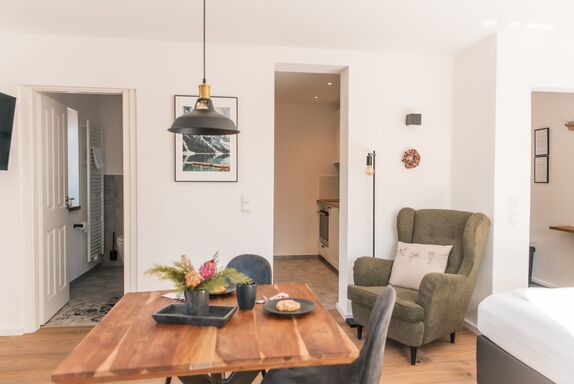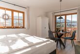Die Ferienwohnung Enzian liegt im 1. Obergeschoss und verfügt über einen traumhaften Blick auf das Unterberghorn, Fellhorn und in das Kasiergebirge. Der Blick in die Berge lässt sich auch aus dem kombinierten Wohn/Schlafraum genießen.