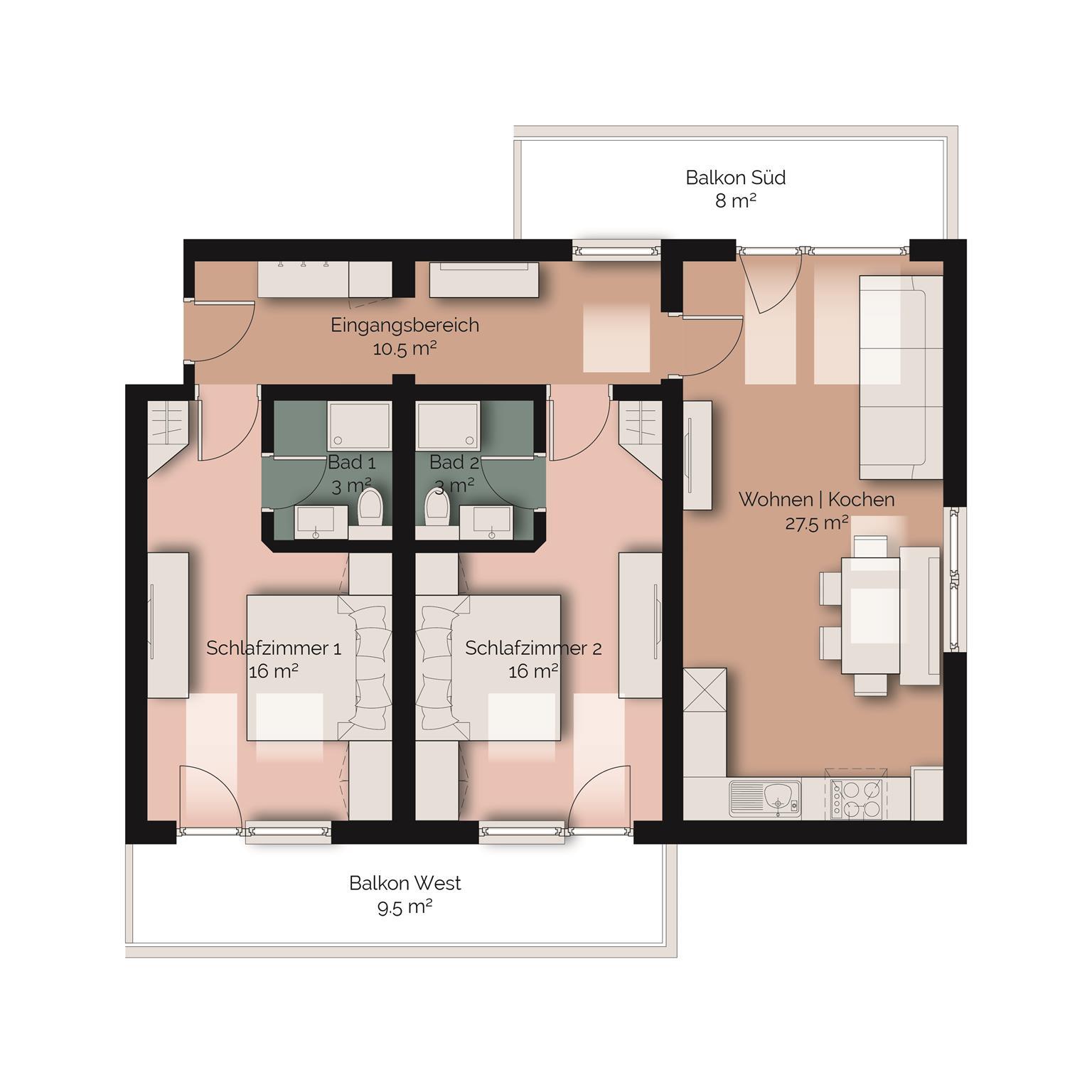 Das 80m² Appartement Berta verfügt über zwei Schlafzimmer mit eigenem Bad, komplett ausgestatte Wohnküche, sowie einem Ost- und einem West-Balkon. Es befindet sich im 1. Stock unseres Hauses.