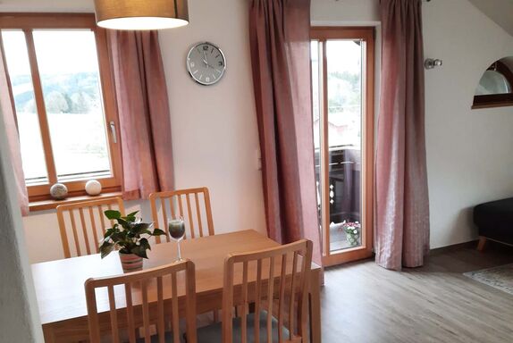 Die Ferienwohnung mit 45 qm befindet sich im 2. Stock auf einem Einzelhof mit herrlicher Alleinlage in der Nähe des Simssees. Vom Ostbalkon aus ist der Blick auf die Chiemgauer Berge besonders schön. Die Wohnung verfügt über eine voll eingerichtete Küche mit Kaffeemaschine, Toaster, Wasserkocher, Spülmaschine und Mikrowelle. Im separaten Schlafzimmer ist ein Safe vorhanden. Das Badezimmer verfügt über eine begehbare Dusche, einen Haartrockner und einen Handtuchheizkörper. Im Preis sind Handtücher und Toilettenpapier (ERSTAUSSTATTUNG) Bettwäsche und WLAN inkludiert. Für das Auto und die Fahrräder sind Stellplätze vorhanden.