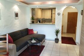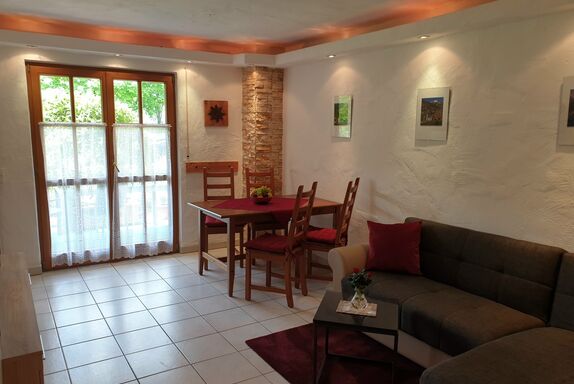 Gemütliche 2-Zimmer-Ferienwohnung im Herzen von Bischofswiesen, ca. 50 m² groß. Wohnzimmer mit Esstisch, Couch, offene Küche. Separates Schlafzimmer, Badezimmer. 15 m² große Terrasse mit Markise, Liegewiese.