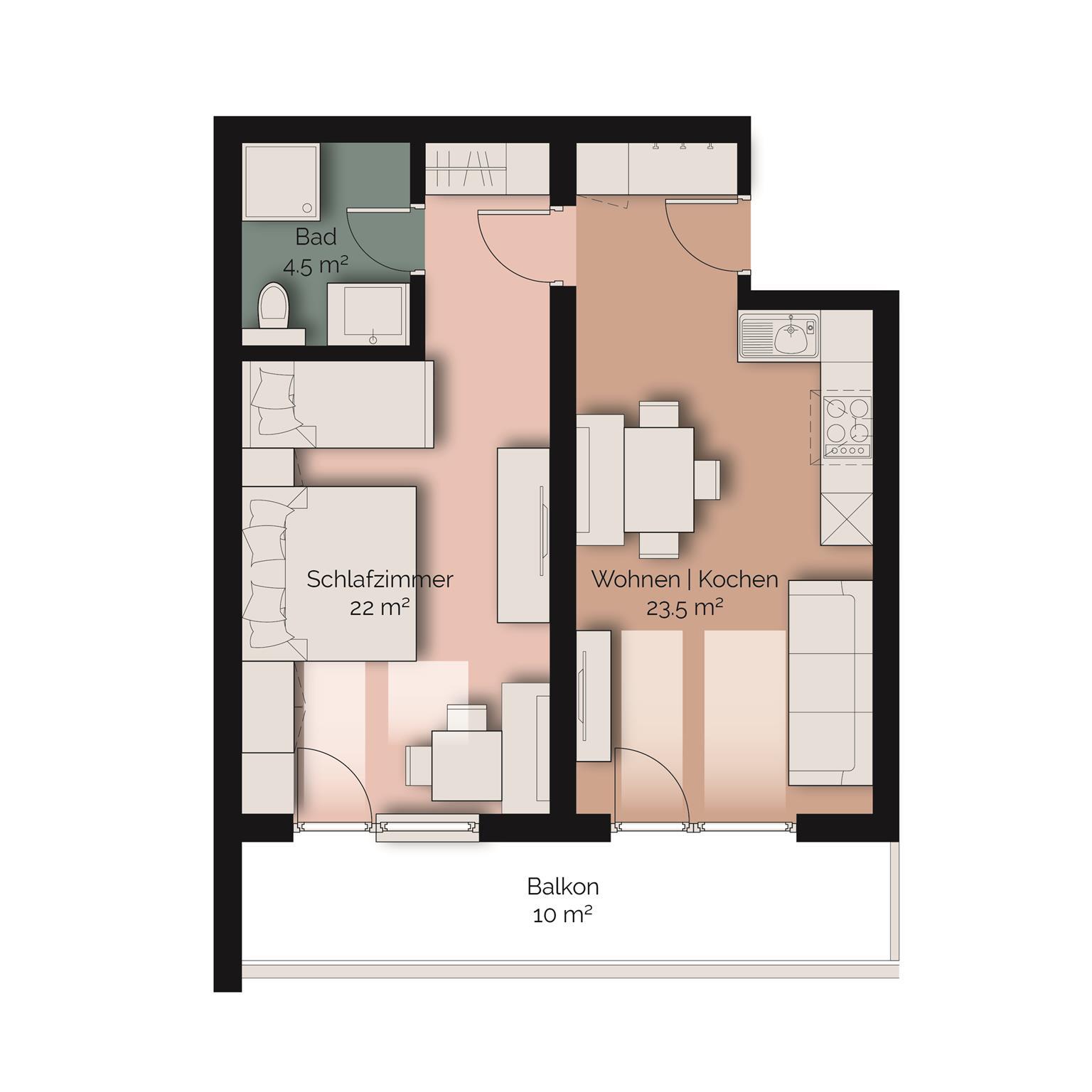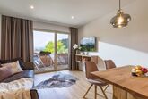 Das 50 m2 Appartement Alois verfügt über ein Schlafzimmer mit Doppelbett und Stockbett, komplett ausgestatter Wohnküche und einem westseitig ausgerichteten Balkon. Es befindet sich im 1. Stock unseres Hauses.