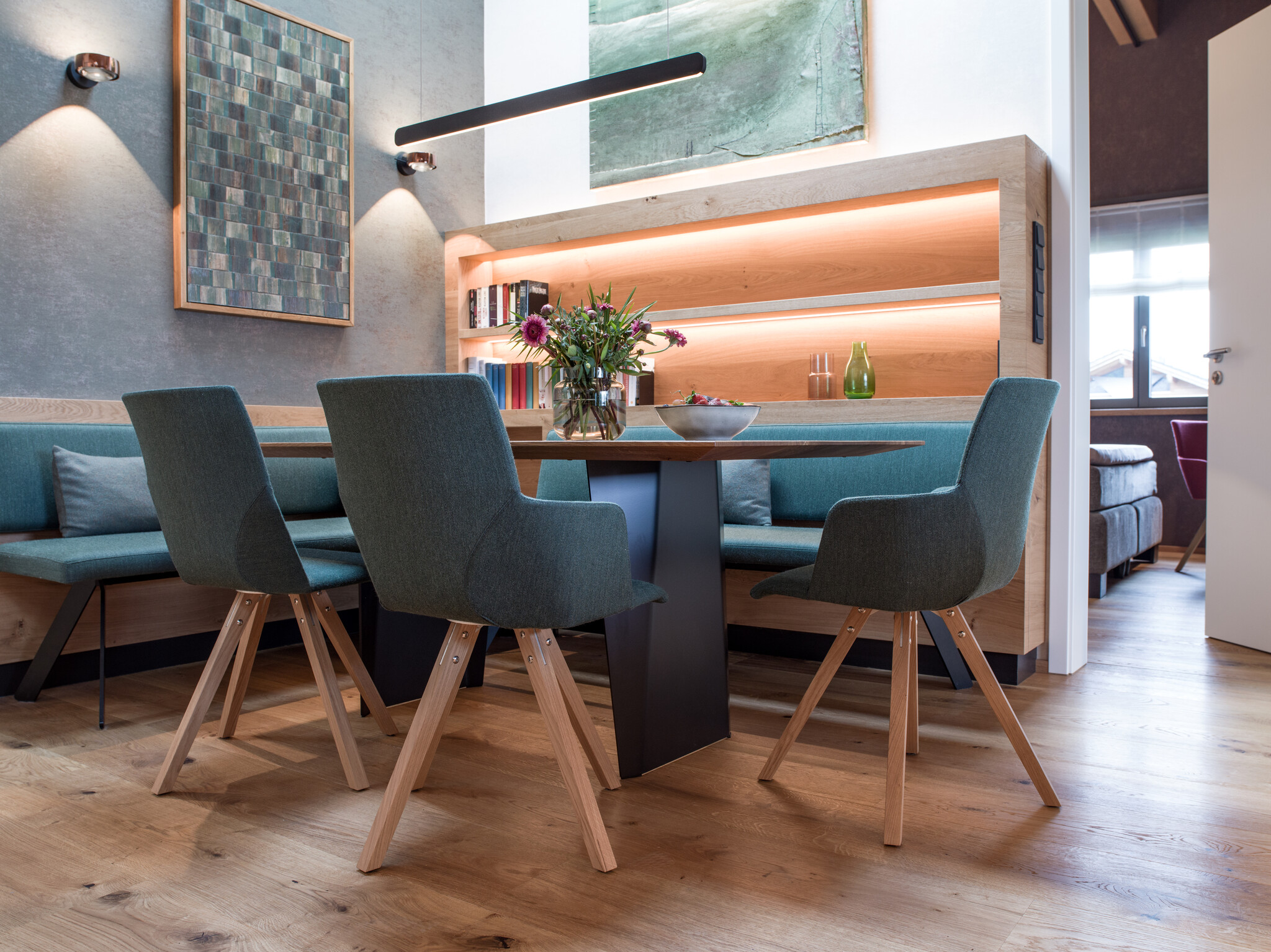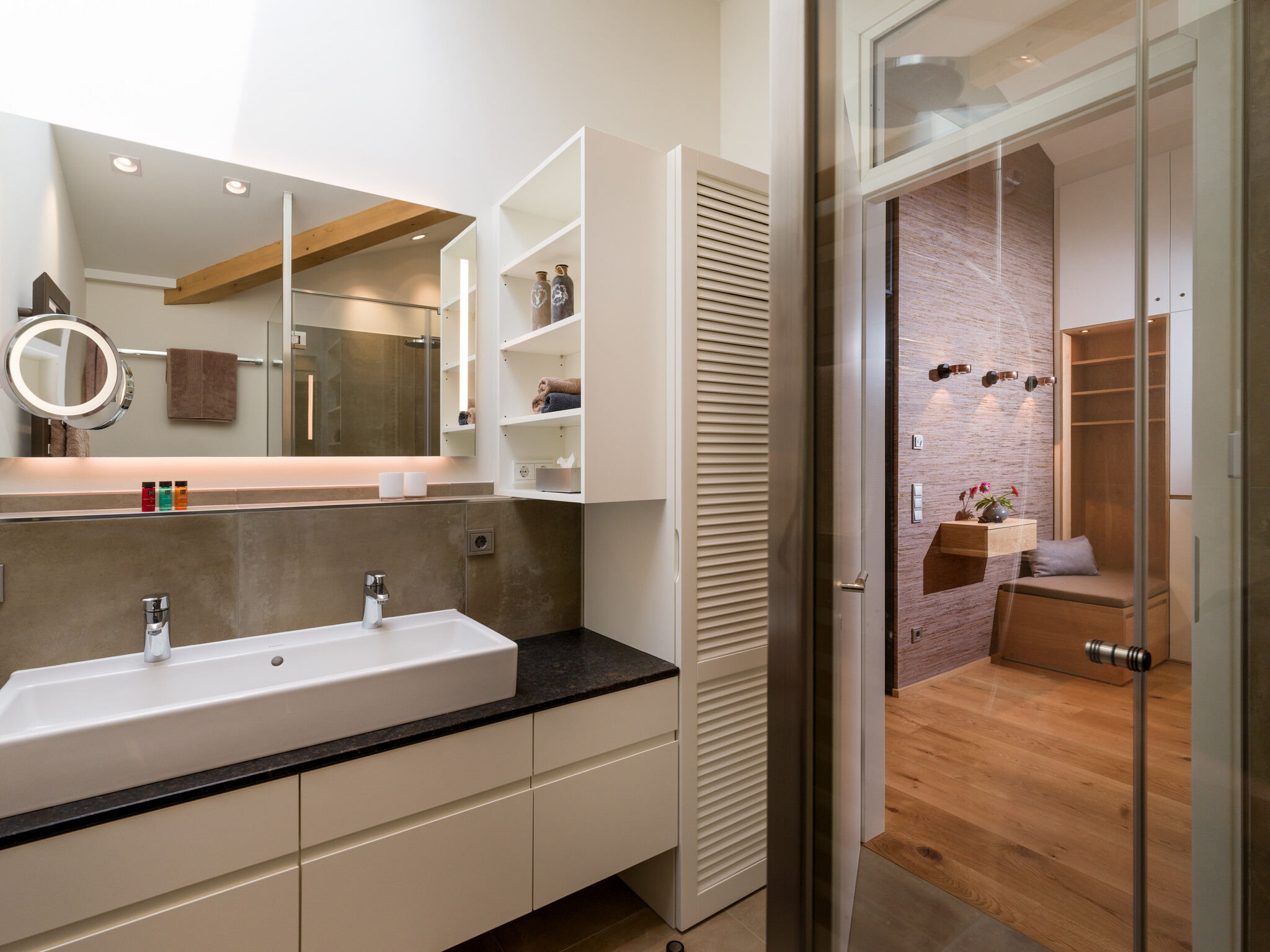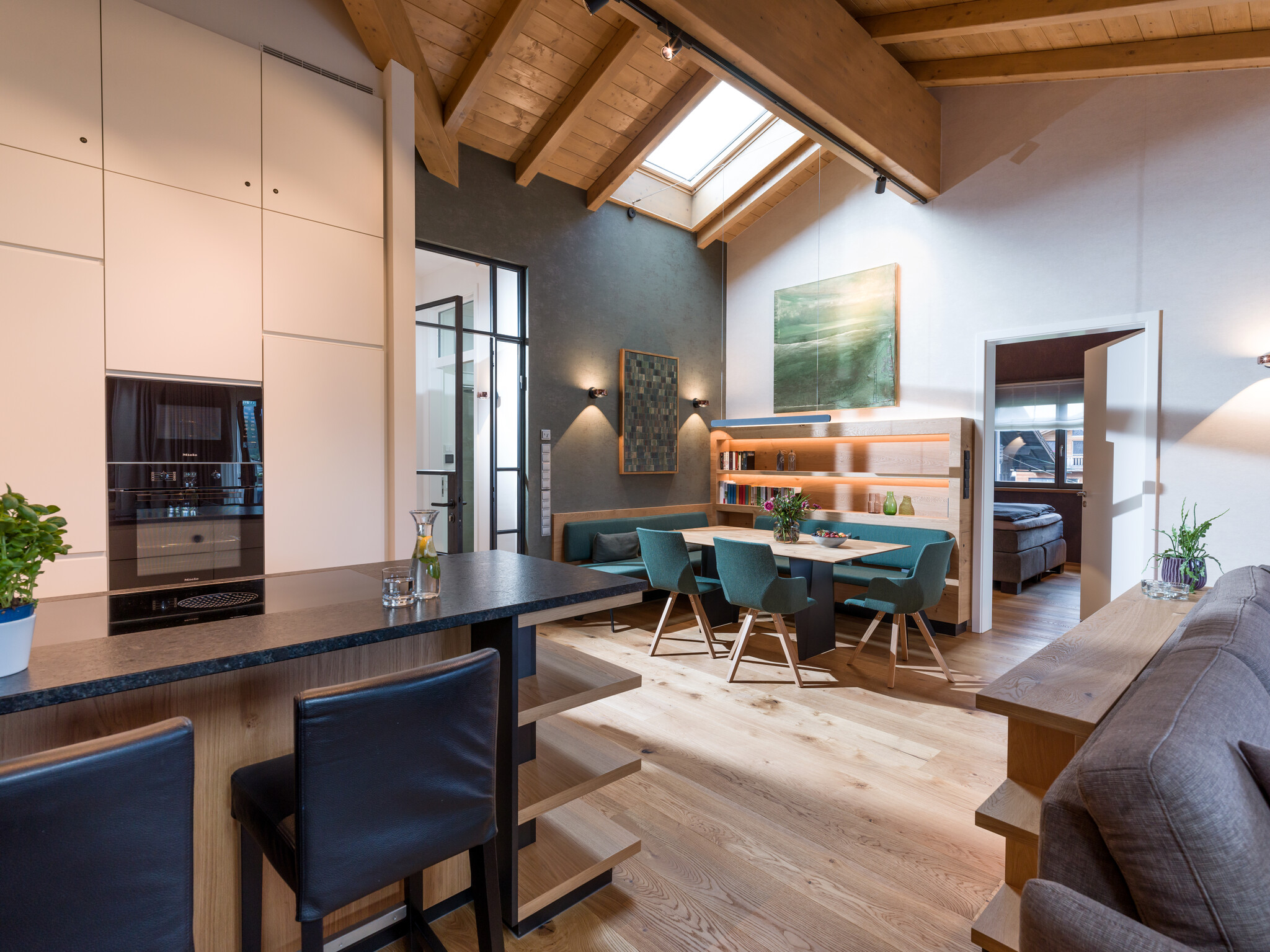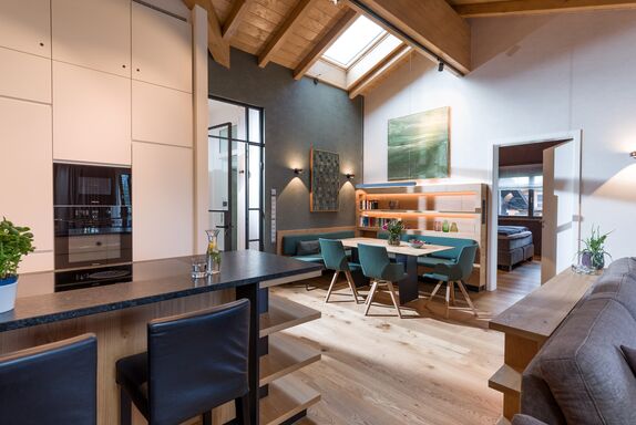 Exklusiver Alpin-Lifestyle für gehobene Ansprüche. Ankommen am Rückzugsort für Körper, Geist und Seele. Die 112 qm große lichtdurchflutete Wohnung im obersten Geschoss gibt mit ihren bis zu vier Meter hohen Decken viel Raum zum Wohlfühlen. Von der bequemen Couch aus kann man den freien Blick auf den WILDEN KAISER genießen. An kalten Tagen kann man von hier auch das prasselnde Feuer des Kamins und die ausstrahlende Wärme bei einem guten Wein und fesselnder Lektüre genießen. Eine große Essecke für bis zu 10 Personen lädt zu gemütlichen Abenden ein. Seinen Zweck erfüllend und dennoch stylisch geben die Badezimmer Raum für Ihr persönliches Wellness-Programm. Die von einem heimischen Saunabauer maßgefertigte Sauna, Bademäntel, für Sie bereit gelegt, und hochwertige Produkte für die Körperpflege lassen Sie den Alltag vergessen. Die von einem heimischen Schreiner eigens angefertigten Möbel, individuelles Design, hochwertige Materialien und liebevolle Details geben der Wohnung ein einzigartiges Flair. Zusammen mit dem Eichenboden schafft sich eine Atmosphäre zum Wohlfühlen auf höchstem Niveau. Ein durchdachtes Lichtkonzept gibt der Wohnung den richtigen Glanz. Durch individuell dimmbare Lampen von Occhio und Molto Luce können Sie sich Ihr ganz persönliches Lichtambiente schaffen. Gemütlich eingerichtete Schlafzimmer mit hochwertigen Boxspringbetten, mehrere Kissen, kuschelige Decken und Rollläden sorgen für guten Schlaf. Die vollintegrierte Küche ist mit hochwertigen E-Geräten und dem nötigen Equipment ausgestattet, damit Sie auch in Ihrem Urlaub mit viel Liebe und Herz kochen können. Und falls Sie in Zeiten, in denen die Grenzen zwischen beruflichem und privatem Leben fließender geworden sind, in der Wohnung auch mal berufliche Dinge erledigen müssen: In den Schlafzimmern und im Wohnzimmer haben wir für Sie drei Arbeitsplätze mit LAN-Verkabelung und schnellem Internet eingerichtet.