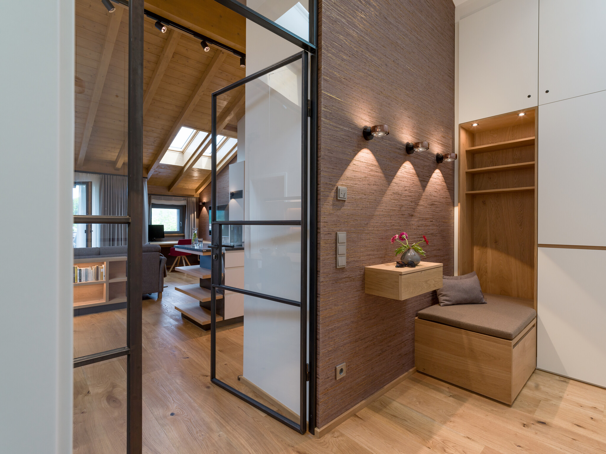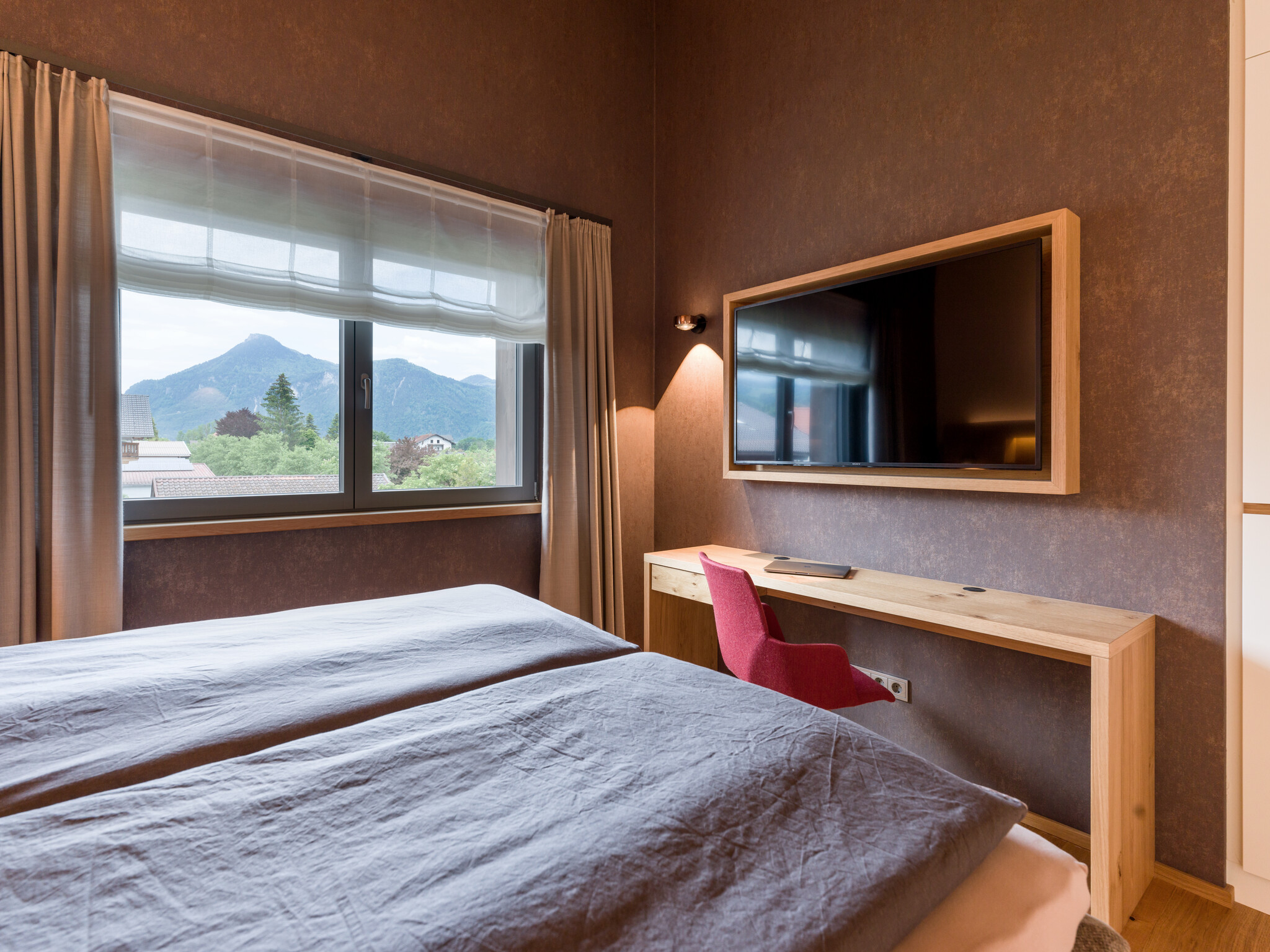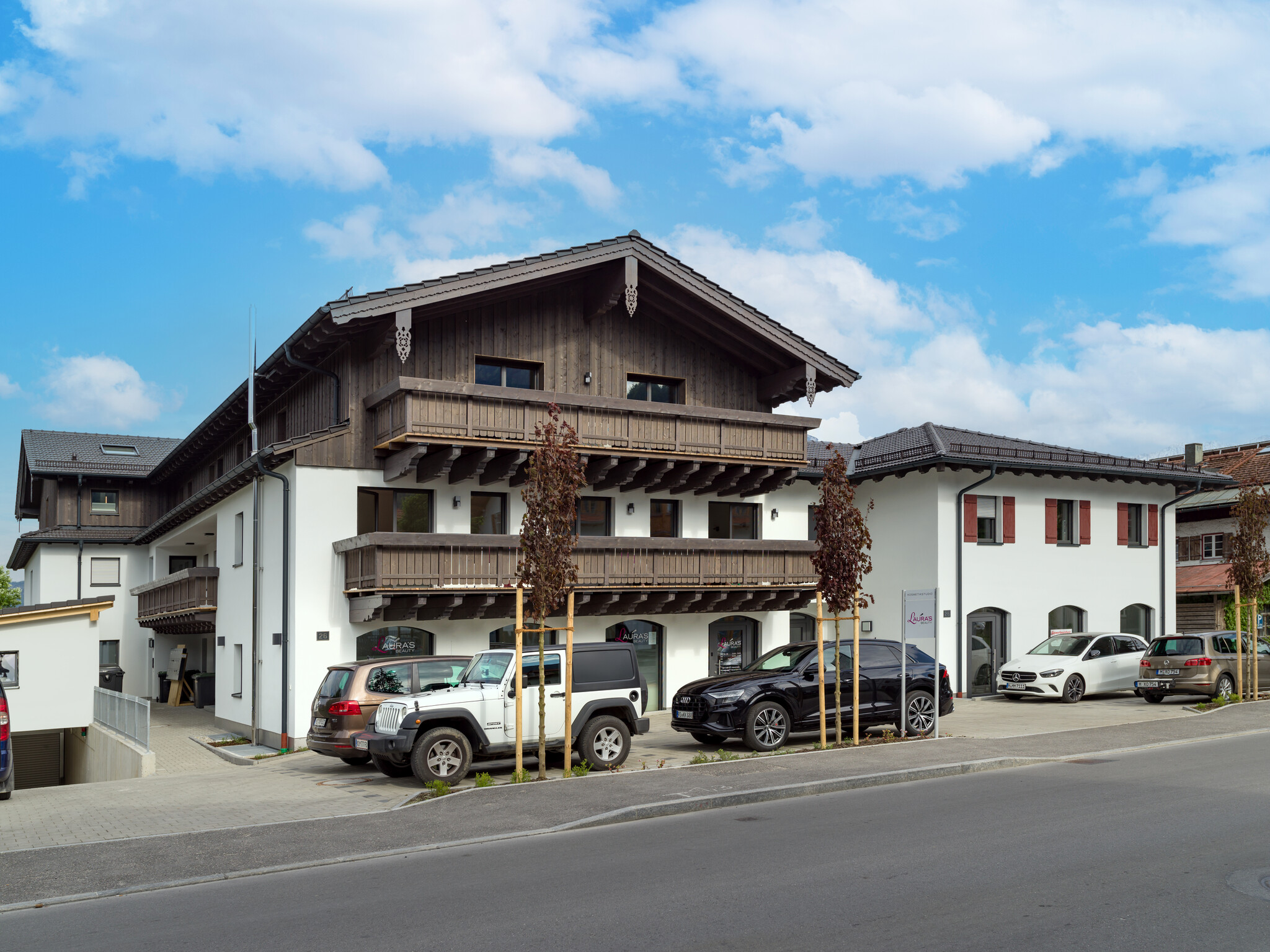 Exklusiver Alpin-Lifestyle für gehobene Ansprüche. Ankommen am Rückzugsort für Körper, Geist und Seele. Durch seine zwar regional typische, gleichwohl moderne Bauweise in Massivholz fügt sich das Gebäude harmonisch in den Ortskern von Oberaudorf ein. Die Anlage verfügt über eine eigene Photovoltaikanlage, mit der der Strom für die insgesamt 15 Wohnungen erzeugt wird. Massivholzhäuser benötigen bekanntlich deutlich weniger Heizenergie. Denn der Baustoff Holz hat sehr gute selbstregulierende Isoliereigenschaften. Im Winter dringt kaum Energie nach draußen, im Sommer kaum Hitze nach innen. Die Holzbauweise ist zudem für Allergiker und Asthmatiker gesundheitsfördernd. Holz kann Feuchtigkeit aufnehmen und abgeben (offenporige Struktur), sodass das Klima selbstständig auf 45 – 55 % Luftfeuchtigkeit reguliert wird. Das schafft eine gesundheitsfördernde Umgebung und hat beruhigende Wirkung auf die Atemwege. Die 112 qm große lichtdurchflutete Wohnung im obersten Geschoss gibt mit ihren bis zu vier Meter hohen Decken viel Raum zum Wohlfühlen. Die Lage wie auch die eingebauten Schallschutzwände und -türen (zwischen Wohn- und Ruhebereich) und die raumakustischen Maßnahmen verhindern störende Geräusche. Das Refugium verfügt neben der Lage und dem herausragenden Blick auch über eine Terrasse, einen Tiefgaragen-Stellplatz, einen hohen technischen Standard, schnelles WLAN/LAN, Fußbodenheizung, Wellnessbereich (Sauna, Regendusche), eine voll ausgestattete Küche mit exklusiven E-Geräten, große Fernseher in allen Wohn- und Schlafräumen sowie einen Kamin. Zu den verwendeten Materialien gehören Eichenholz, Natursteinplatten und Textiltapeten.