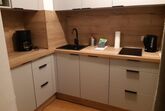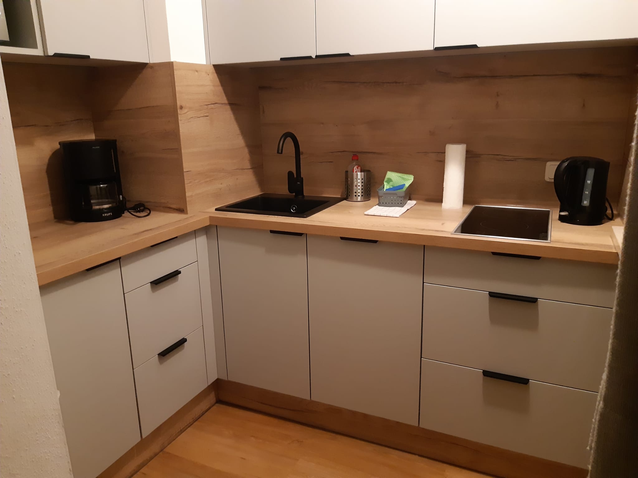 Vollausgestattete Küche mit Kaffeemaschine, Wasserkocher, Kühlschrank mit Gefrierfach, Geschirrspüler, Mikrowelle und 2-Zonen-Cerankochfeld