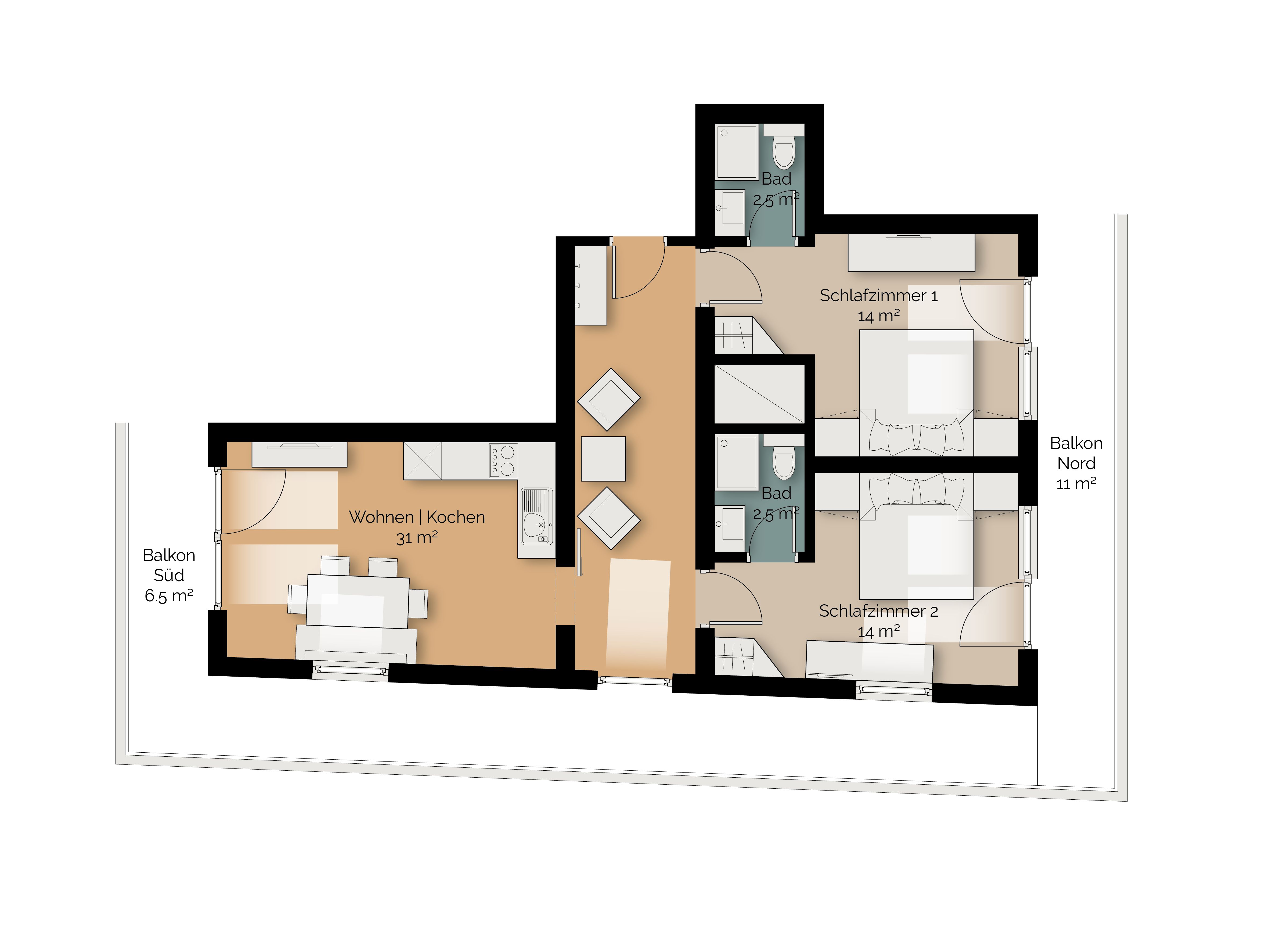 Das 65m² Appartement Gabi verfügt über zwei Schlafzimmer mit eigenem Bad, komplett ausgestatte Wohnküche, sowie einem Süd- und einem Nord-Balkon. Es befindet sich im 2. Stock unseres Hauses.