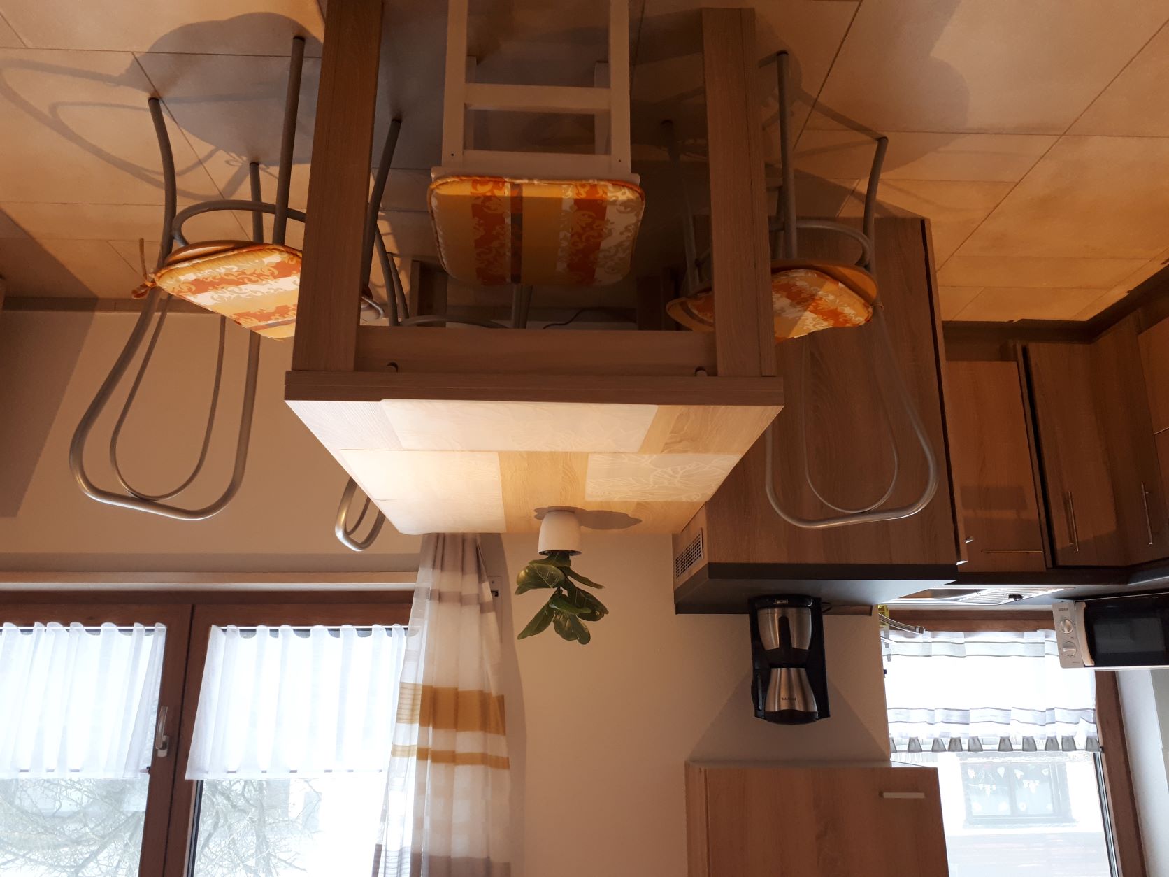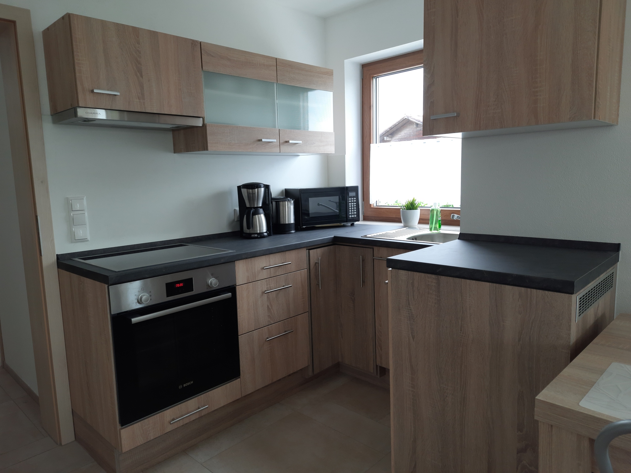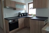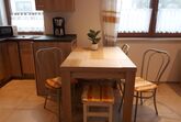 Küchenzeile mit E-Herd mit Ceranfeld, Backrohr, Kühlschrank mit großem Gefrierfach, Mikrowelle, Kaffeemaschine, Wasserkocher, Toaster, Essbereich mit ausziehbarem Esstisch,