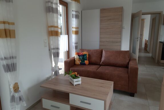 Neubau-Ferienwohnung mit Lüftung und Bodenheizung, durch Rollläden, dreifach verglaste Fenster und gutes Mauerwerk angenehm kühle Wohnung, 43 m² groß mit zusätzlicher Terrasse 15 m²,