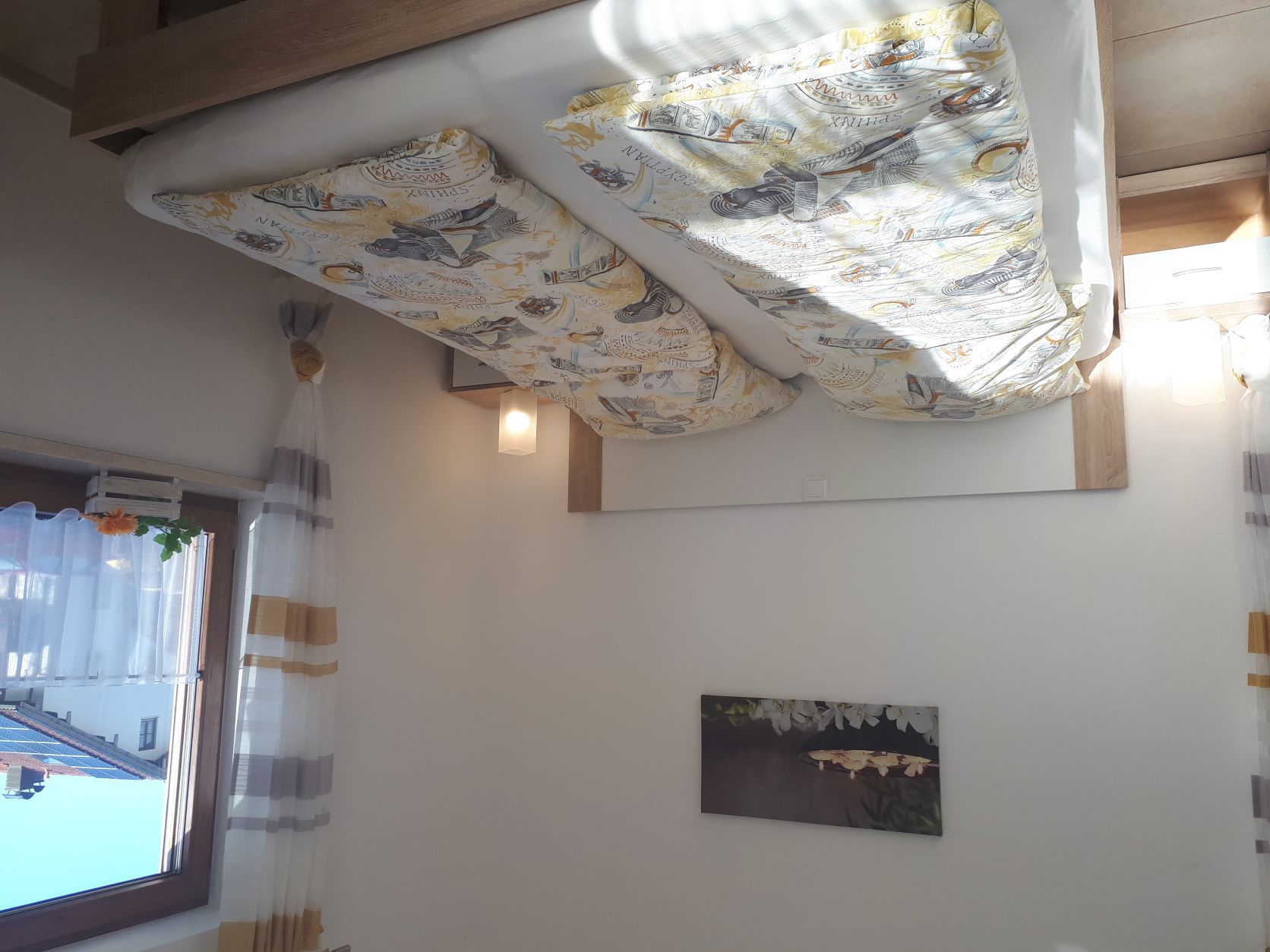 Durch halbhohen Raumteiler vom Wohnraum getrennter Schlafraum für 2 Personen,