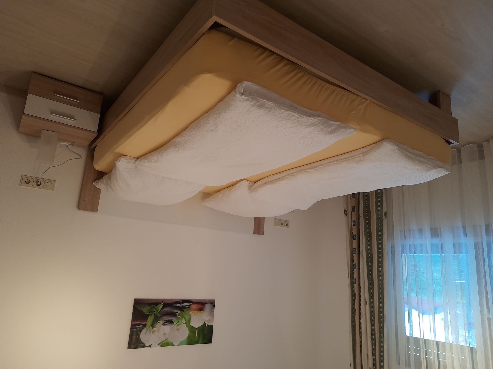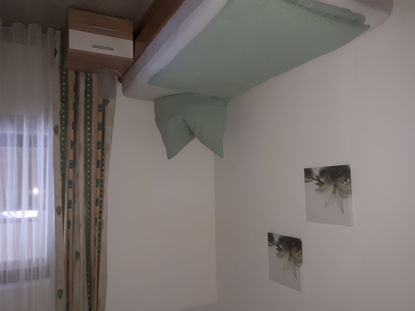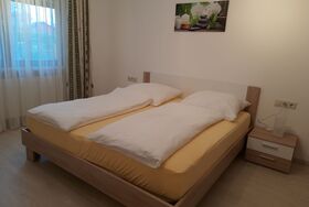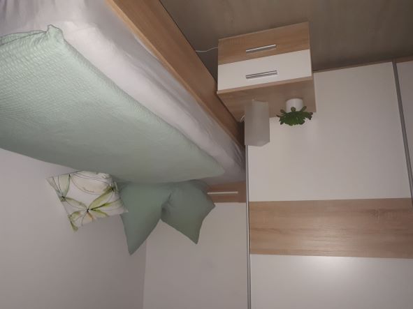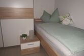 Die FeWo hat ein großes Schlafzimmer mit 1 Doppelbett (können auch 2 Einzelbetten daraus gemacht werden) und zwei Einzelbetten.