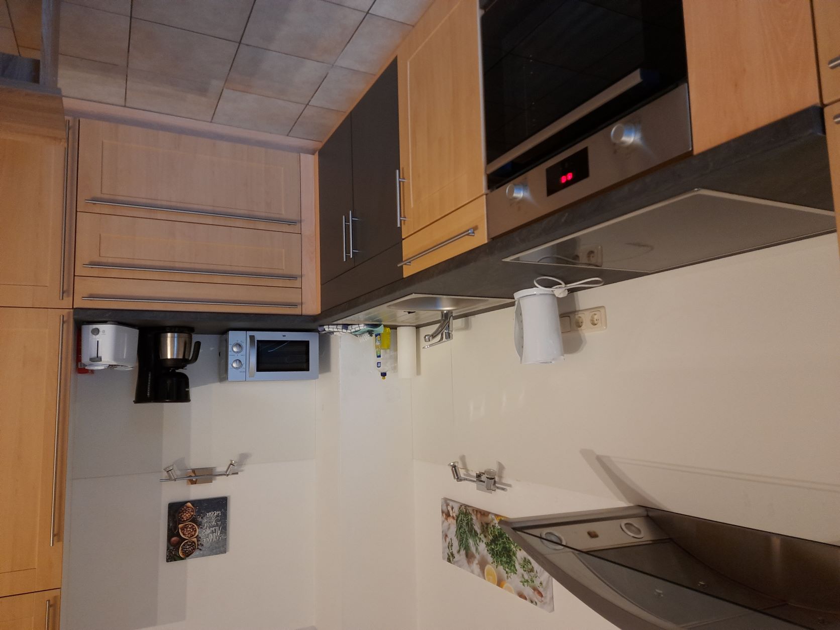 Die Küche ist voll ausgestattet mit E-Herd mit Ceranfeld und Backrohr, großem Kühlschrank mit integriertem Gefrierschrank, Mikrowelle, Kaffeemaschine, Wasserkocher und Toaster.