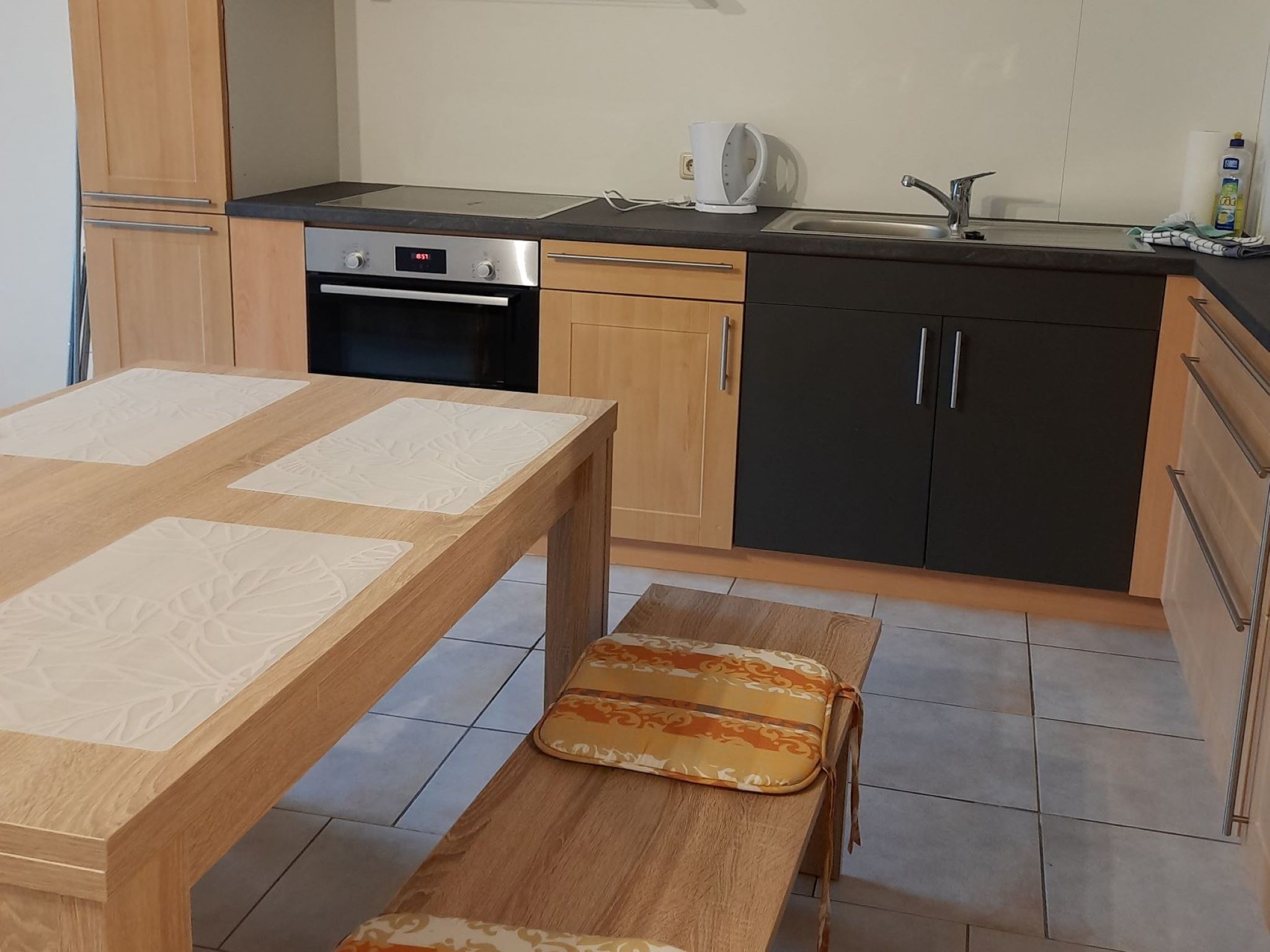 Der offene Wohnraum ist mit Raumteiler in eine Küche mit großem Esstisch und einen Wohnraum unterteilt.