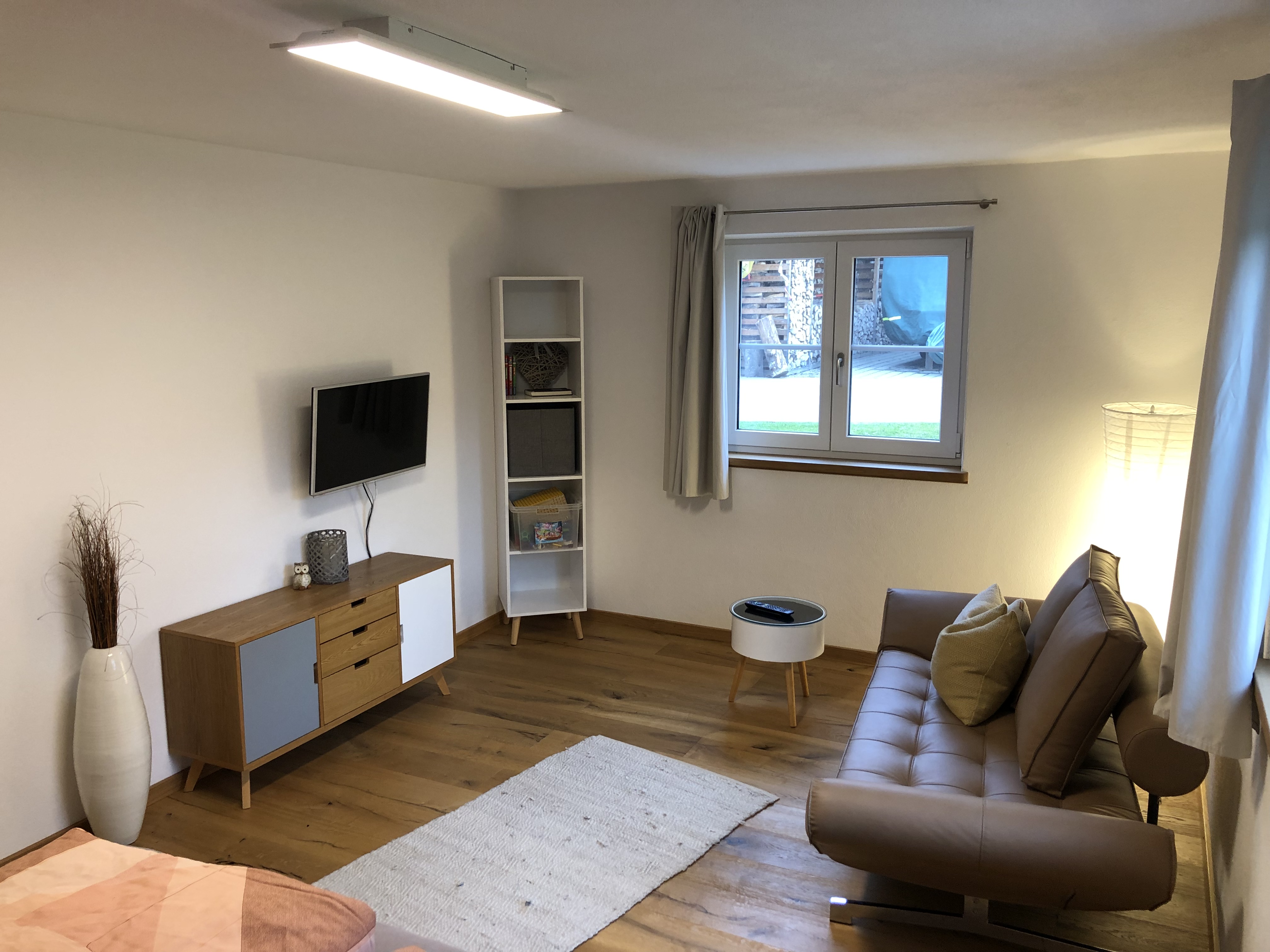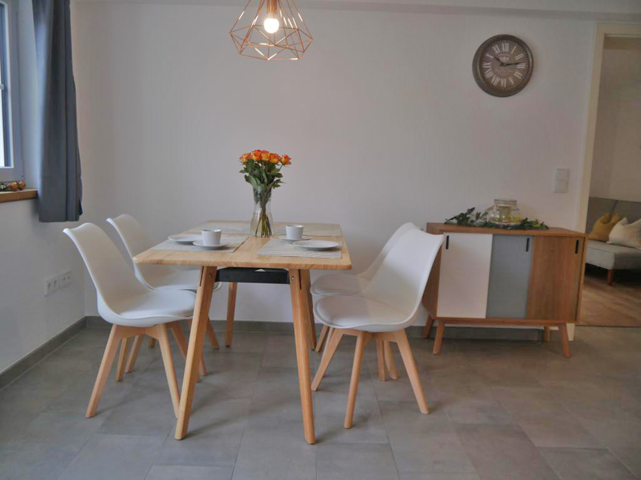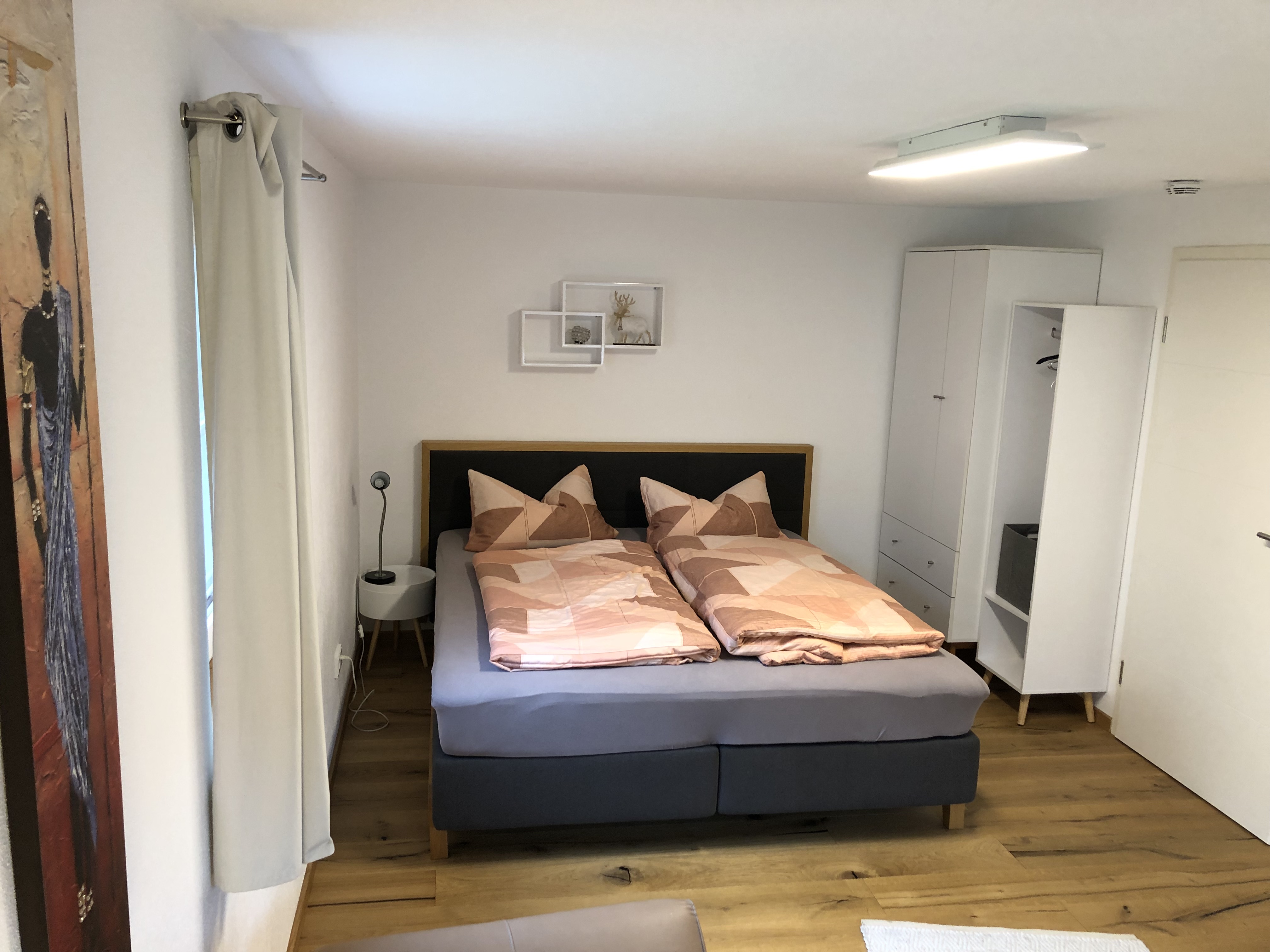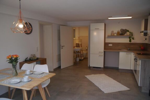 Die Ferienwohnung befindet sich in unserem Einfamilienhaus. Sie umfasst 40qm mit separatem Eingang und ist eine 1,5 Zimmer Ferienwohnung. Im ersten Raum befindet sich die Wohnküche mit Essecke. Angrenzend befindet sich das Wohn- Schlafzimmer mit Doppelbett und Schlafsofa. Zudem besitzt die Wohnung ein modernes Bad mit begehbarer Dusche und Fenster dieses ist aber ohne Tageslicht. Eine eigene Terrasse bietet Ihnen Verweilmöglichkeiten im Freien. Ein Parkplatz steht ihnen direkt am Objekt zur Verfügung.