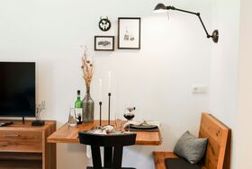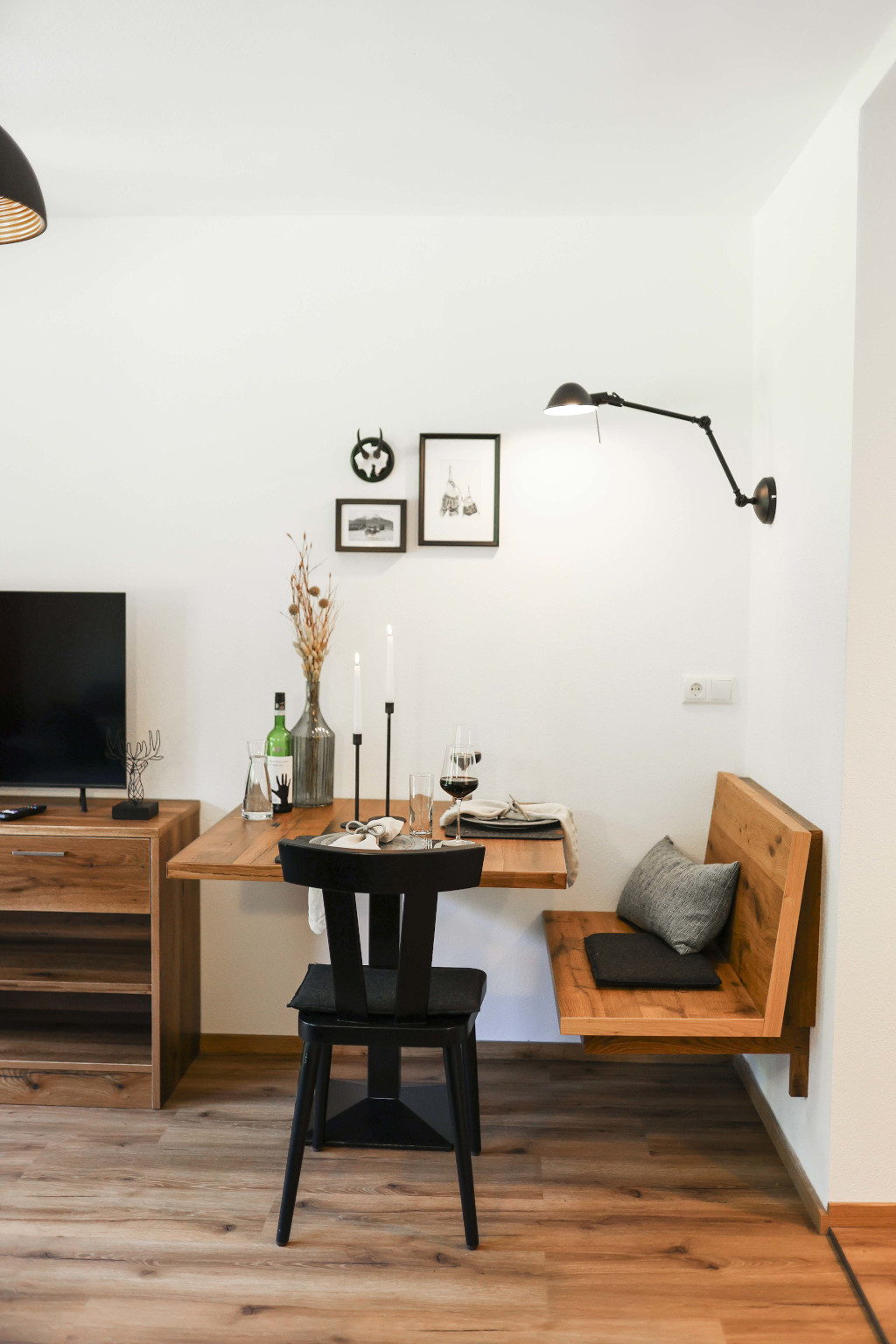 Die Ferienwohnung Kehlstein mit ca. 40 qm liegt im ersten Stock. Sie bietet Platz für bis zu zwei Personen. Ein Schlafzimmer mit Dusche / WC / TV, gemütlichem Wohn- Essbereich mit TV, offener Küche und ein Balkon sind vorhanden.