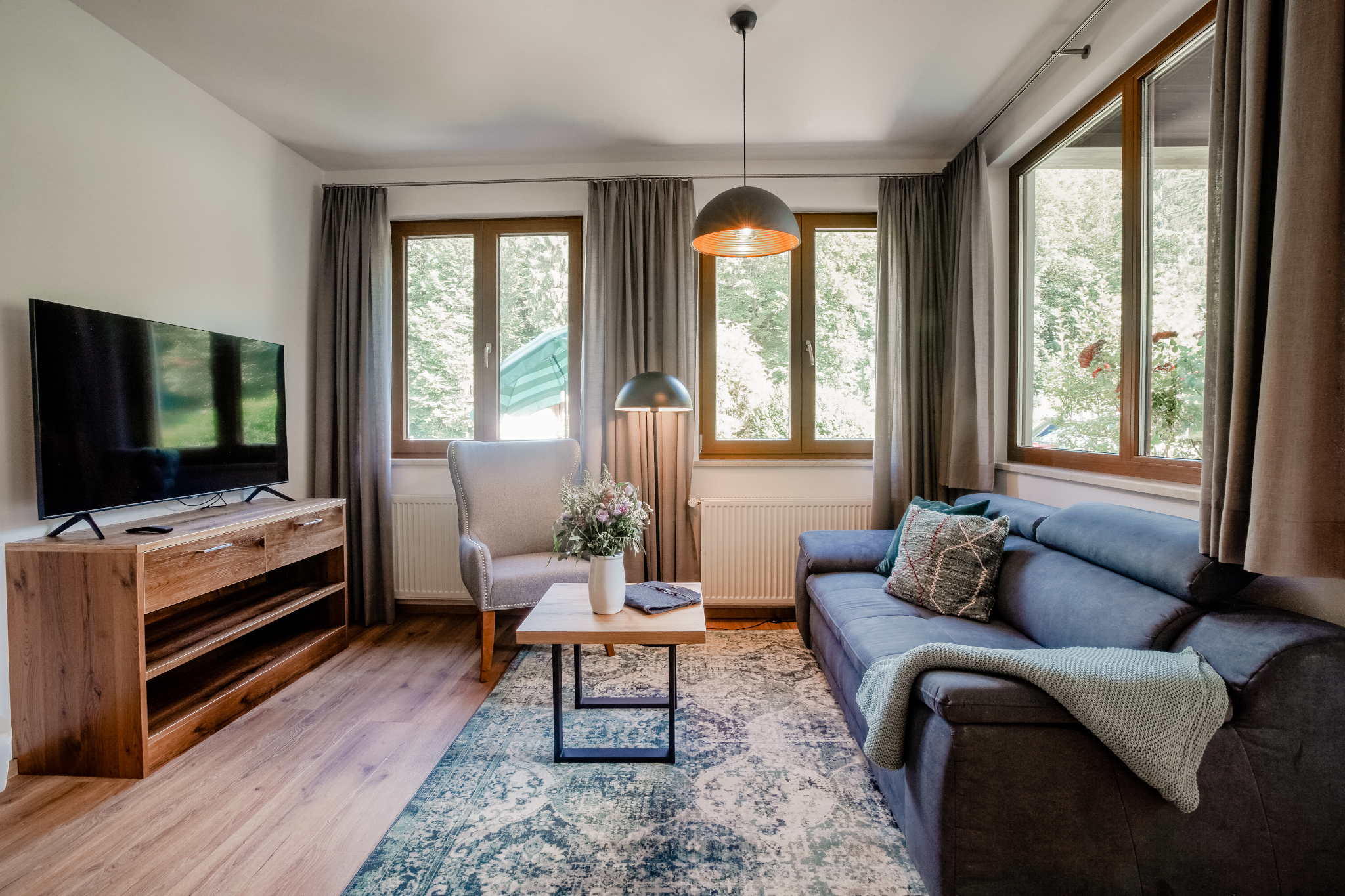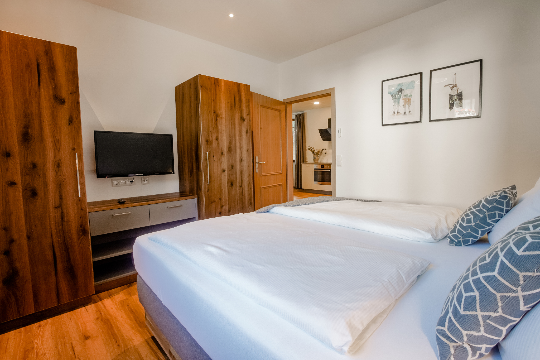 Die Ferienwohnung Königssee mit ca. 70 qm liegt im Erdgeschoss. Sie bietet Platz für bis zu vier Personen. Zwei Schlafzimmer mit Dusche / WC / TV, gemütlichem Wohn- Essbereich mit TV, offener Küche und eine eigene Terrasse sind vorhanden.Eine separate Suite für zwei Personen ist zu buchbar.