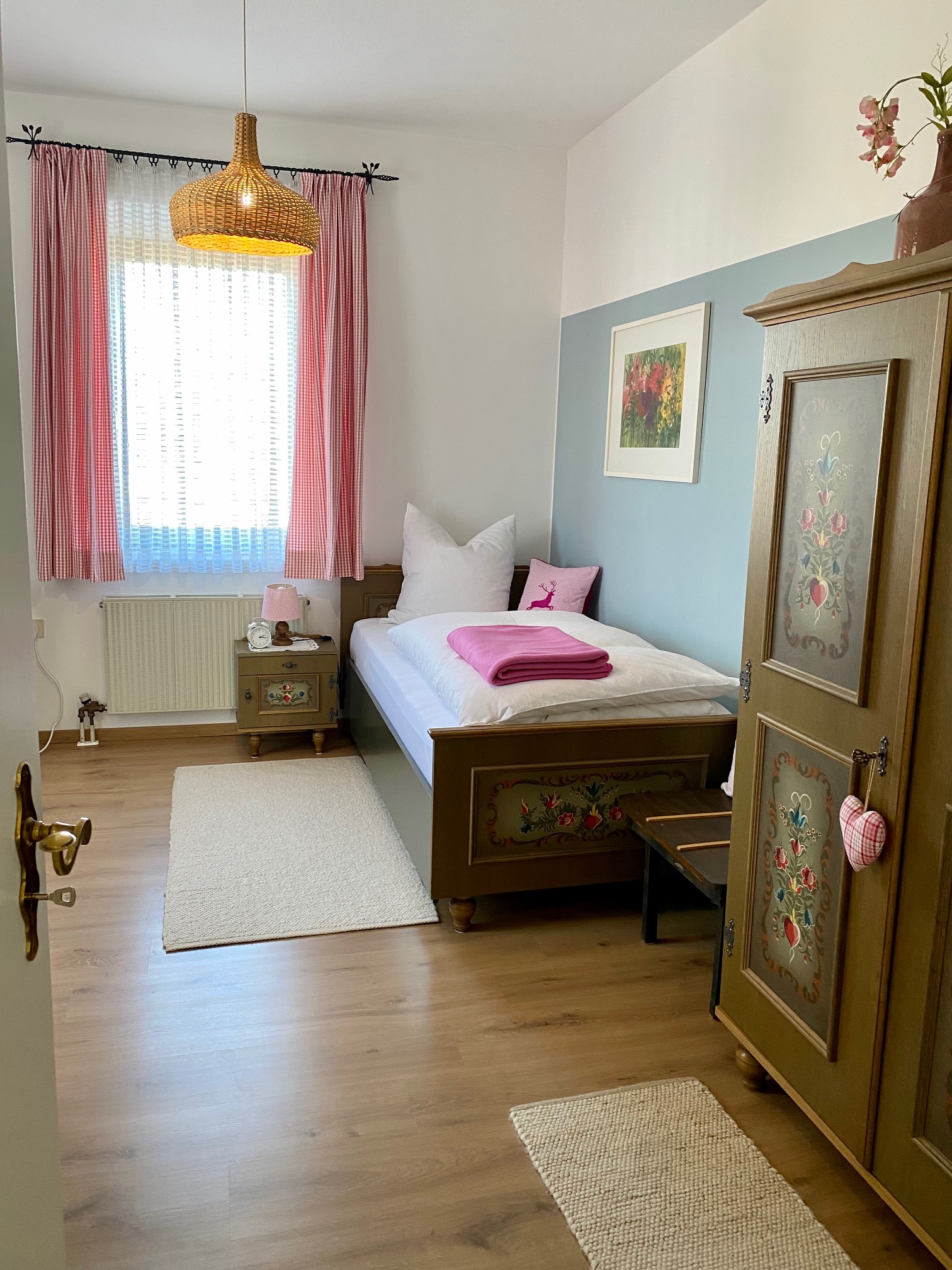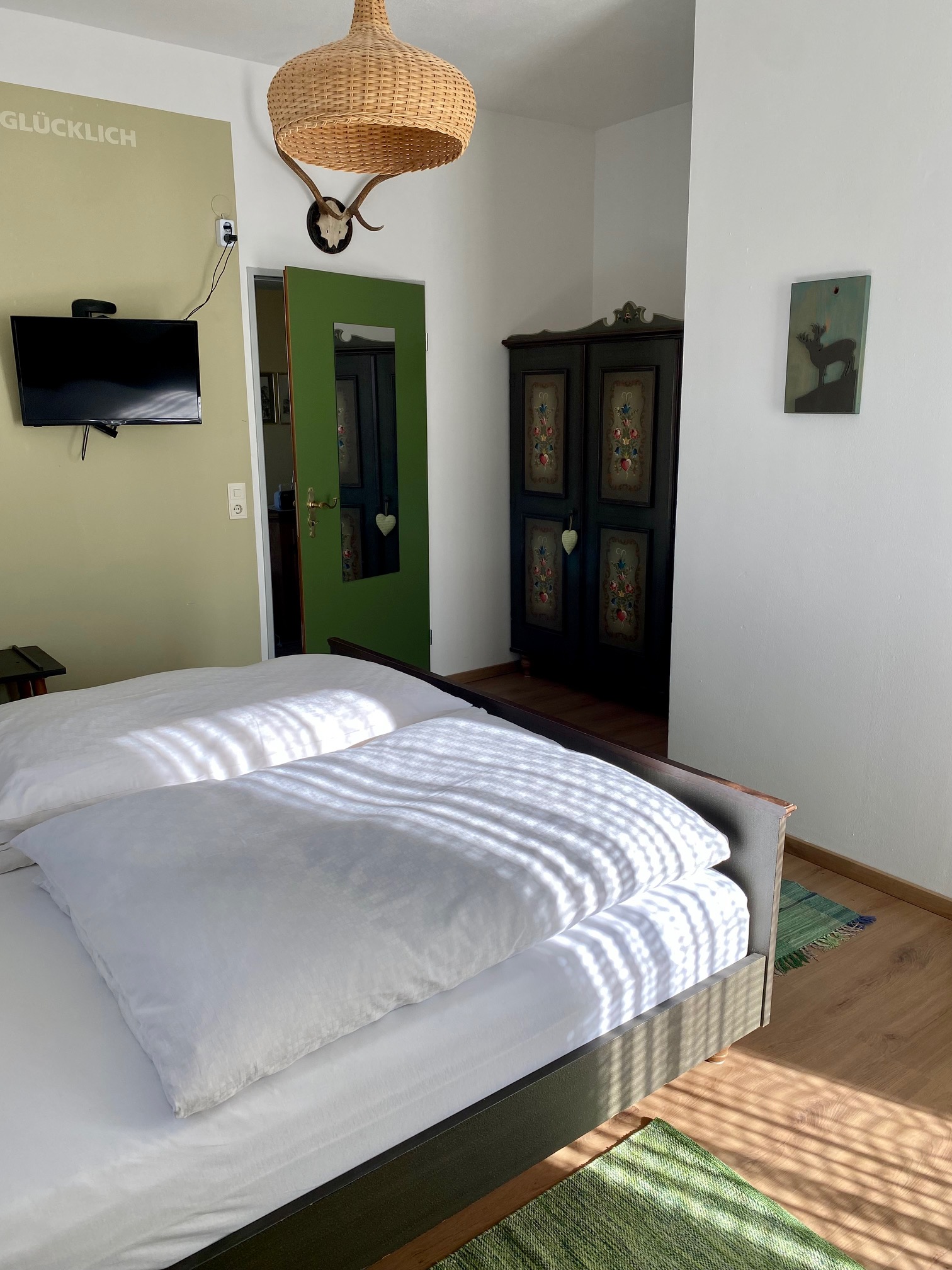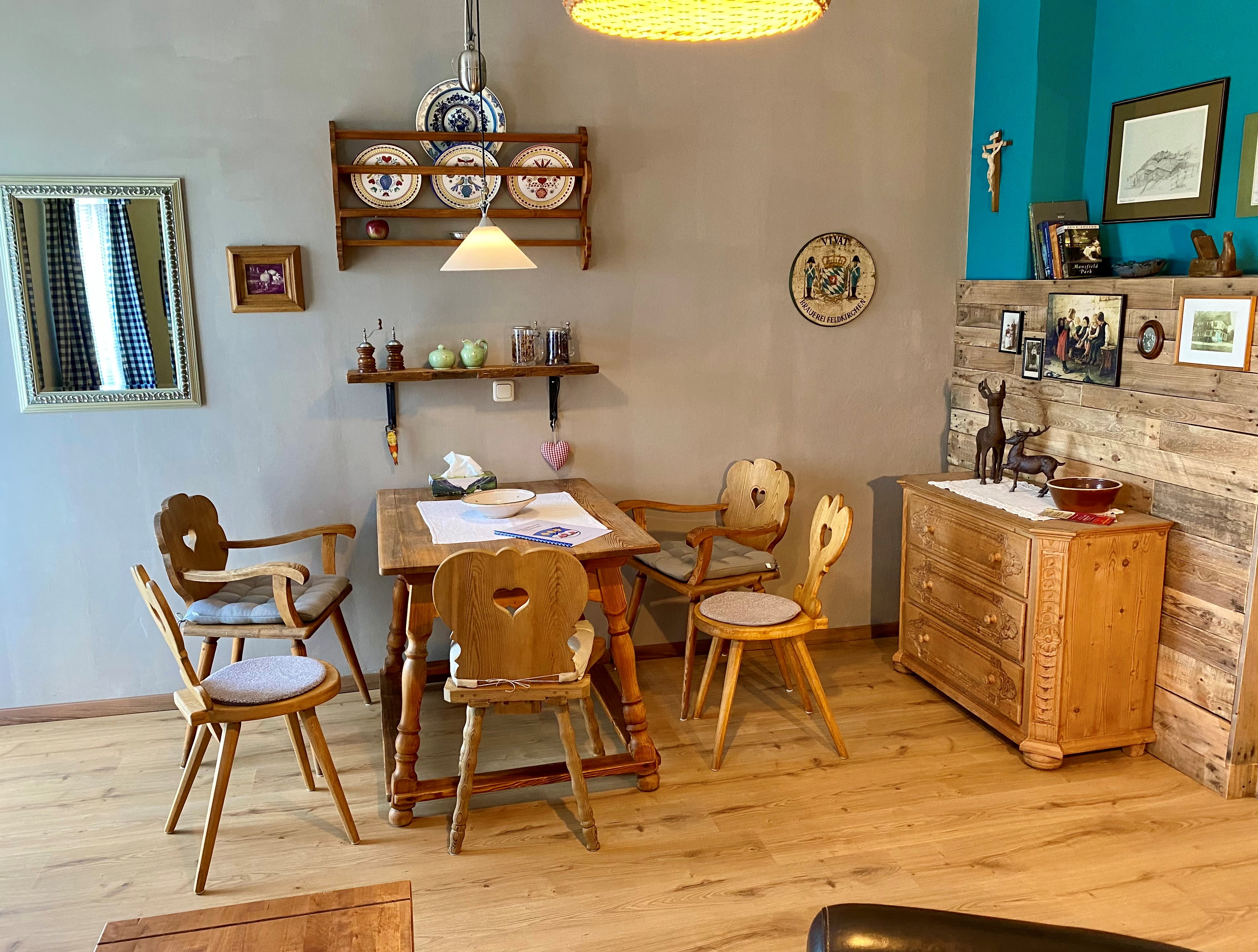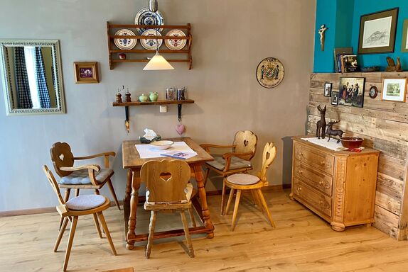 Schöne, gepflegte, geräumige 90m² große 3 Zimmer Ferienwohnung im bayerischen Stil im 1. OG. 3 Balkone mit Sitzgelegenheiten, 2 Schlafzimmer mit je einem Bad / Dusche / WC. 1 Schlafzimmer mit Doppelbett und das 2te Schlafzimmer mit Einzelbett (Zustellbett und ein Baby-Gitterbett ist möglich). In jedem Zimmer befindet sich ein Flachbild TV. Das Wohnzimmer ist mit einer bayerischen Essecke ausgestattet. Die moderne Küche verfügt über einen Geschirrspüler, Backofen, Ceranfeld, Kühlschrank mit Gefrierfach. In der Diele befindet sich ein Garderobenschrank, es gibt einen Abstellraum und kostenloses WLAN. Im Haus befindet sich eine Damenboutique.