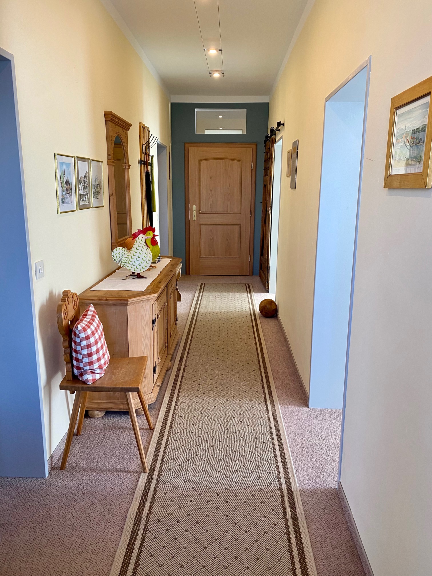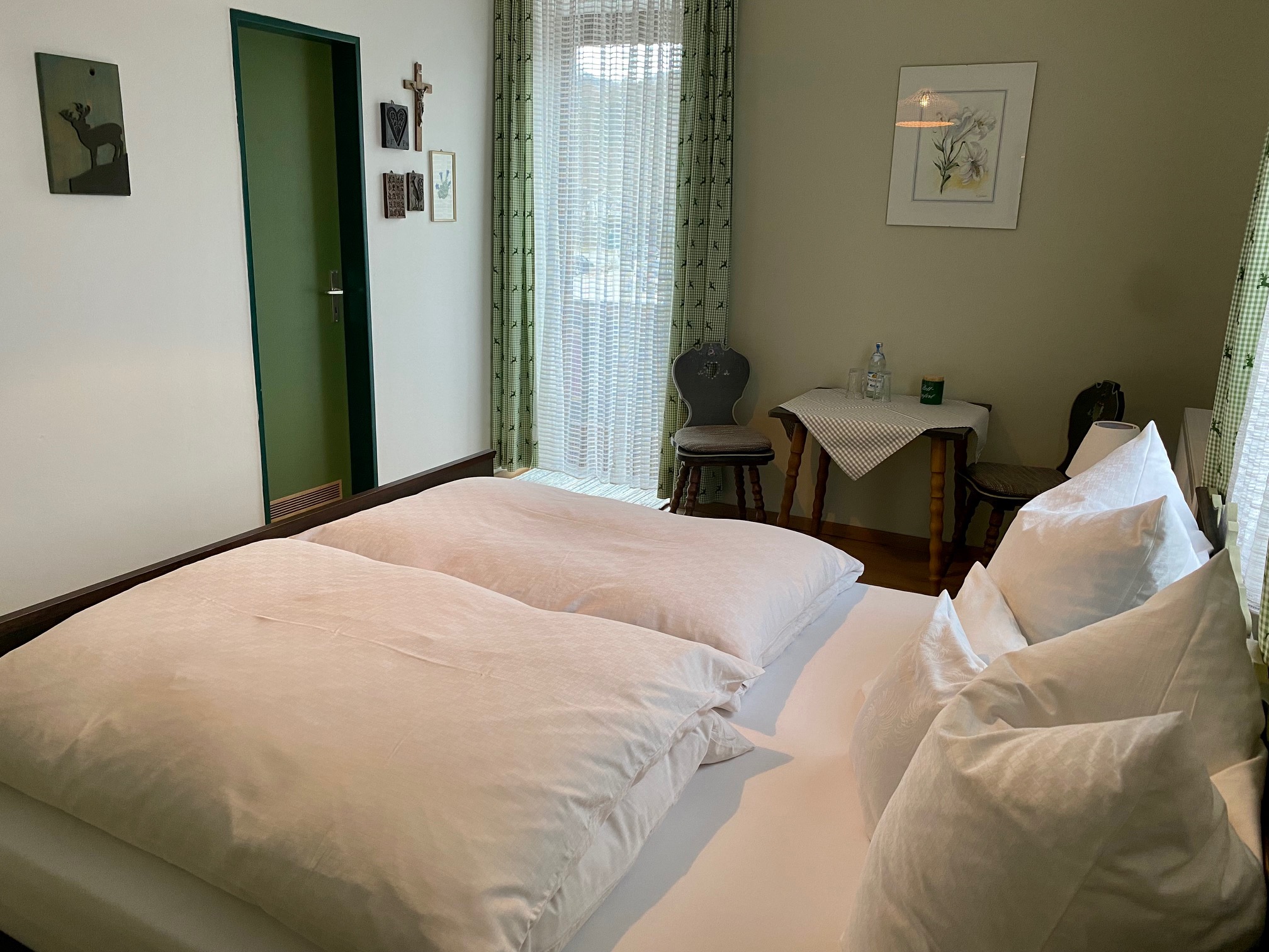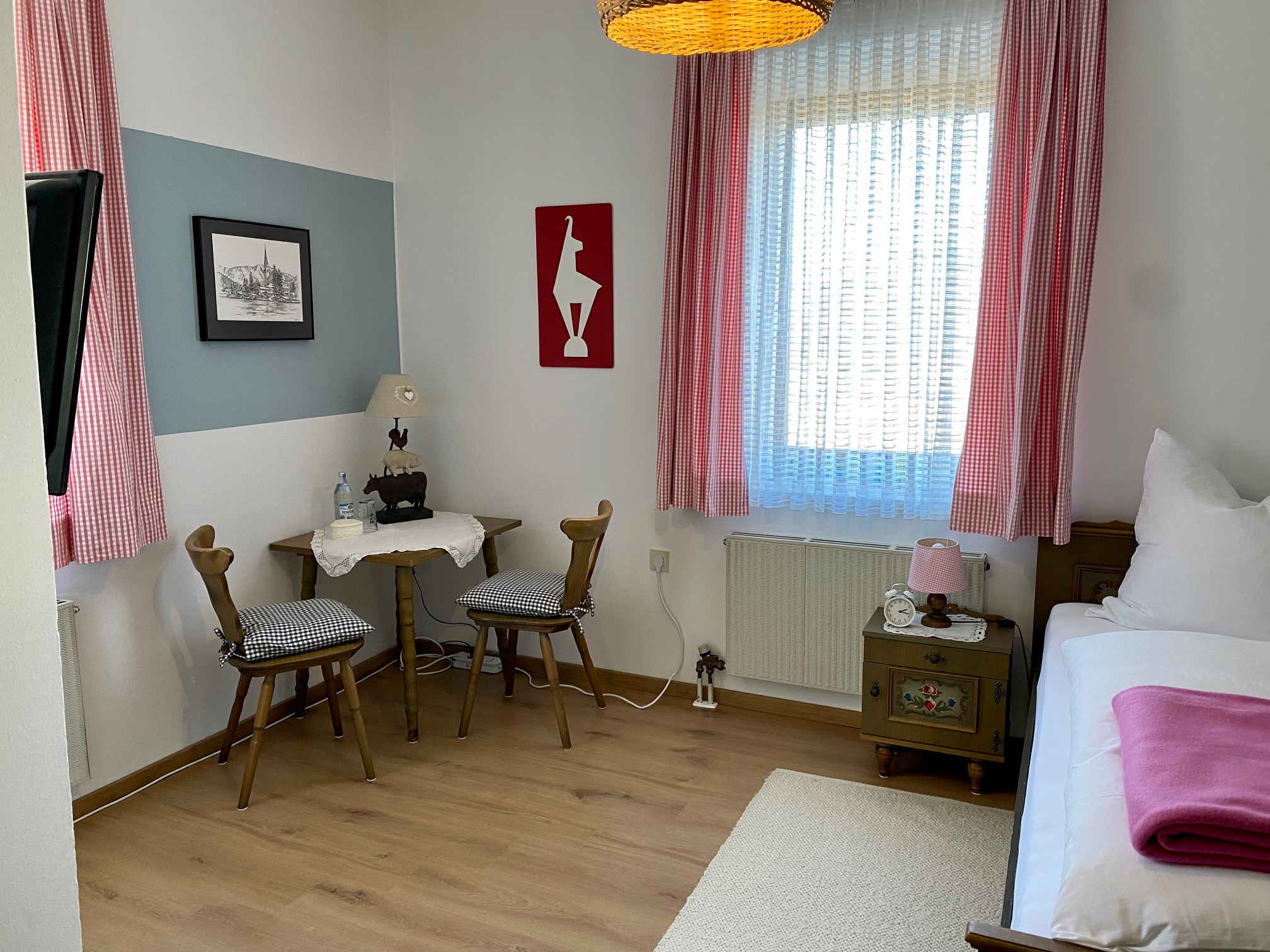 Schöne, gepflegte, geräumige 90m² große 3 Zimmer Ferienwohnung im bayerischen Stil im 1. OG. 3 Balkone mit Sitzgelegenheiten, 2 Schlafzimmer mit je einem Bad / Dusche / WC. 1 Schlafzimmer mit Doppelbett und das 2te Schlafzimmer mit Einzelbett (Zustellbett und ein Baby-Gitterbett ist möglich). In jedem Zimmer befindet sich ein Flachbild TV. Das Wohnzimmer ist mit einer bayerischen Essecke ausgestattet. Die moderne Küche verfügt über einen Geschirrspüler, Backofen, Ceranfeld, Kühlschrank mit Gefrierfach. In der Diele befindet sich ein Garderobenschrank, es gibt einen Abstellraum und kostenloses WLAN. Im Haus befindet sich eine Damenboutique.