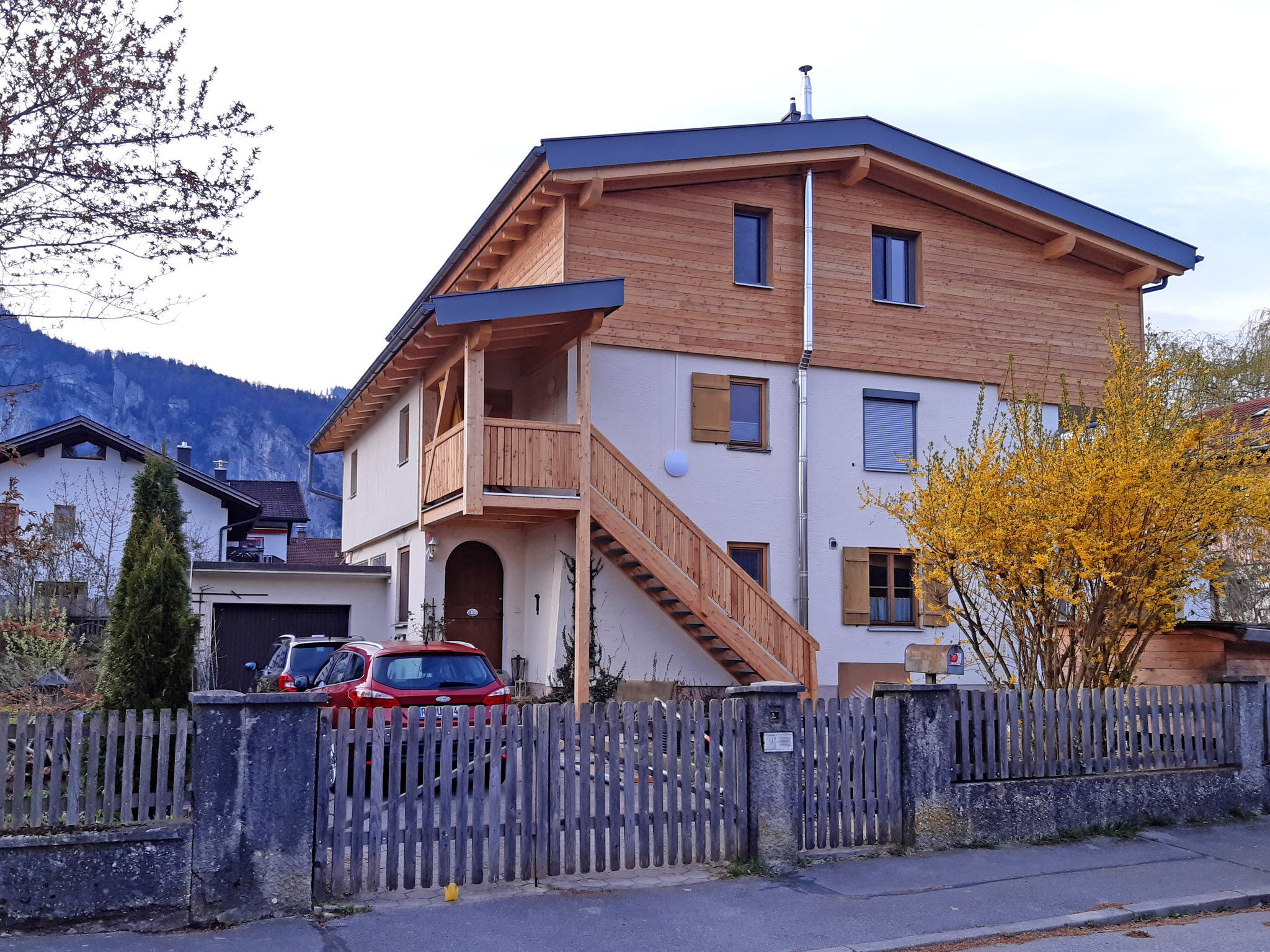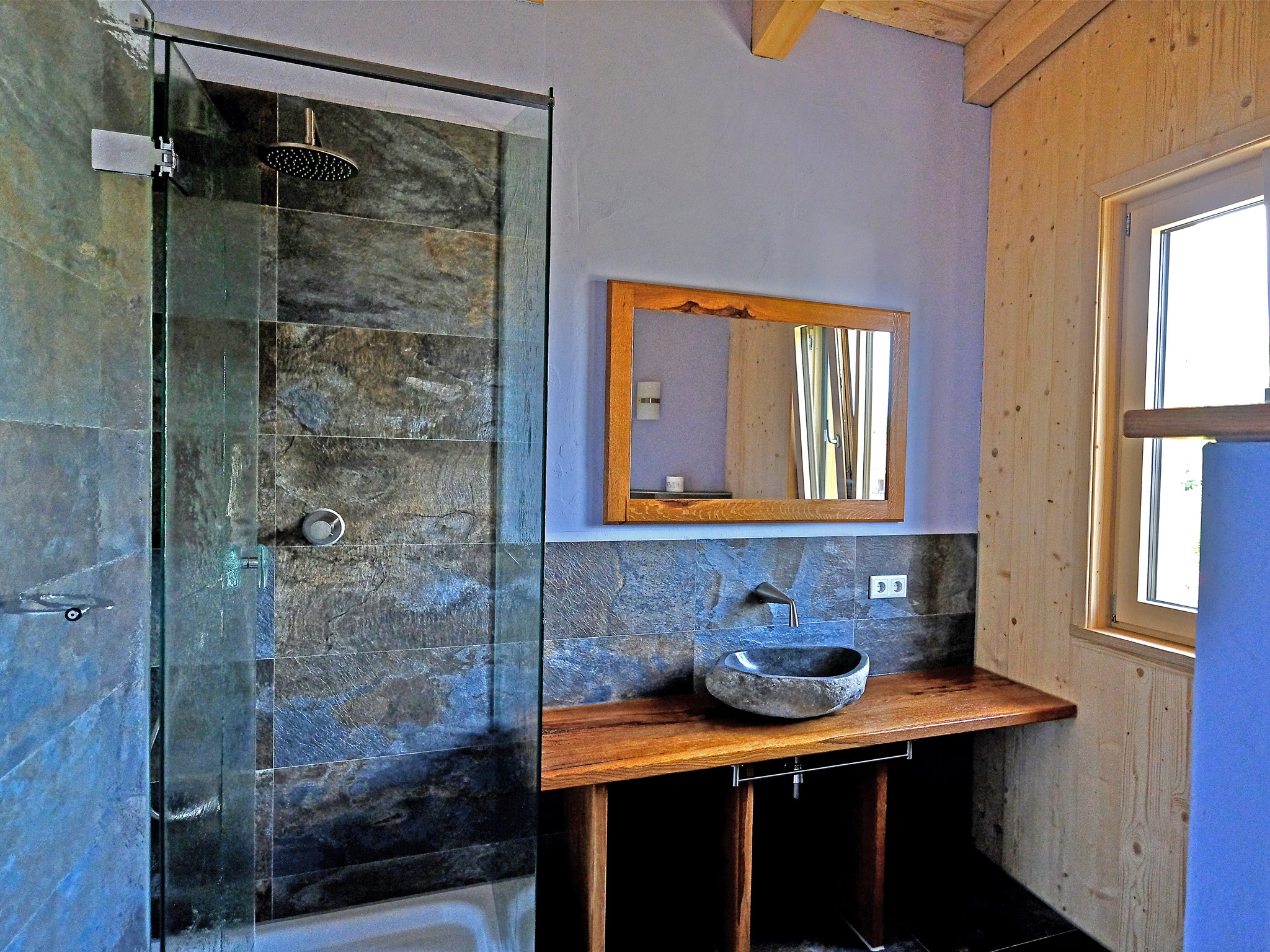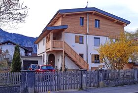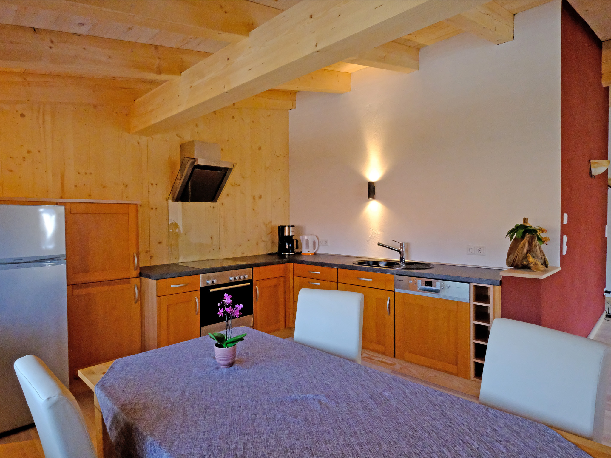 Die hochwertige, moderne Ferienwohnung (ca. 95qm) für 4 Personen wurde als ökologischer Holzbau 2021 fertiggestellt. Sie befindet sich im 2. Stock des Hauses in ruhiger Nebenstraße, eingebettet in eine Wohnsiedlung. Das im Wohnbereich integrierte, auskragende Panorama-Fester und der großzügige Balkon bestechen durch den herrlichen Blick auf die umliegenden Berggipfel des Kaisergebirges mit seinen Ausläufern. In dem offenen Essbereich mit Vollholzküche besteht für unsere Gäste die Möglichkeit die Gerichte der Region zu kreieren. Die vollausgestattete Küche, mit Kühlschrank, großzügigem Gefrierfach, Geschirrspülmaschine, Backofen, Ceranfeld, Toaster, Wasserkocher und einer Kaffeemaschine unterstützt Sie dabei vollumfänglich. Der gesamte Wohn- Essbereich sowie die beiden Schlafzimmer sind mit biologisch geölten Vollholzdielenböden sowie Vollholzmöbilierung ausgestattet und verfügen über eine, je Raum, regelbare Wandheizung unter biologischen Lehmputzen. Die Wohnung besticht durch die verwendeten Baustoffe mit einem aussergewöhnlichem Raumklima, im Sommer wie im Winter. Die sommerliche Frische erhalten Sie durch moderne Außenraffstores und optimierte Außendämmung. Die Wohnung bietet 2 moderne Schlafzimmer, eines mit Vollholz-Doppelbett, sowie ein weiteres mit Schlafcouch. Das komfortable Bad ist mit Fenster, Fußbodenheizung, Duschkabine aus Kunstglas und einem WC ausgestattet. Das separate Gäste-WC verfügt über eine automatische Raumlüftungsanlage.
