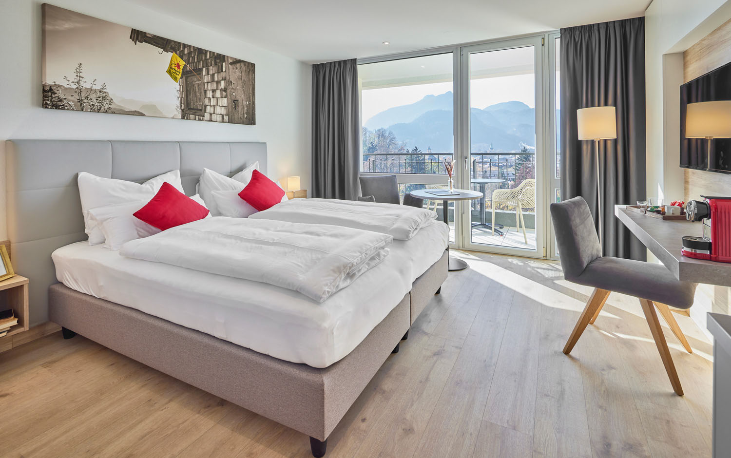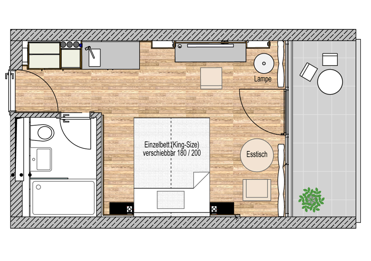 Kategorie Medium, Größe: ca. 22 m², Wohn- und Schlafbereich mit Doppelbett, Kochnische. Badezimmer mit Dusche, Balkon mit Alpen-, Garten- oder Stadtblick. Unsere Apartments sind alle mit Heiz-und Kühlanlage, WIFI, Smart TV, 17 Zoll Zimmersafe, leistungsstarker Haartrockner und Segafredo Kaffeemaschine ausgestattet.Toaster, Wasserkocher, Wäscheständer, Bügelbrett und Bügeleisen werden nur auf Nachfrage ausgehändigt. Waschmaschine und Trockner stehen Ihnen in der 1 und 2 Etage gegen Gebühr zur Verfügung.