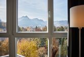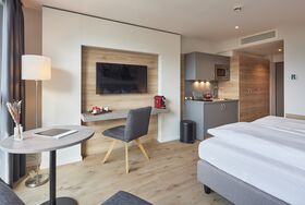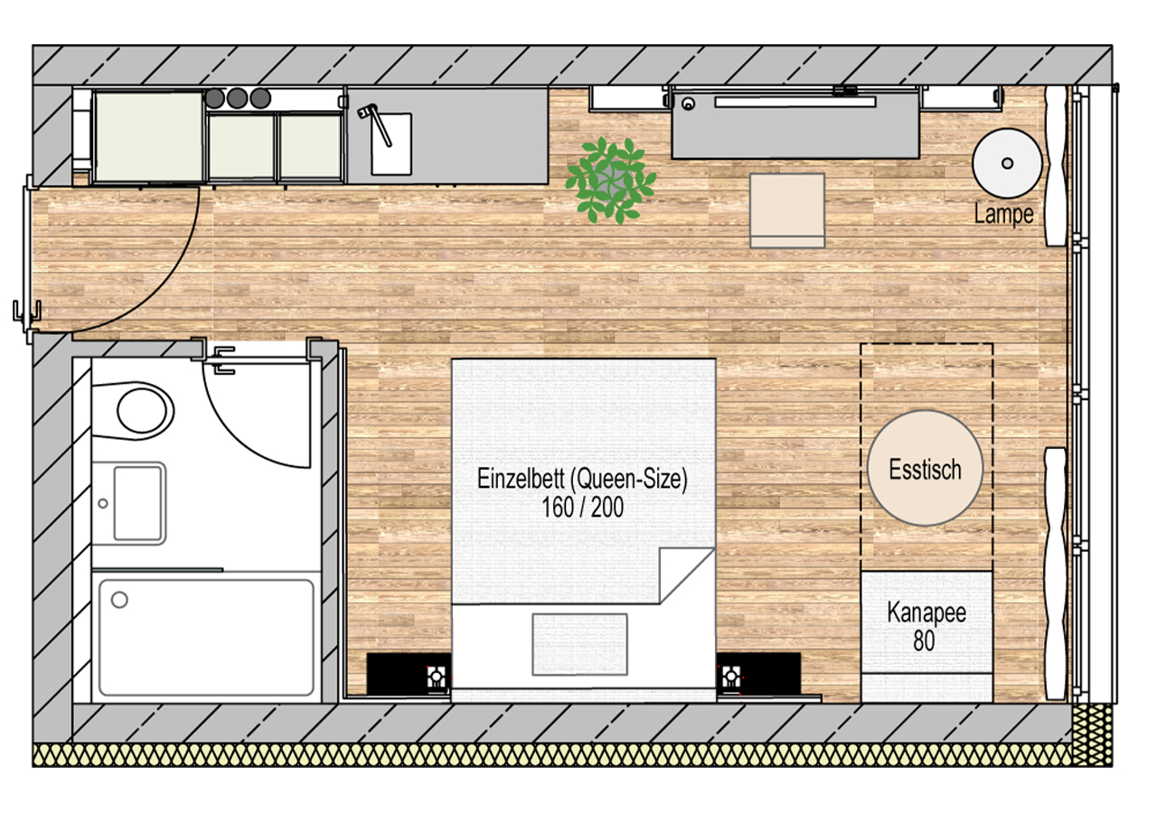 Kategorie Medium Plus, Größe: ca. 23,5 m², Wohn- und Schlafbereich mit Doppelbett und zusätzlichem separatem Kanapee als Zusatzbett für 1 Person, Kochnische, Badezimmer mit Dusche, Panorama mit Alpen-, Garten- oder Stadtblick. Unsere Apartments sind alle mit Heiz-und Kühlanlage, WIFI, Smart TV, 17 Zoll Zimmersafe, leistungsstarker Haartrockner und Segafredo Kaffeemaschine ausgestattet. Toaster, Wasserkocher, Wäscheständer, Bügelbrett und Bügeleisen werden nur auf Nachfrage ausgehändigt. Waschmaschine und Trockner stehen Ihnen in der 1 und 2 Etage gegen Gebühr zur Verfügung.
