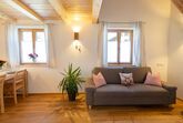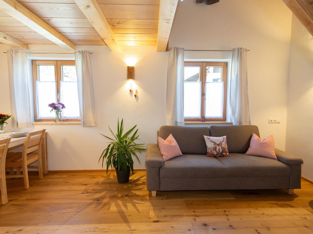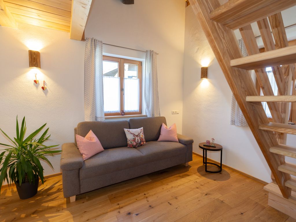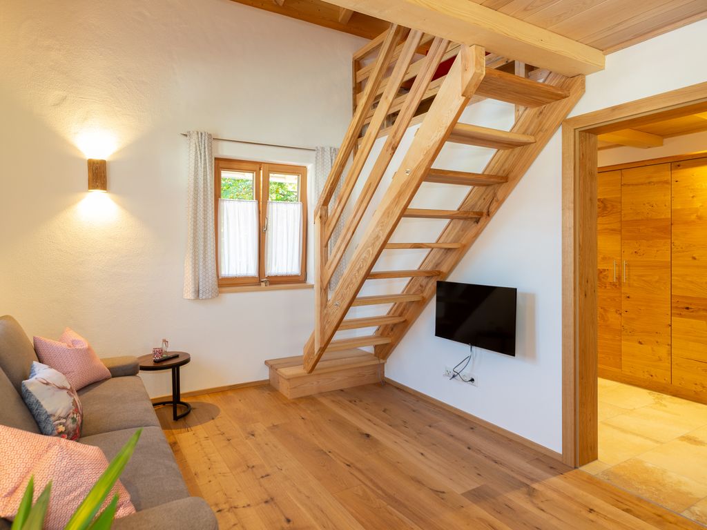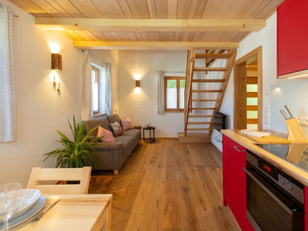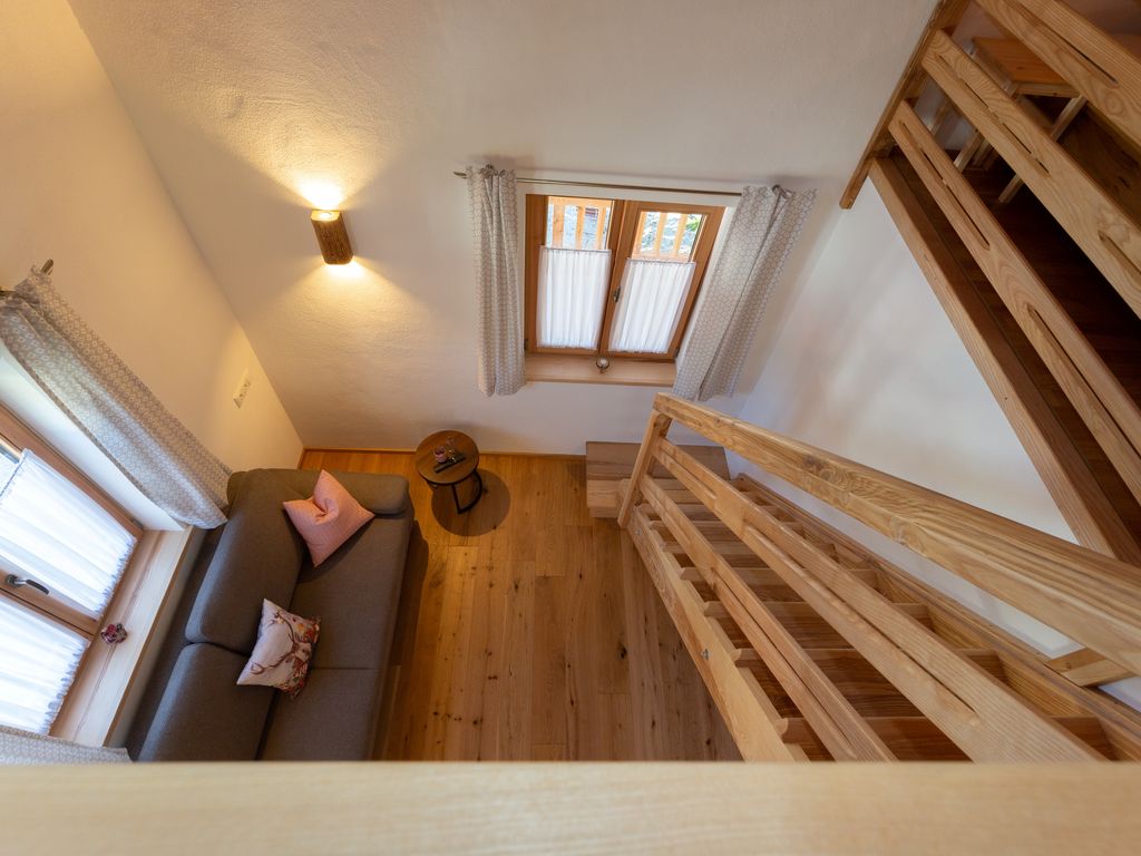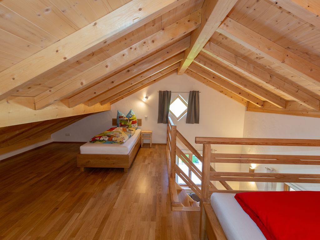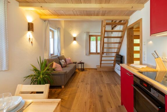 Die Ferienwohnung Nußlberg liegt im 1. Stock mit eigenem Eingang und Balkon. Die Betten befinden sich auf einer Galerie, es gibt ein Einzelbett und 1 Doppelbett. Der Wohn- Essbereich verfügt über eine voll ausgestattete Küche. Kostenloses W-Lan ist vorhanden.