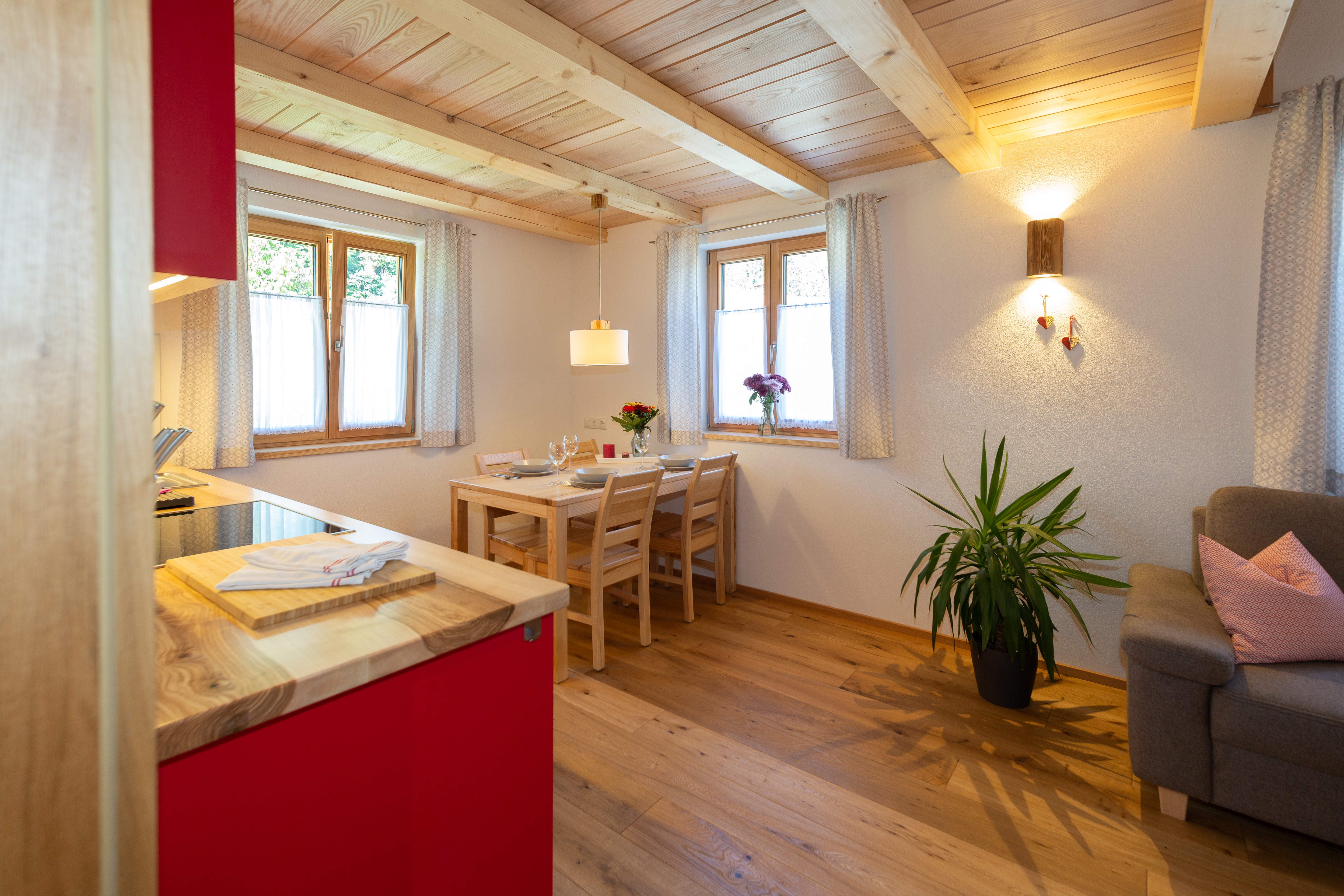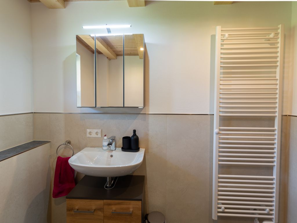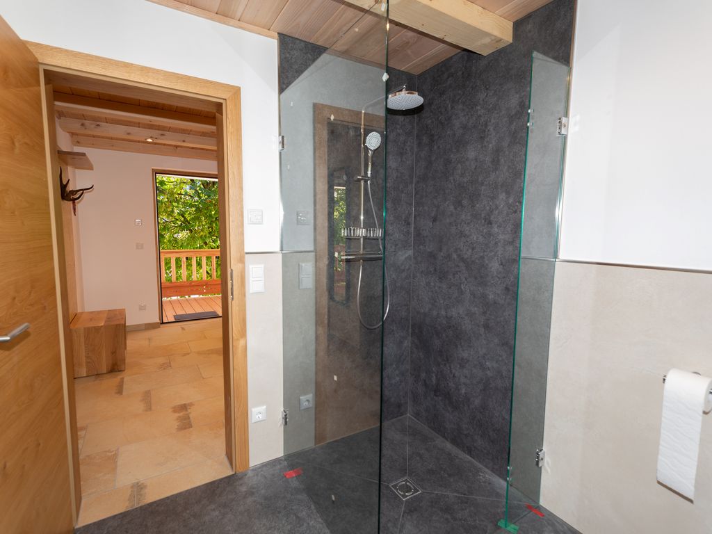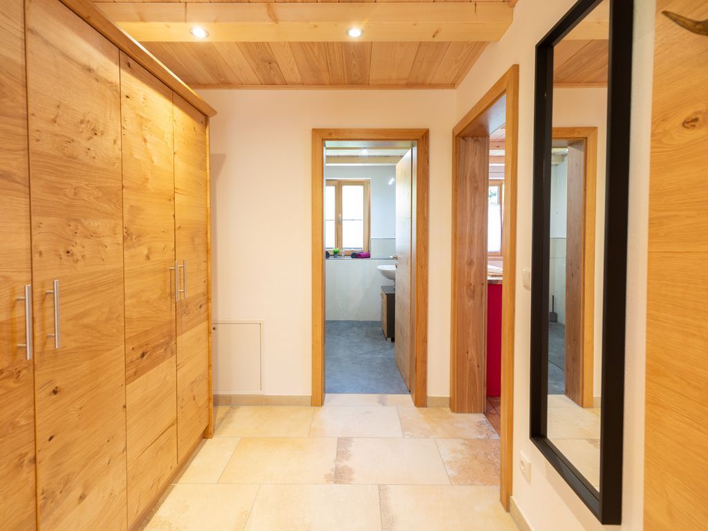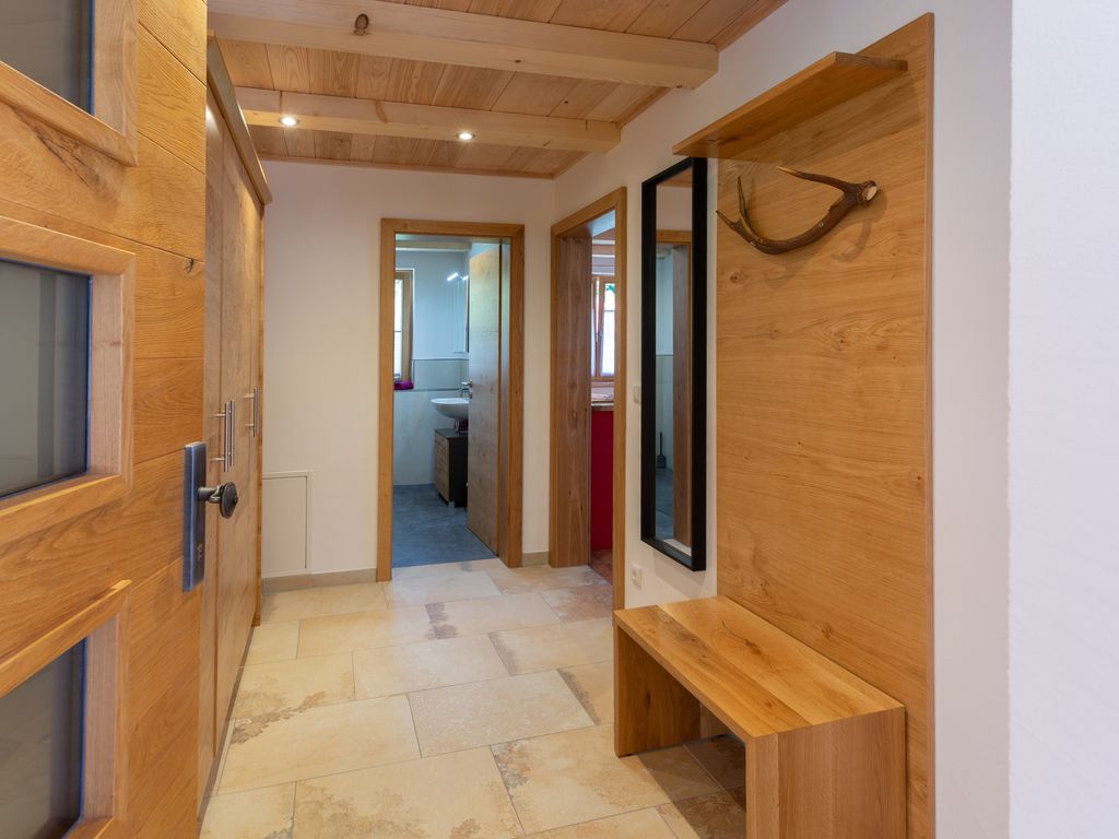 Unser neu erbautes Haus (Fertigstellung 2021) wurde ausschließlich aus Holz aus dem eigenen Wald erbaut. Im Erdgeschoß befindet sich eine Ferienwohnung mit einem Wohn- Esszimmer mit Kamin und zwei Schlafzimmer. Im 1. Obergeschoß gibt es zwei Ferienwohnungen mit jeweils einer Galerie zum schlafen. Das gesamte Gebäude wurde von Handwerkern aus der Region gebaut. Das Holz, aus eigener Forstwirtschaft, wurde direkt am Hof gesägt und zum trocknen gelagert. Die Möbel wurden ebenfalls aus eigenem Holz von regionalen Schreinern gefertigt, auch die Innenausstattungen stammen von regionalen Herstellern. Unser Ziel ist es dem Ausdruck Nachhaltigkeit ein Bild zu verleihen. Zusätzlich wird die Heiz- und Warmwasserenergie ausschließlich aus Sonne und Holz gewonnen.
