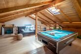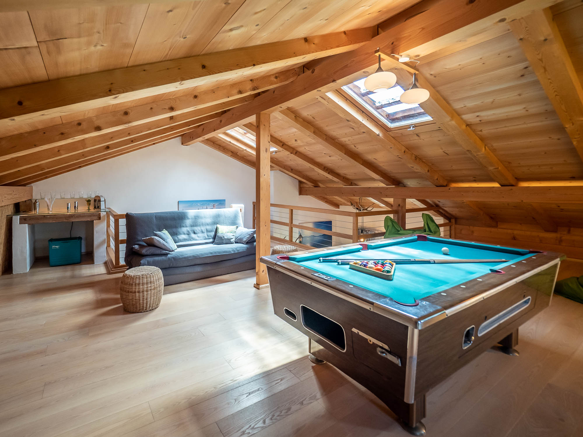 Im OG (18 qm mit Vollholzparkettboden) finden Sie in der Galerie eine hochwertige Schlafcouch für 2 Personen vor (Größe: 140 x 200 cm), ein Billardtisch, eine kleine Bar mit Getränkekühlschrank und die Lounge-Ecke mit extra Sofa und Radio sorgen für Abwechslung.