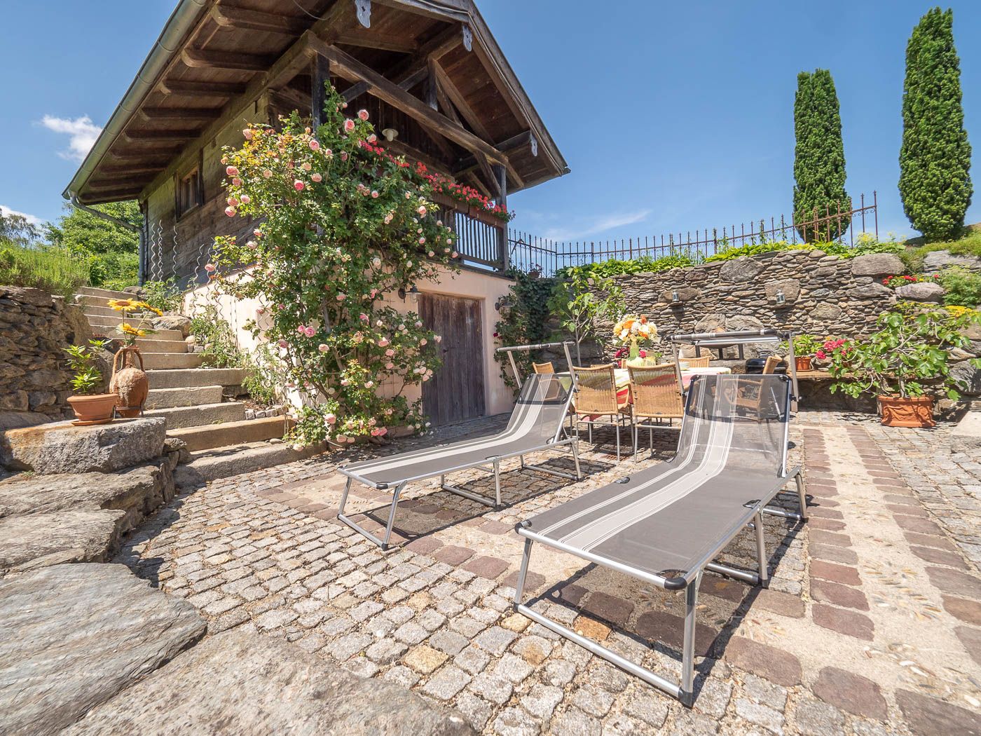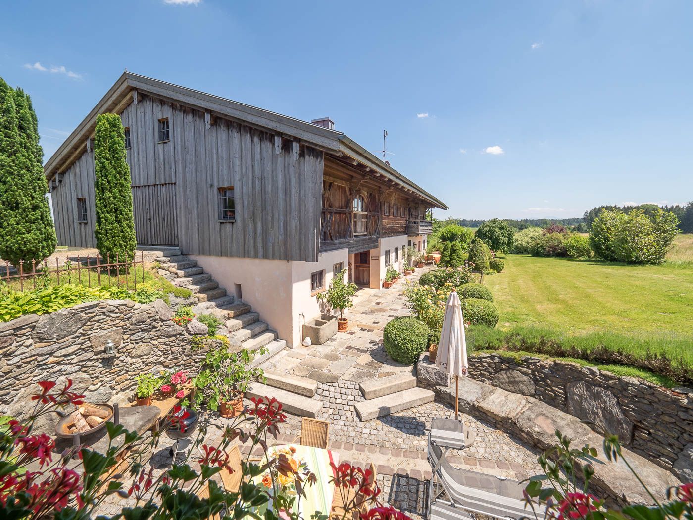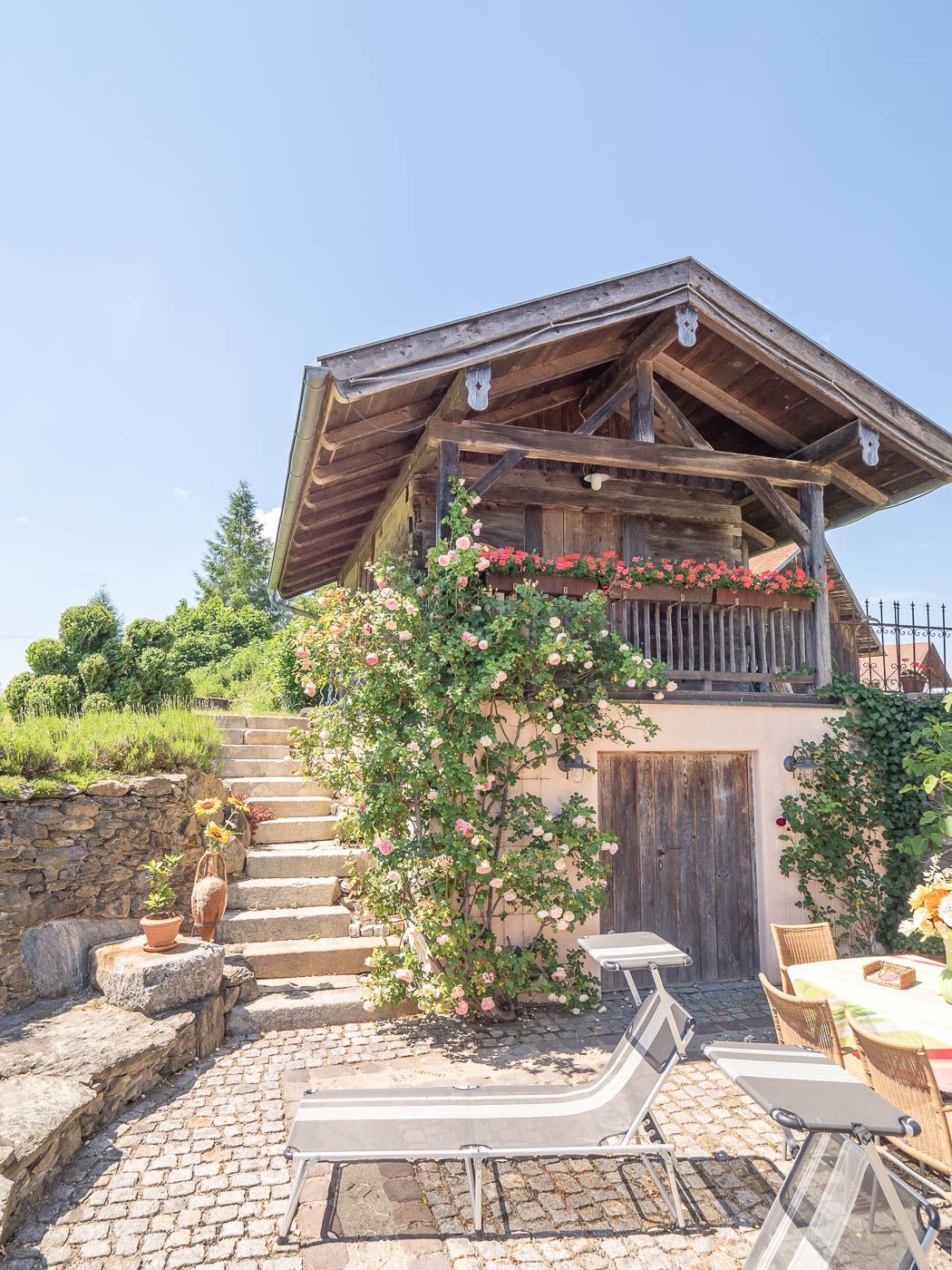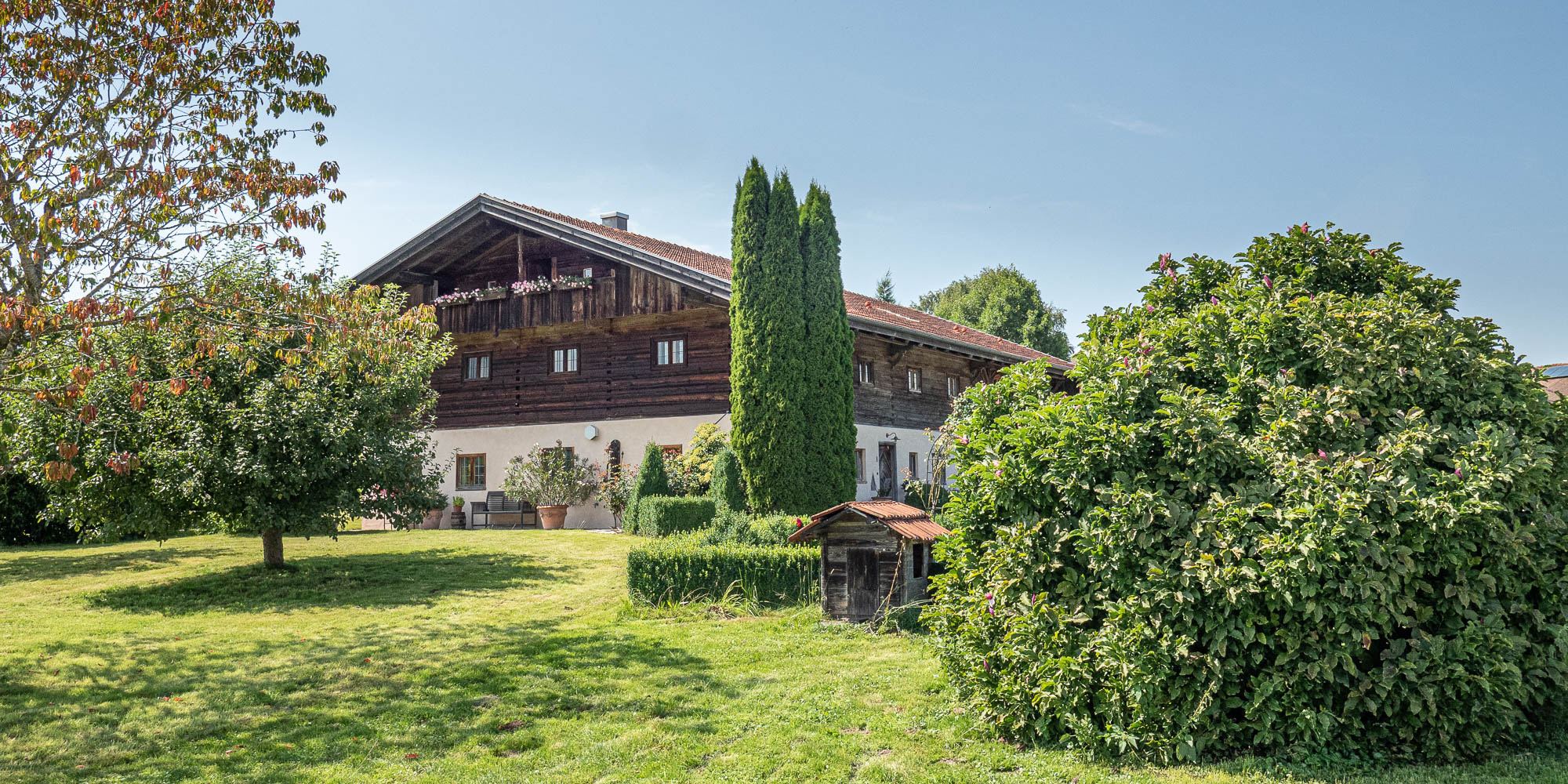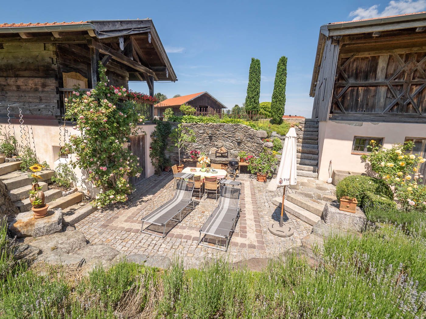 Der Außenbereich im Westteil unseres denkmalgeschützen Bauernhauses, mit möblierte Senkterrasse inmitten eines Gartens mit üppigem Pflanzenbewuchs und altem Baumbestand, Feuerschale, Holzkohlegrill, Sonnenliegen, Sonnenstühlen und Sonnenschirm - ist eine Oase zum Wohlfühlen.