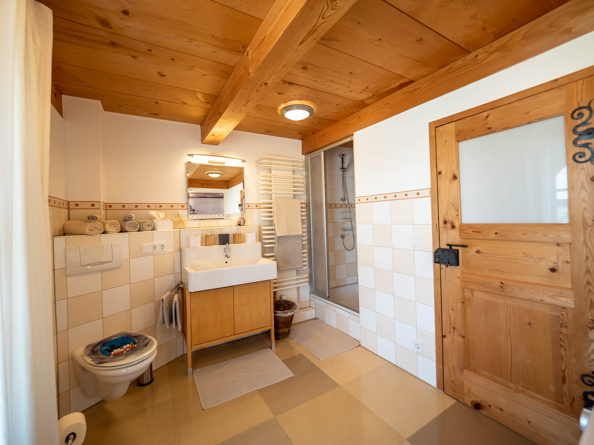 Das moderne Bad bietet neben Dusche und WC auch eine Waschmaschine und Trockner (kostenlos), sowie Waschpulver, einen Haarfön und Toilettenpapier. Im kleinen Abstellraum finden Sie diverse Putzutensilien, Staubsauger, Wäscheständer, Bügeleisen und Bügelbrett.