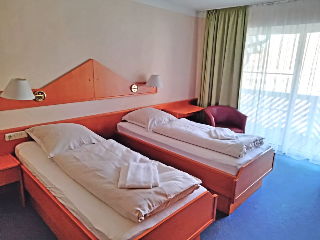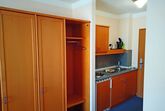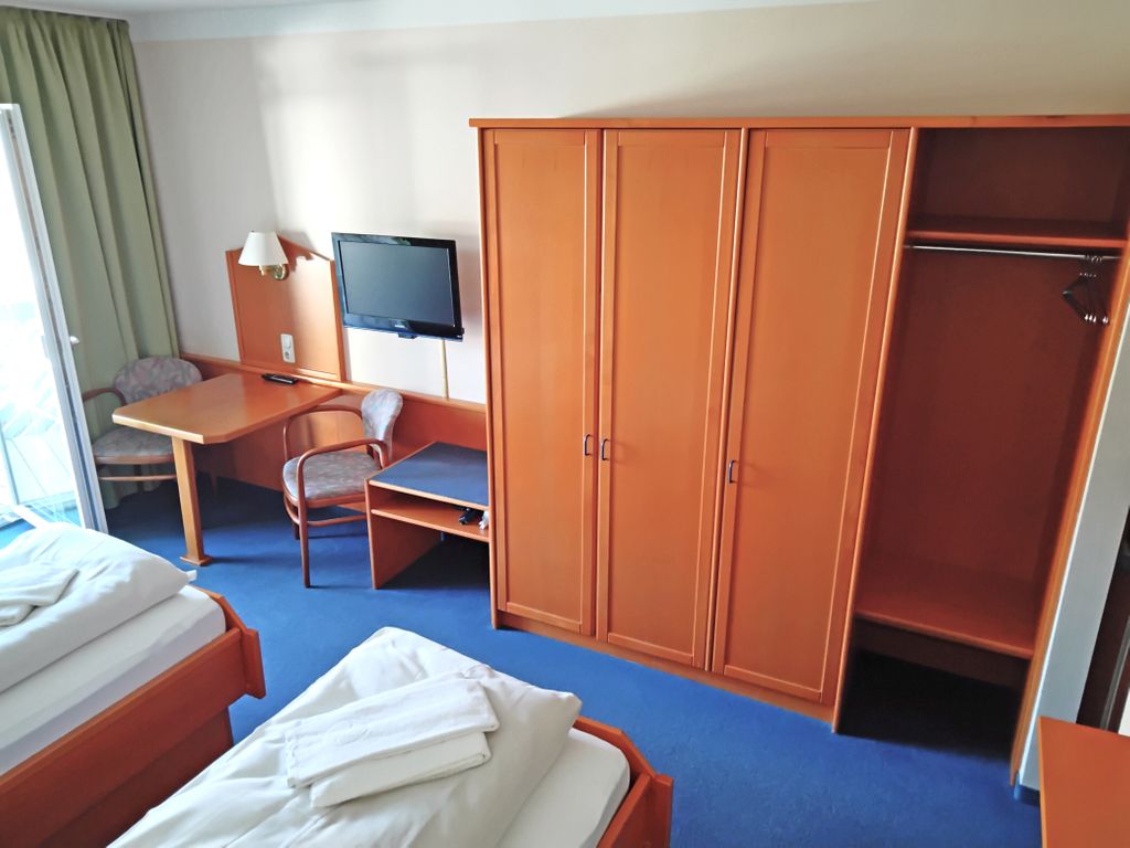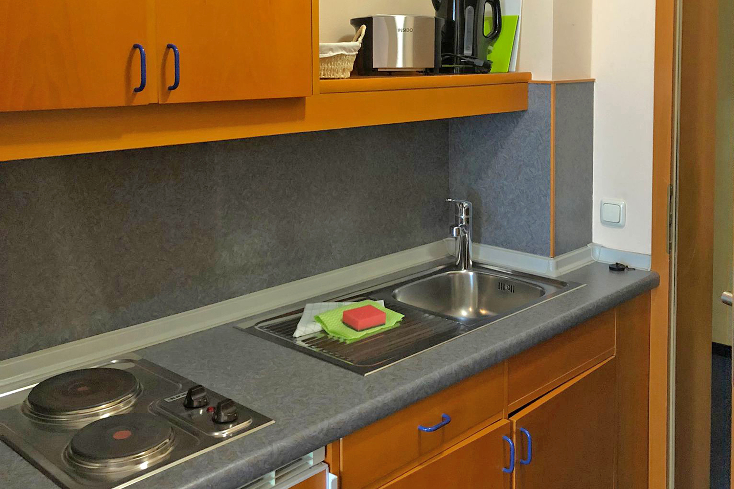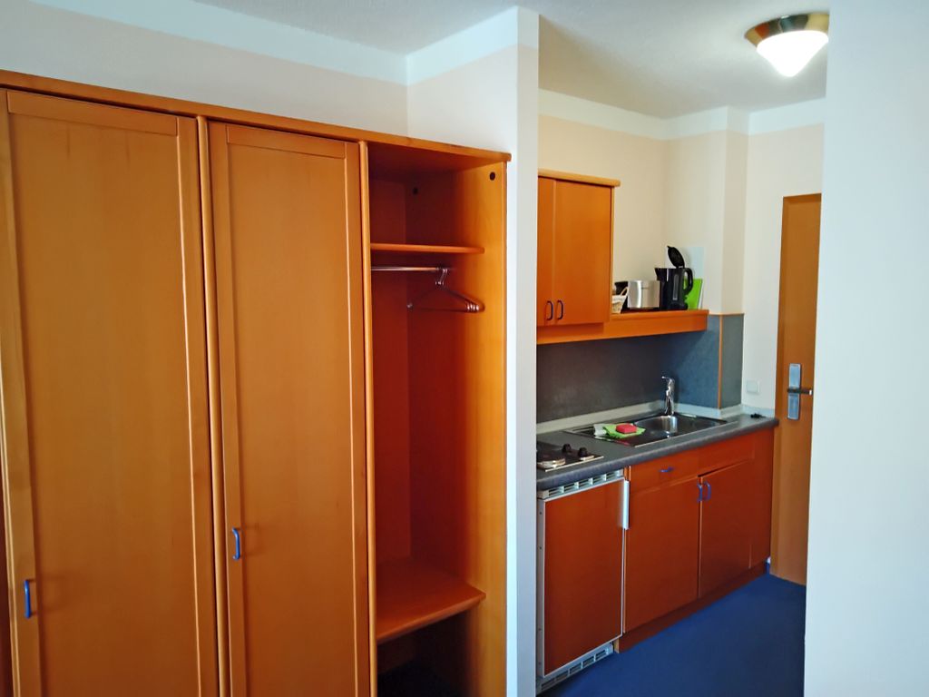 Helles Nichtraucher Appartement-Zimmer Nr. 220 mit 23 qm im 2. Stock und Balkon. Wohn-/Schlafzimmer mit zwei Einzelbetten, Sitzgelegenheit, kostenloses WLAN, Flat-Kabel-TV und Küchenzeile mit Kühlschrank, Kochgelegenheit mit 2-Platten, Mikrowelle, Kaffeemaschine, Toaster und Wasserkocher. Badezimmer mit Badewanne/Dusche, WC und Fön. Bedingt Barrierefrei, für Rollstuhlfahrer leider nicht möglich, mit Gehbehinderung durch Lift im Haus möglich. Keine Haustiere erlaubt.