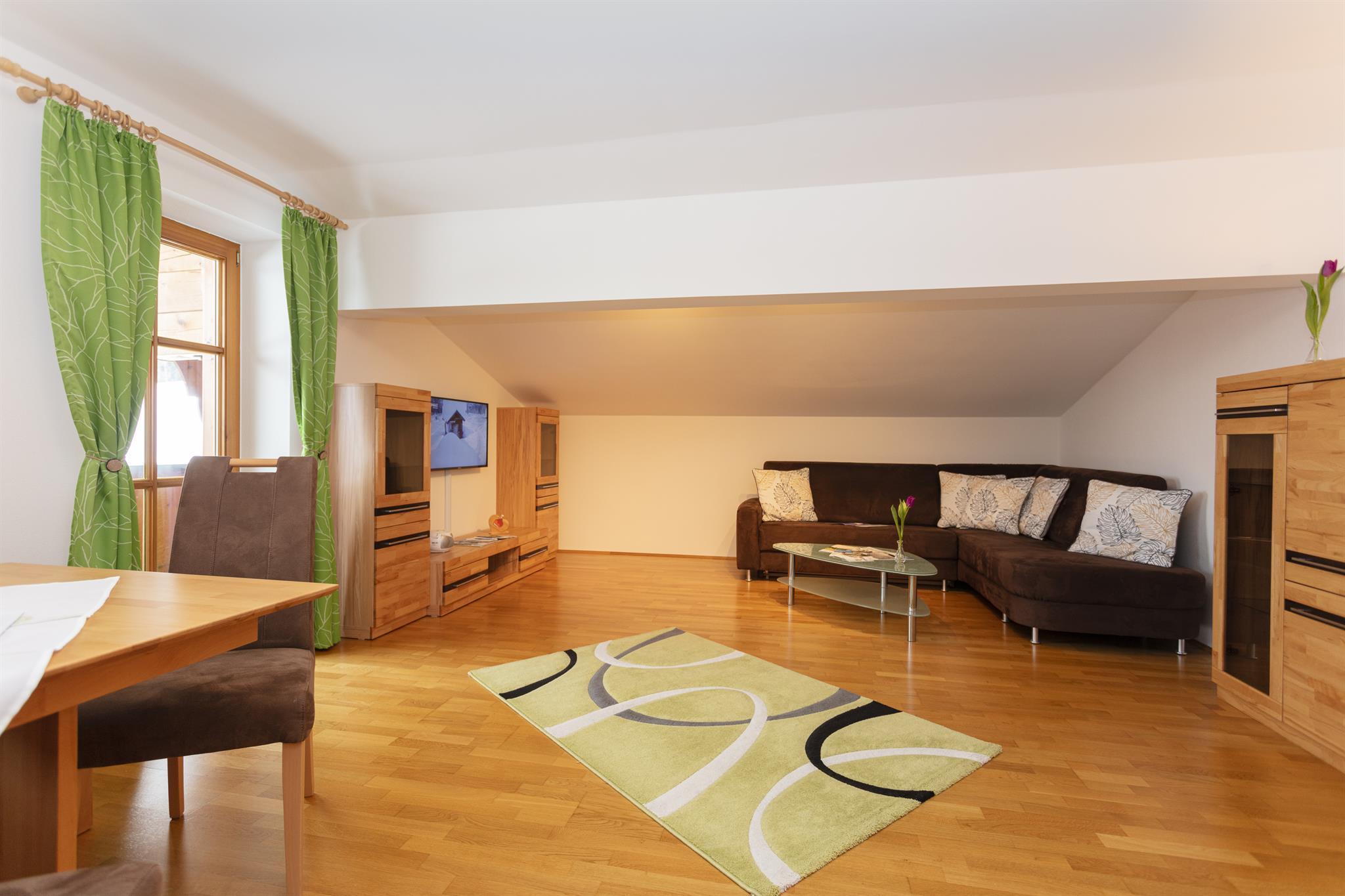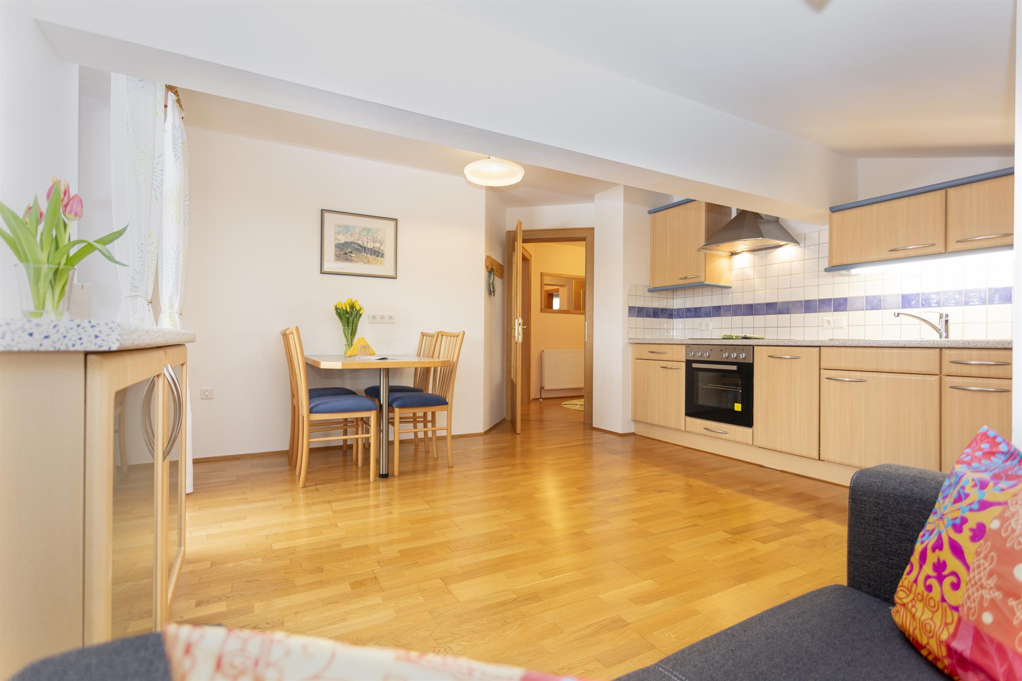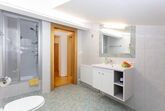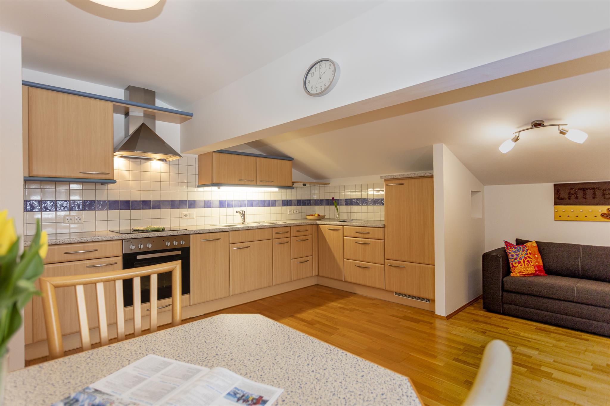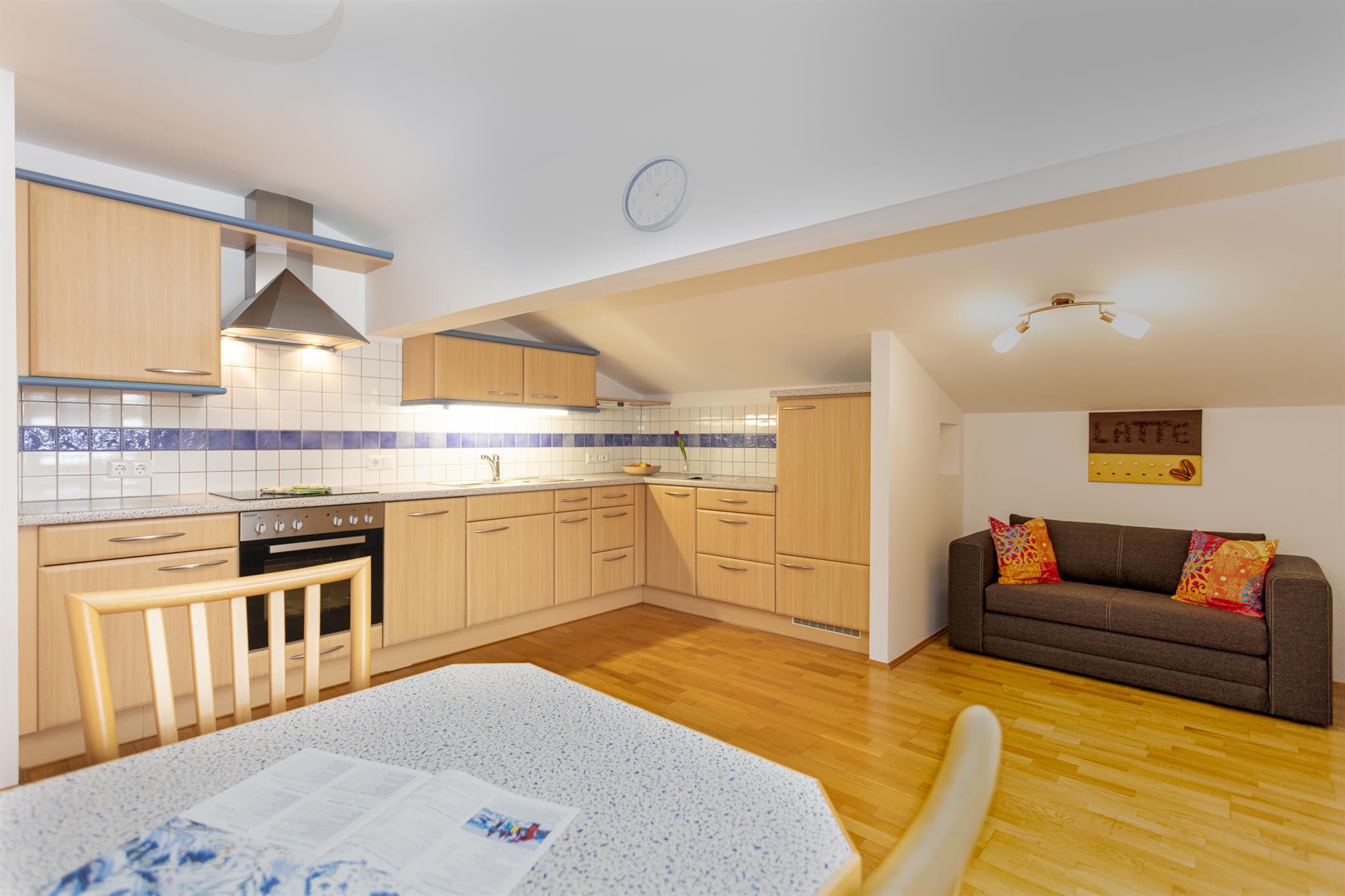 Große Ferienwohnung im 2. Stock für 1 bis 5 Per. mit 2 Schlafzimmer (ab 3 Per.) Küche mit Backrohr, Geschirrspüler und Kühlschrank, Wohnzimmer mit Essecke, Schlafmöglichkeit und SatTV, Bad mit Dusche/WC sowie Balkon mit Seeblick.