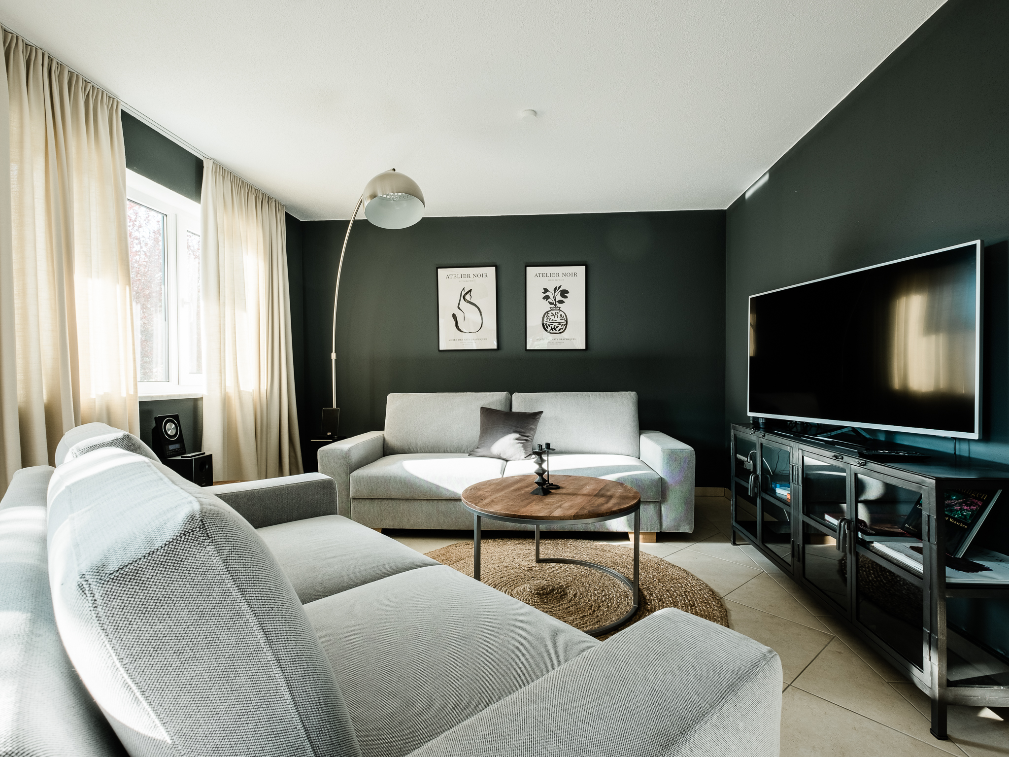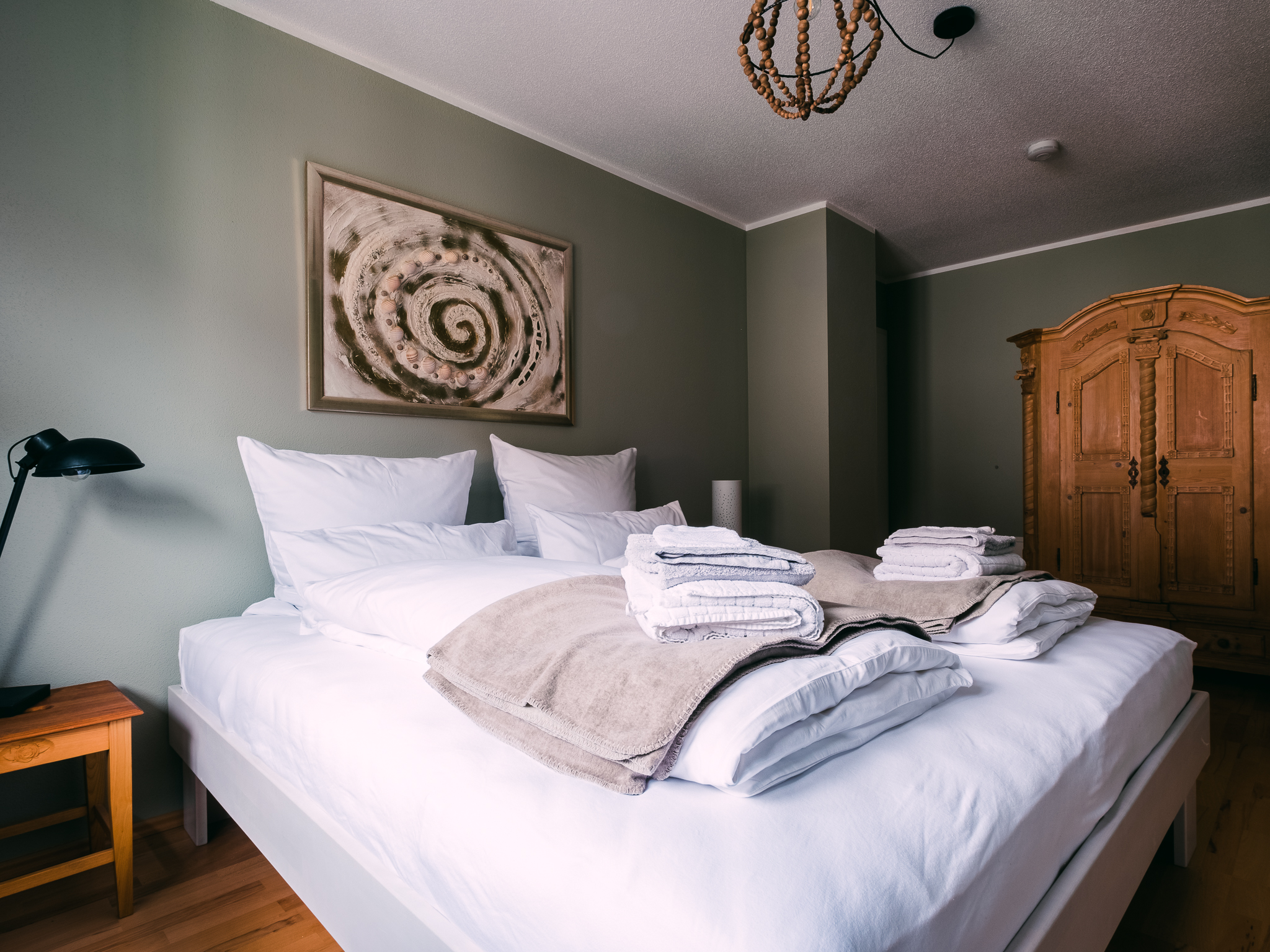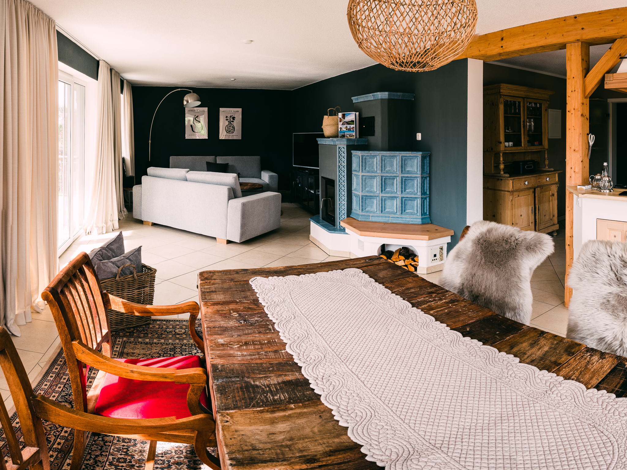 Neu renovierte, großzügige, sonnige und absolut ruhige Ferienwohnung mit 2 komfortablen Balkonen im 1ten Stockwerk. Garage und KFZ-Stellplatz.Auch im Winter gemütlich: Großer Wohn-/Essbereich mit Kachelofen(Feuerholz vorhanden) und Fußbodenheizung. Küche mit Vollausstattung. Großes Schlafzimmer mit Boxspringbett, 1 weiteres Schlafzimmer mit Doppelbett. Das Badezimmer ist mit Dusche und WC ausgestattet. Gäste WC, TV, WLAN, Waschmaschine