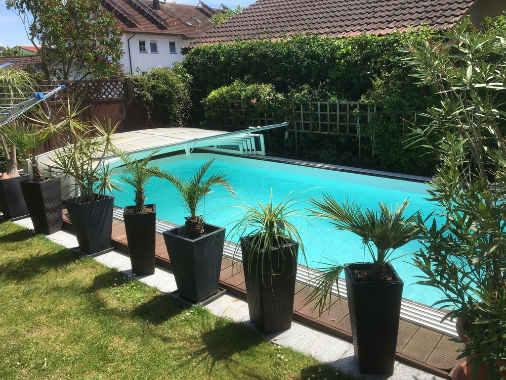 Unser Haus in der Edelweißstraße ist ein modernes Haus mit großem Garten und einem Swimmingpool, Sandkasten, Spielhaus, Schaukel usw. Geeignet für Feriengäste, Messegäste, Familie mit einem Kind usw.