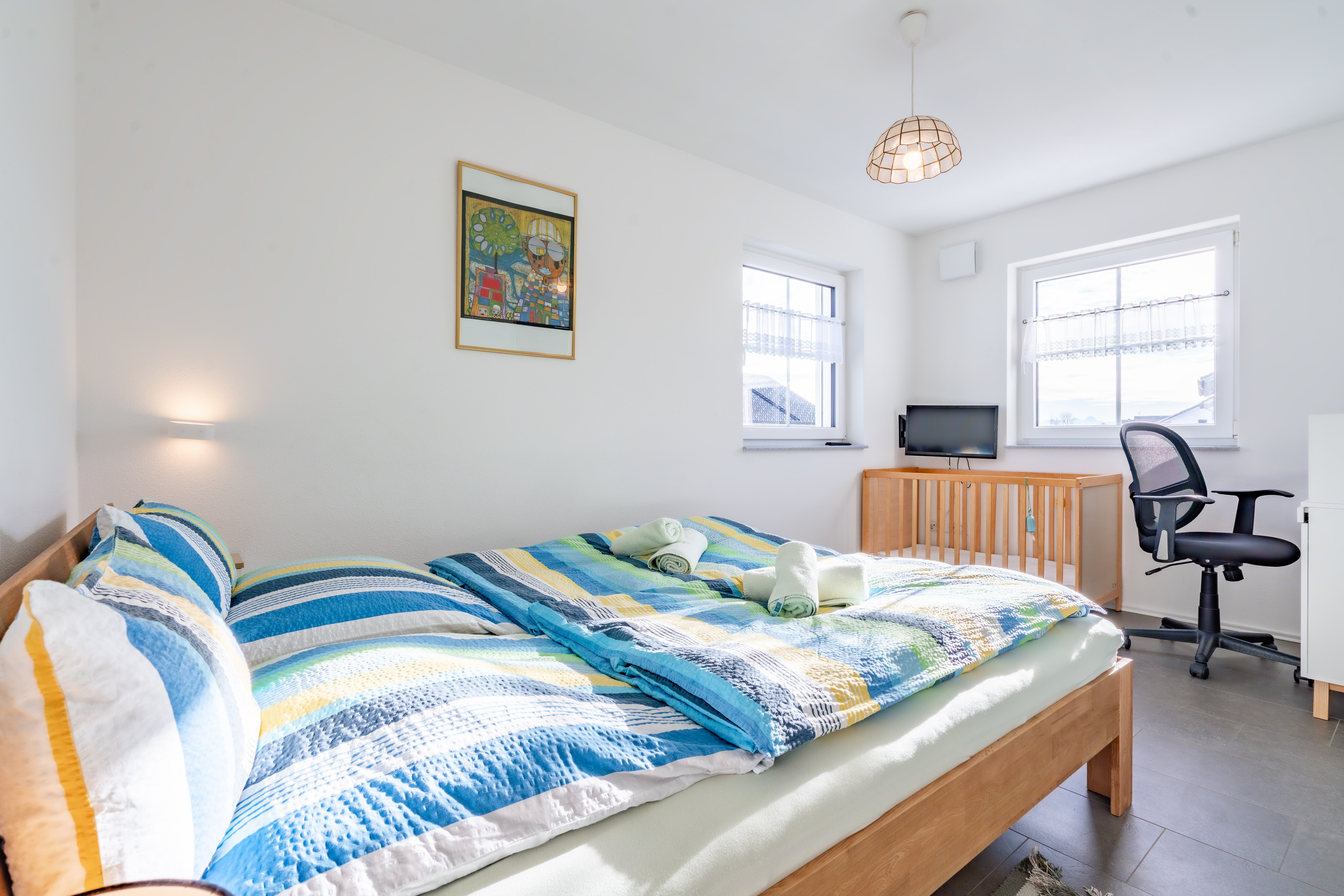 Unsere neue, voll ausgestattete, große, moderne Ferienwohnung befindet sich im ruhigen Neubaugebiet, im ersten Obergeschoss direkt in Pfaffing. Sie ist optimal für Feriengäste mit und ohne Kinder, Messegäste oder auch für Gäste, die sich für einen längeren Aufenthalt entscheiden. Sie hat eine Wohnfläche, inkl. Balkon von 108qm und ist bis zu 6 Personen bestens geeignet. Im neuen angelegten Garten gibt es Möglichkeiten zum Sonnen, Grillen, Spielen usw. WLAN ist kostenlos dabei. Herrlicher Blick auf den Wendelstein mit Alpenpanorama bei gutem Wetter. Ein wunderschöner Kinderspielplatz ist von unserem Haus nur 2 Minuten entfernt. Unser Swimmingpool ist per Auto in 2 Min. zu erreichen (zu Fuß in 5 Min.).