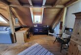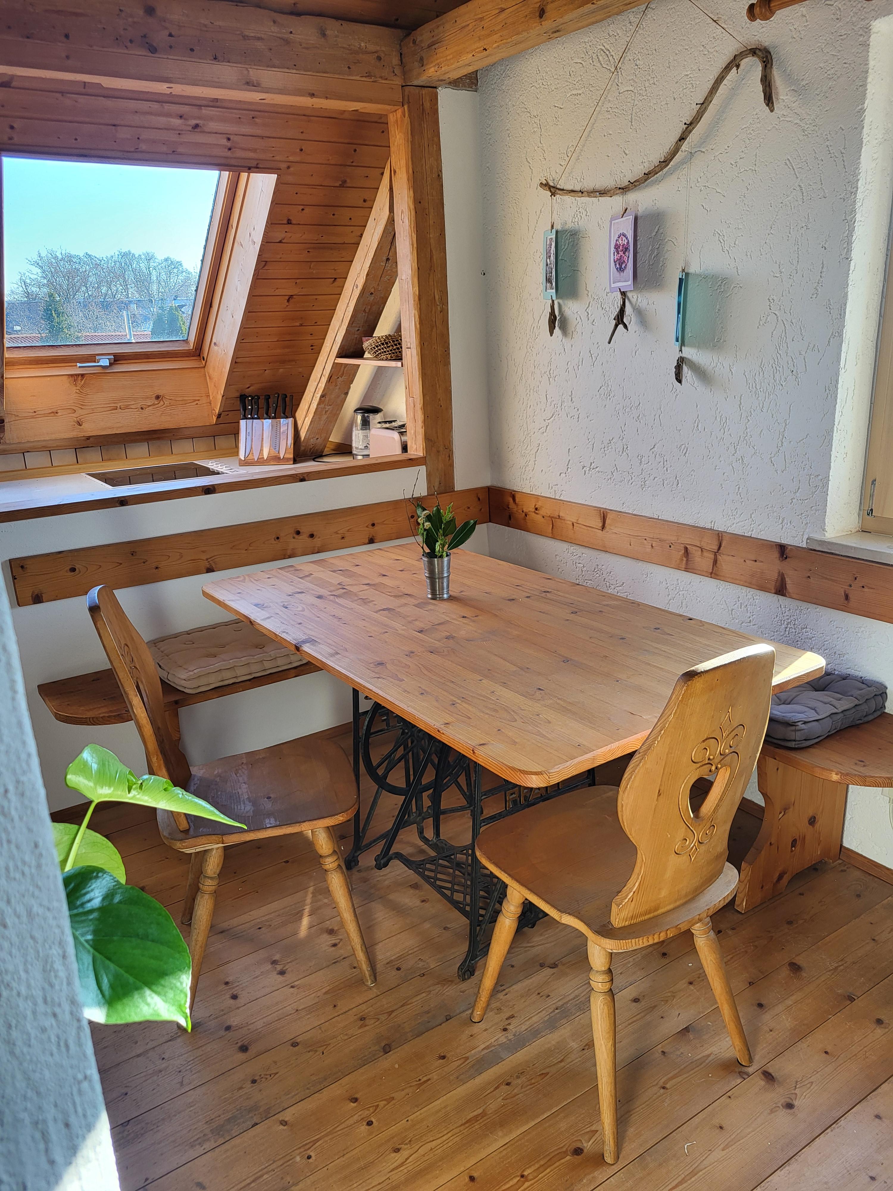 Unser gemütliches 40 qm Dachstudio hat eine komplett ausgestattete Küche, eine Essecke und eine Wohnsitzecke mit Kachelofen. Das Tageslichtbad ist ausgestattet mit einer Dusche/WC. Das Doppelbett liegt im oberen Mansardenbereich und ist über eine steile Treppe erreichbar. Bitte bei einer Buchung beachten. Inkl. Bettwäsche, Handtücher, kostenloses WLAN, TV und Gartenmitbenutzung. Kostenlose Liegestühle zum Sonnenbaden. Parkmöglichkeiten sind vor dem Haus an der Straße in unmittelbarer Nähe vorhanden. Be- und Entladen direkt am Haus ist selbstverständlich möglich. Ein kostenloses Babybett steht zur Verfügung.